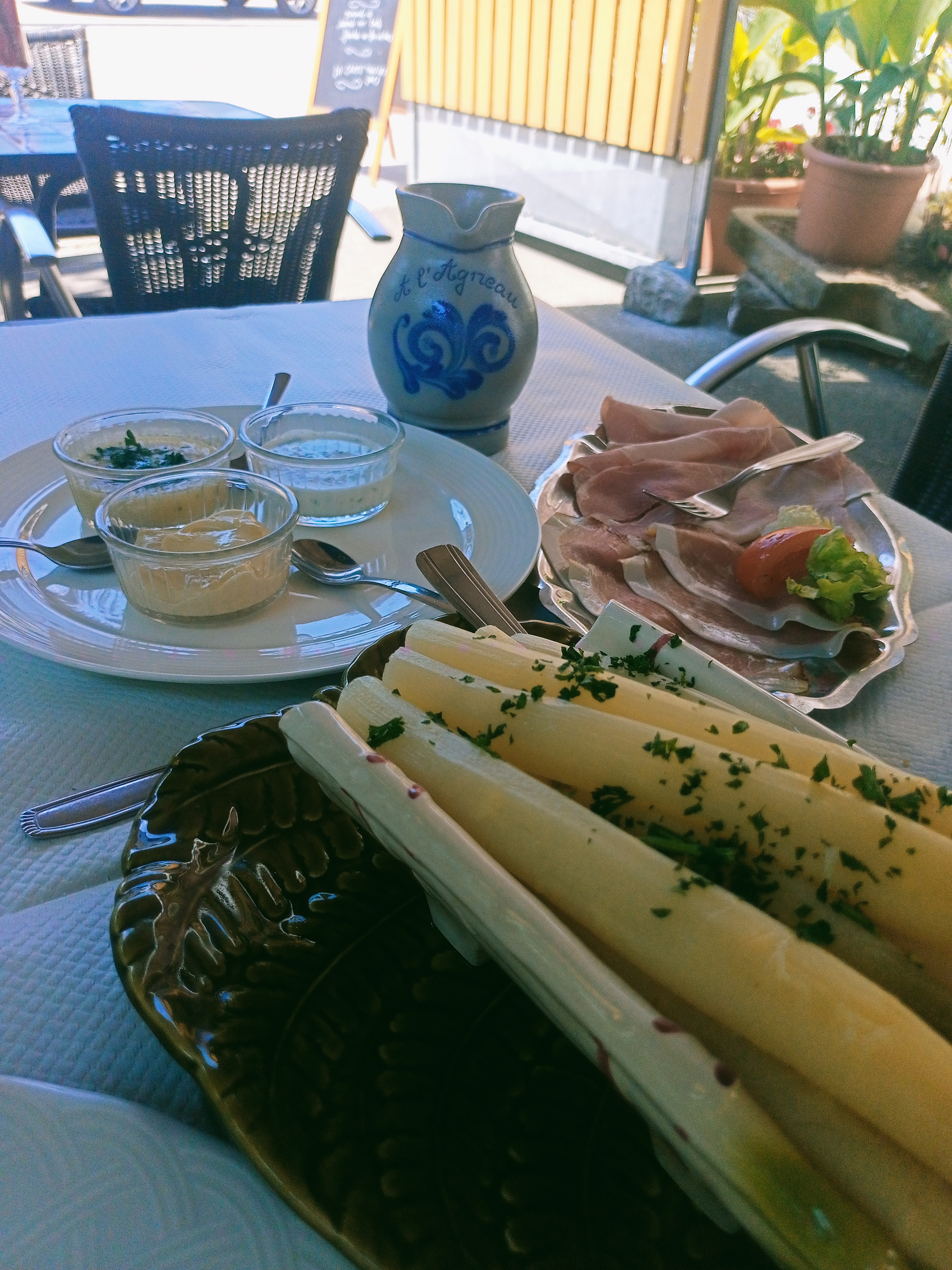 Menu asperges aux deux jambon et ses trois sauces.... Un délice a été niveau quantité je n ai pas pu finir et la patronne m a spontanément proposé de m'emballer le reste des asperges...