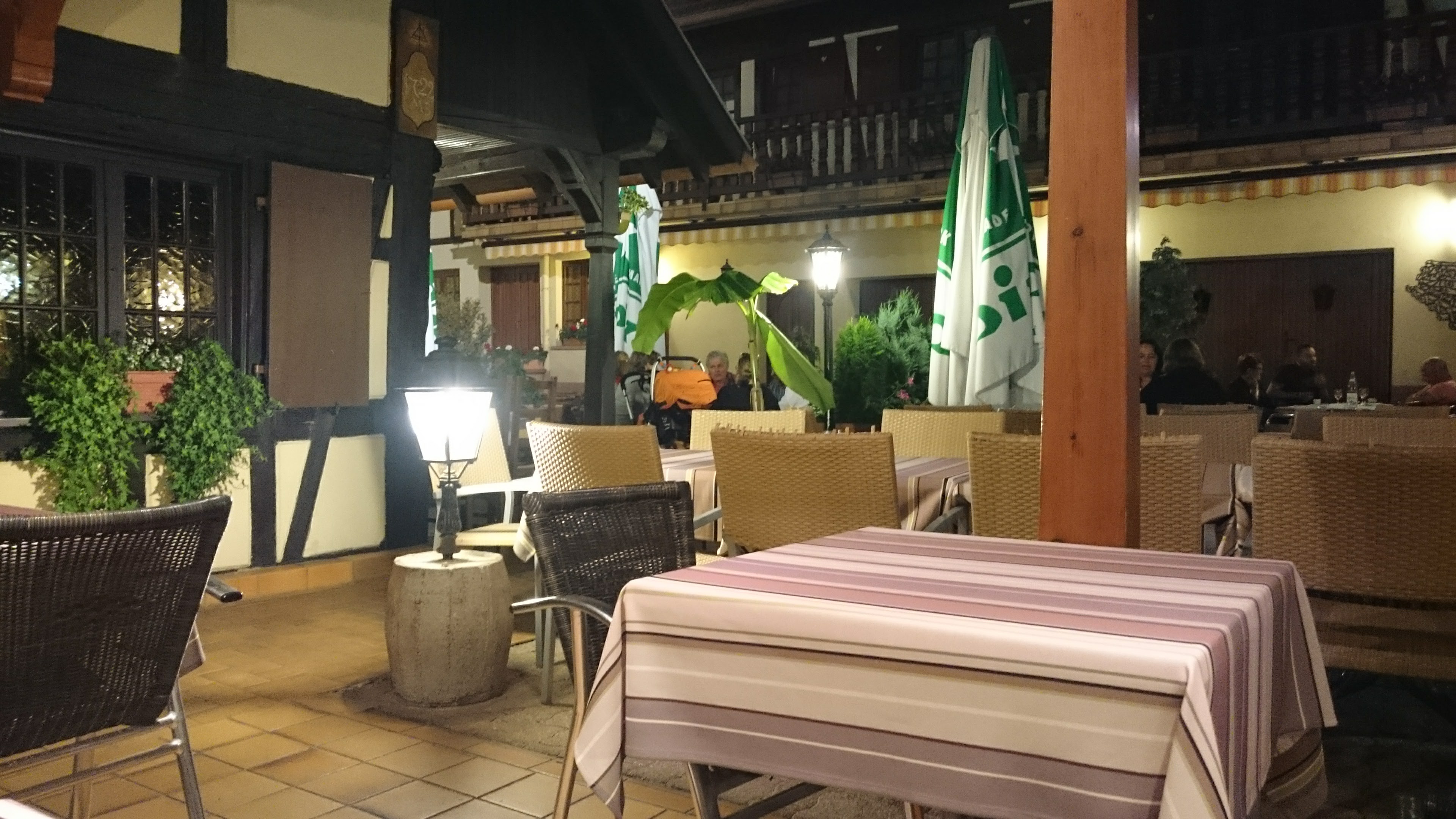 Grande terrasse avec décoration typique alsacienne. Le cordon bleu de veau est délicieux et la tarte maison à la rhubarbe meringuée également ! Nous avons passé une soirée très agréable grâce à l'équipe de service qui est aux petits soins !