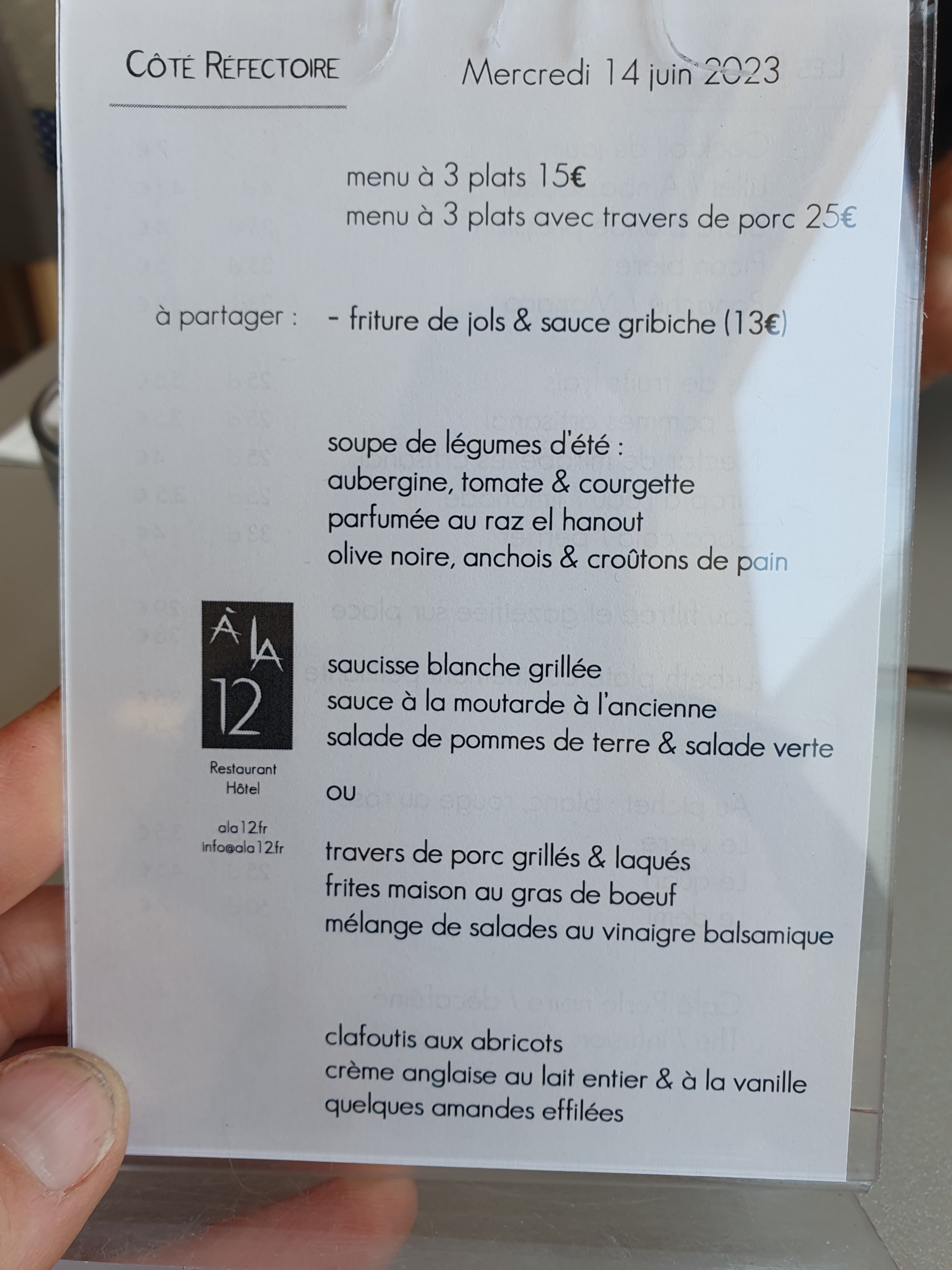 Il y a deux espaces, le restaurant - plus cher - et le Coté réfectoire, un restaurant aménagé un peu plus simplement. Il y a ici un menu déjeuner à trois plats du mercredi au vendredi pour un prix incroyable de 16.-. Nous avons eu une soupe de poireaux et pommes de terre, un filet de poulet braisé lentement avec un risotto et, en dessert, une île flottante - tout était excellemment préparé, bien sûr pas avec les ingrédients les plus chers pour le prix, mais de très bonne qualité. Ils proposent également un ou deux plats supplémentaires à partager : notre première entrée ici était la friture des jols à 13.-, avec des petits poissons de mer frits, avec une sauce gribiche - fantastique ! Cependant, à midi, la limite de la capacité de l'estomac était déjà atteinte... Il y avait des vins ouverts à des prix raisonnables et le service était extrêmement courtois et compétent, comme on peut s'y attendre dans un restaurant plus cher. Une prestation globalement réussie. D'ailleurs, vous pouvez bien sûr aussi dîner au restaurant le midi, qui est également ouvert. Le soir, le Coté réfectoire est fermé ou ouvert uniquement pour la clientèle entreprise pré-réservée.