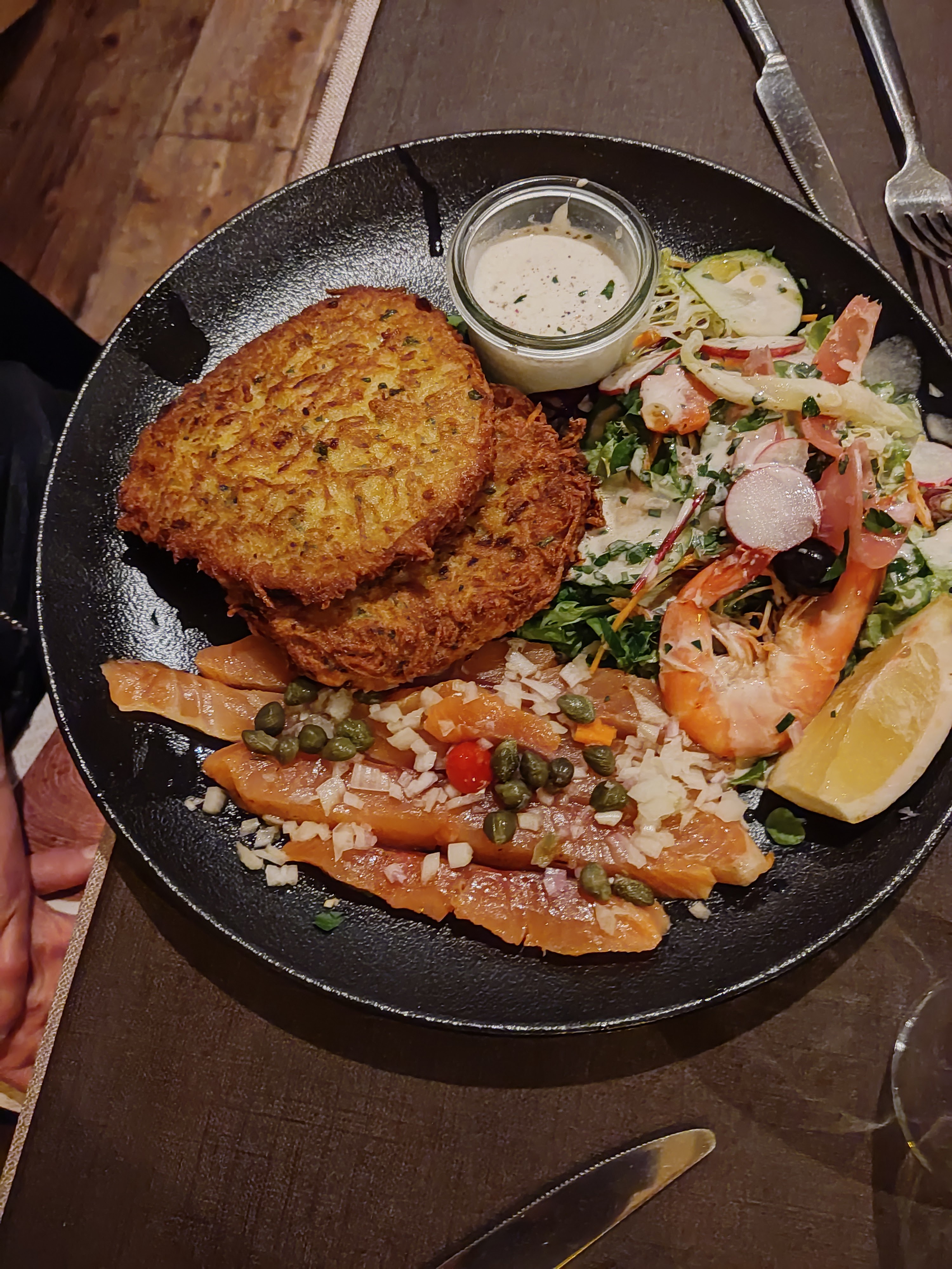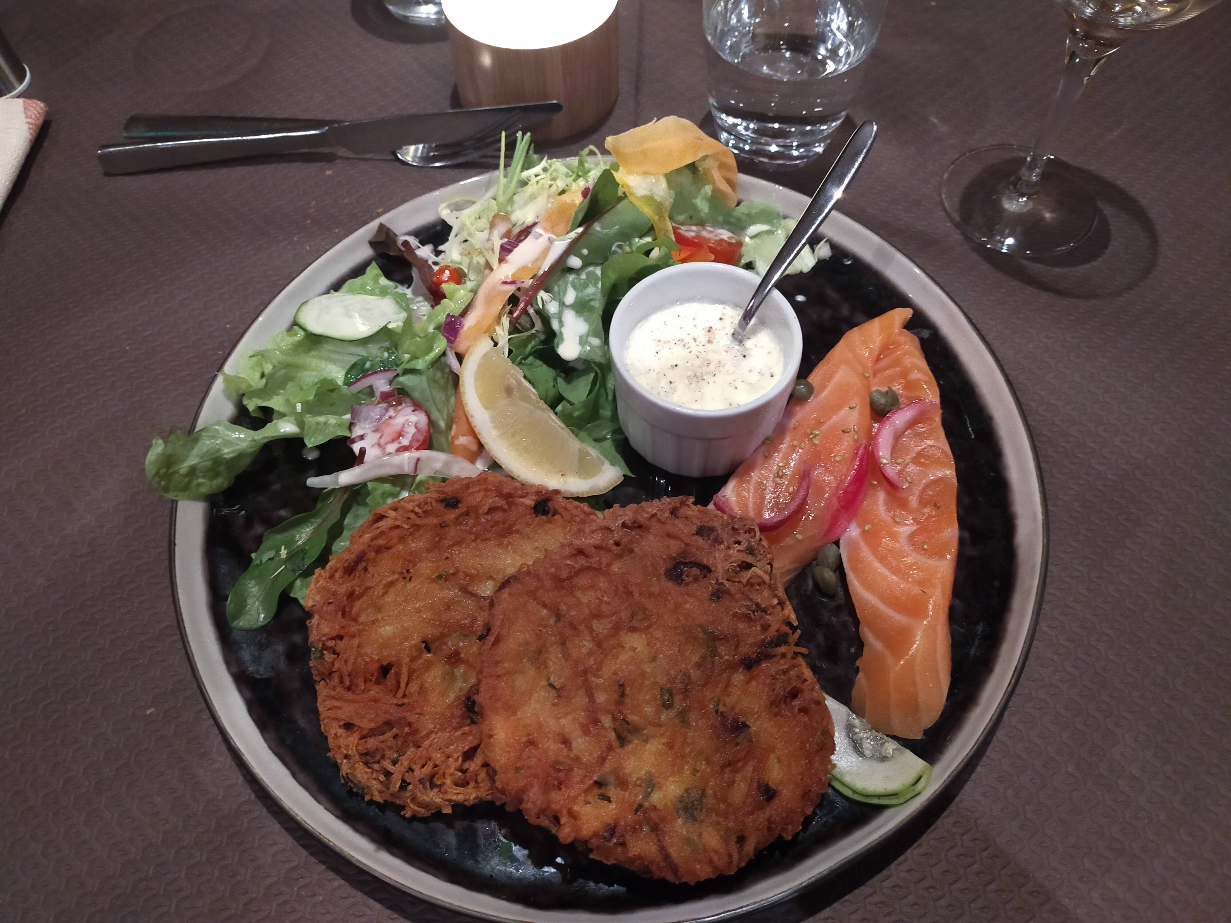 Je ne connaissais pas ce restaurant situé à l'extérieur de Strasbourg. Jolie découverte. Un cadre alsacien soigné et rénové avec goût et finesse. Une carte alsacienne sans trop de plats, juste ce qu'il faut. Des prix corrects. Assiettes plutôt bien servies. J'ai goûté les galettes de pommes de terre avec saumon gravlax. Excellent. On sent qu'ils cherchent à préserver la tradition en ajoutant une touche de modernité. Ils ont trouvé le bon équilibre. Je n'ai pas mis 5 étoiles car l'accueil de la serveuse (peut être la gérante) était un peu froid, quelques sourires ne font pas de mal. Les autres serveurs rien à dire.