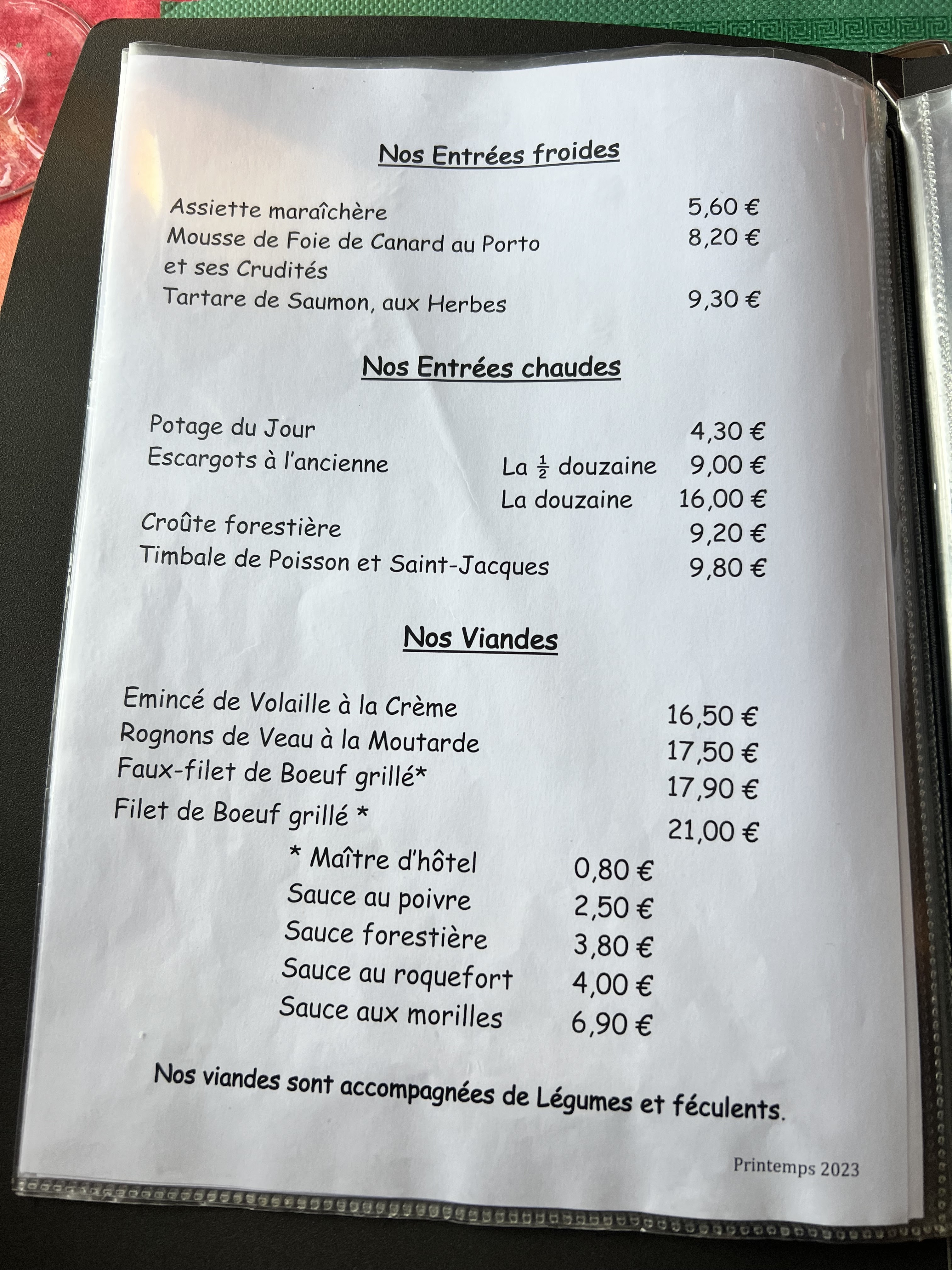 Réservation indispensable Cuisine traditionnelle au menu ce jour 14.02 . Pot au feu divin.....copieux Si déjeuner à la carte, prévoir du temps...Je recommande . Personnel top