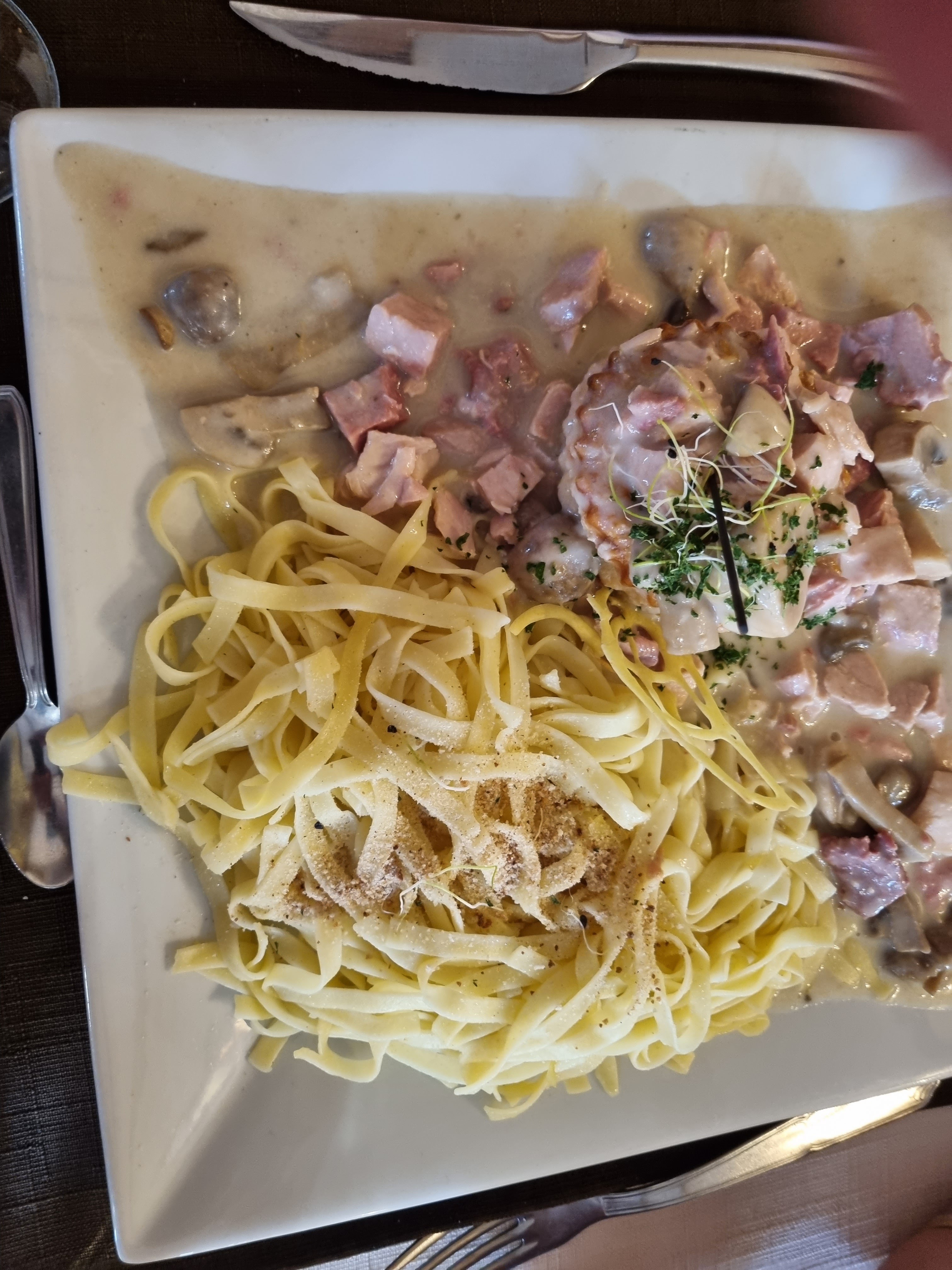 Nous avons eu un bon dîner. Les gens sont très gentils, parlent un peu anglais et un peu plus allemand. La nourriture était bonne !
