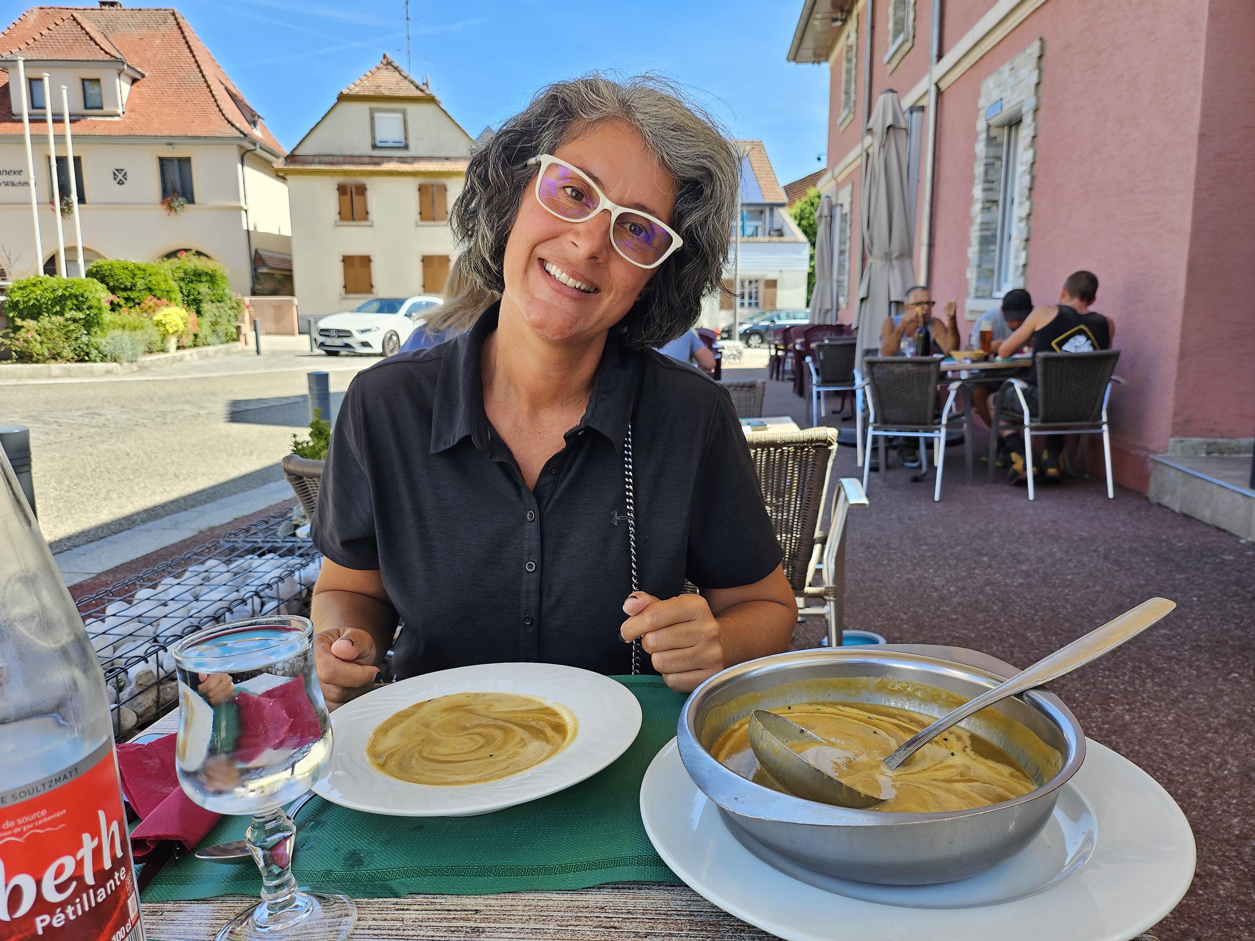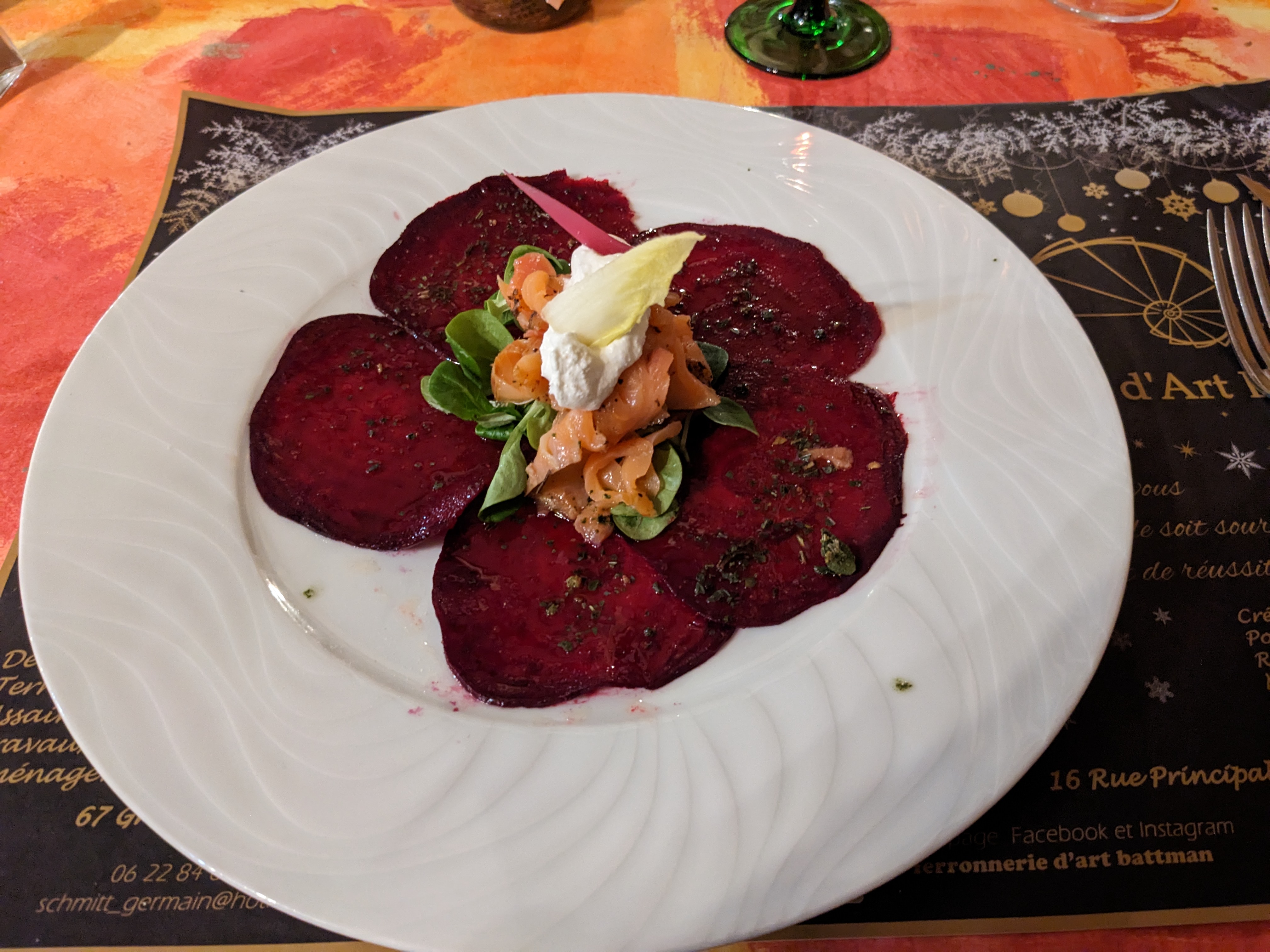 C'est pour avoir voulu engranger de l'Art que nous avons atterri à Burnhaupt !! Bien grande idée !!! 😍 Une alerte pluie nous susurre à l'oreille d'aller taquiner cette petite terrasse qui nous fait de l'œil ! Coup de bol ! le resto est archi réservé et c'est bien en terrasse que nous allons passer un bon moment ! Tout d'abord la pluie, qui fait resserrer les clients entre eux !! Du coup, on tutoiera les Pays-Bas ! C'est ça l'Europe Môôssieur ! 🤣 Roxane la serveuse, est au top !!! Une vraie PRO, ça nous change, par les temps difficiles qui courent... 😥 On commence par une entrée suggérée (qui faisait suite à un amuse-bouche..) et j'enchaine par une choucroute royale ! Que dis-je ???? Divine !!!! (je rappelle que je suis un régional de l'étape, et pas un touriste !!!) Bref, excellent endroit, où l'on reviendra sans contre-façon .... je suis un garçon.....heureux.