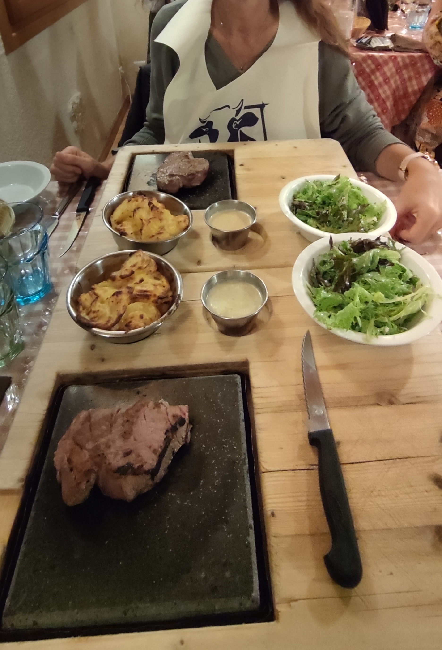 Nous étions 6 personnes, viandes de boeuf sur ardoise, magrets de canard 🦆 sur ardoise, truite et jambon fumé etc... Nous avons bien mangé et les desserts maison.