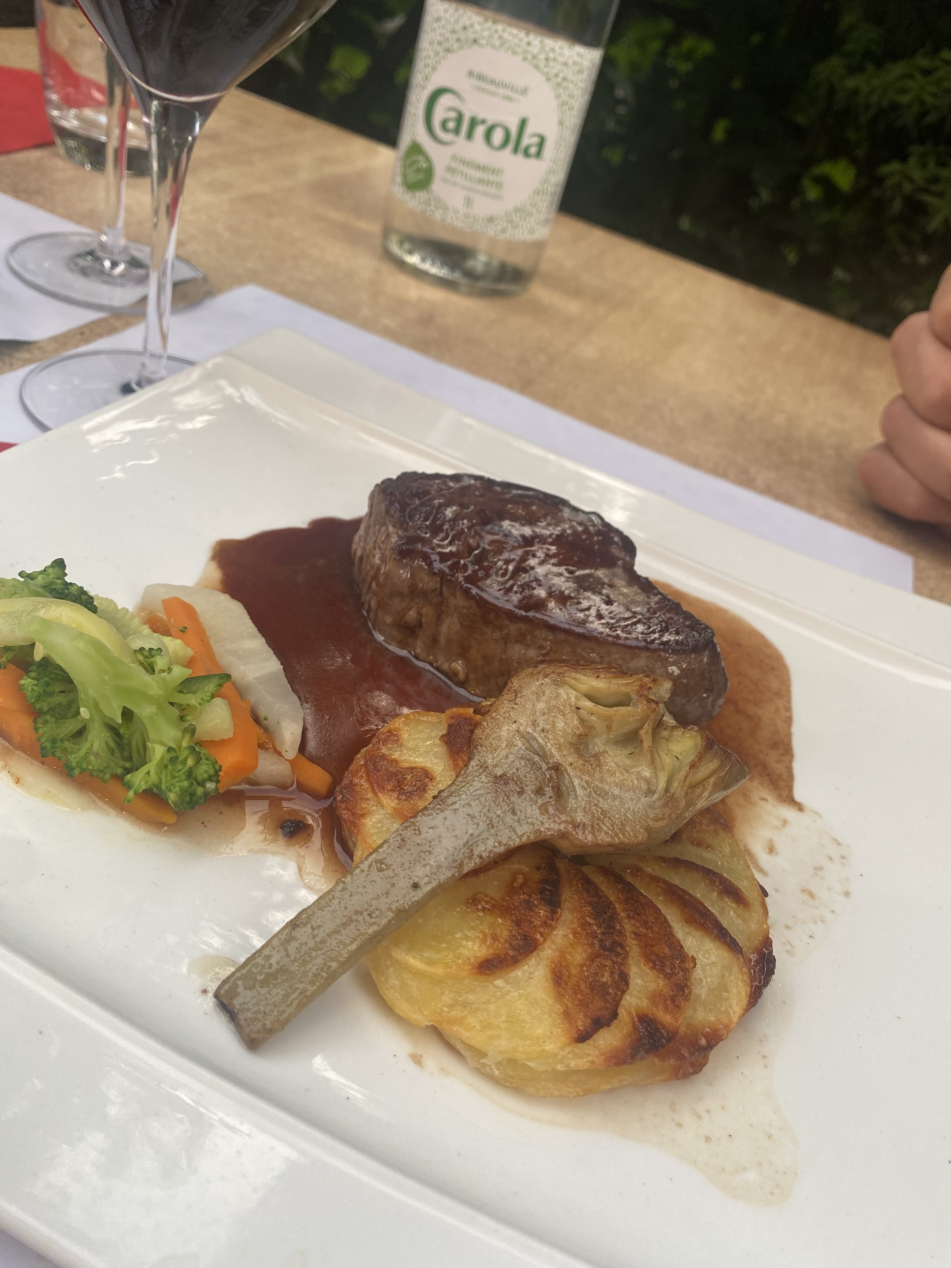 Nous avons déguster une côte de veau aux morilles cuite à la perfection avec des légumes frais et de superbes frites. Restaurant familial sans prise de tête et de qualité.