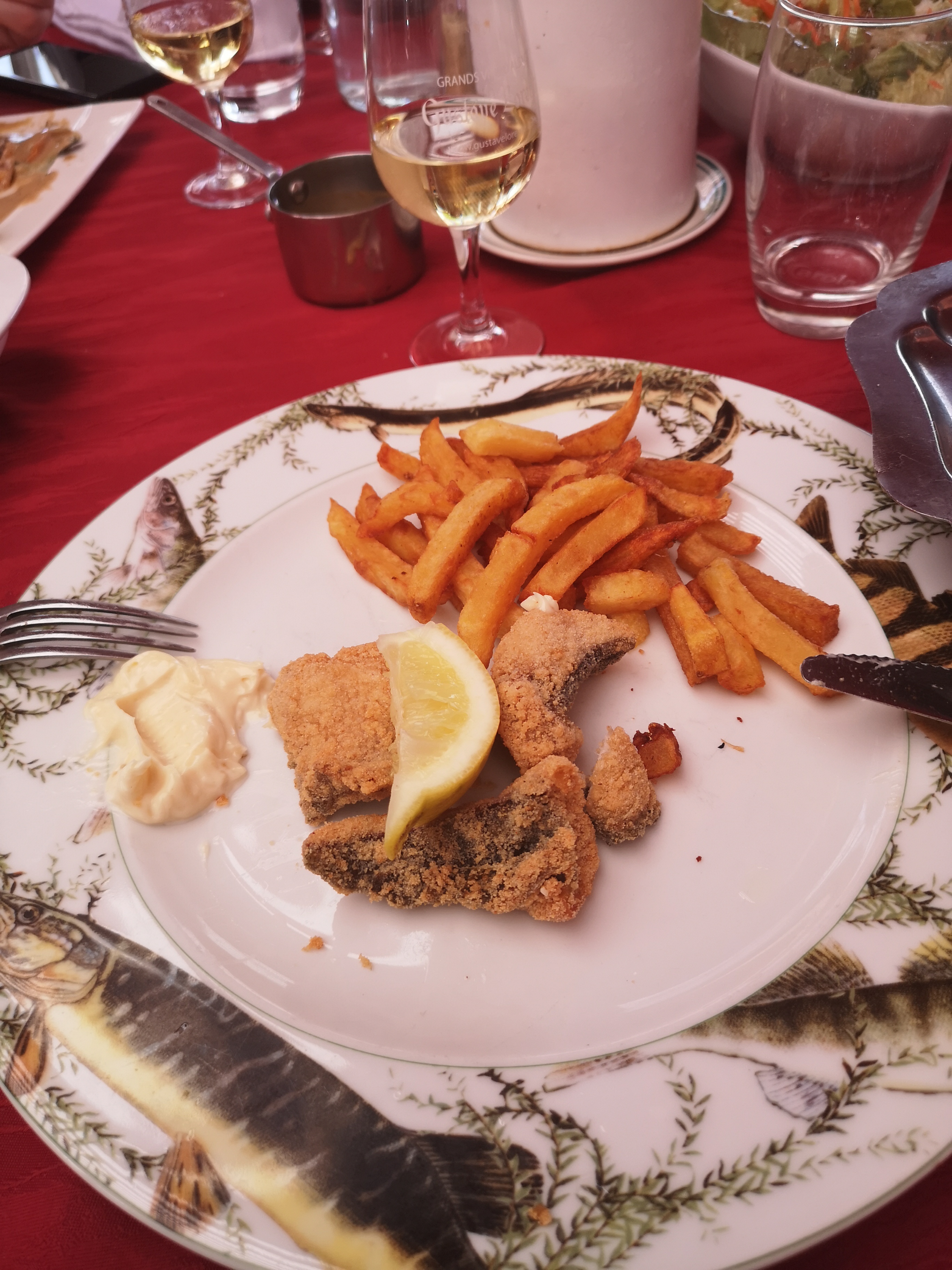 Bon restaurant, entrée excellente, carpes excellentes, frites moins, trop brunes trop dures, dessert bien. Accueil sans plus, on a dû chercher notre table sur la terrasse
