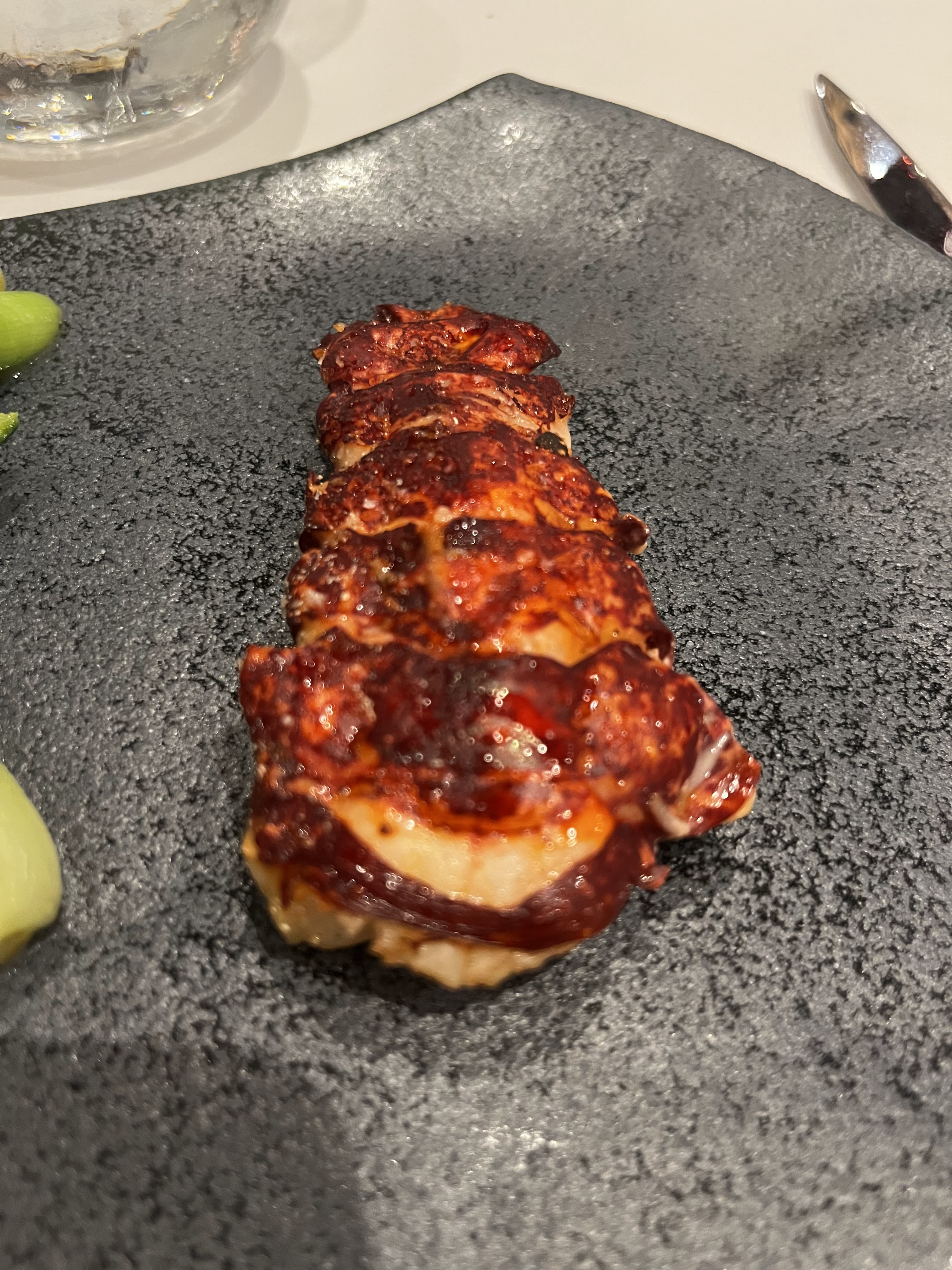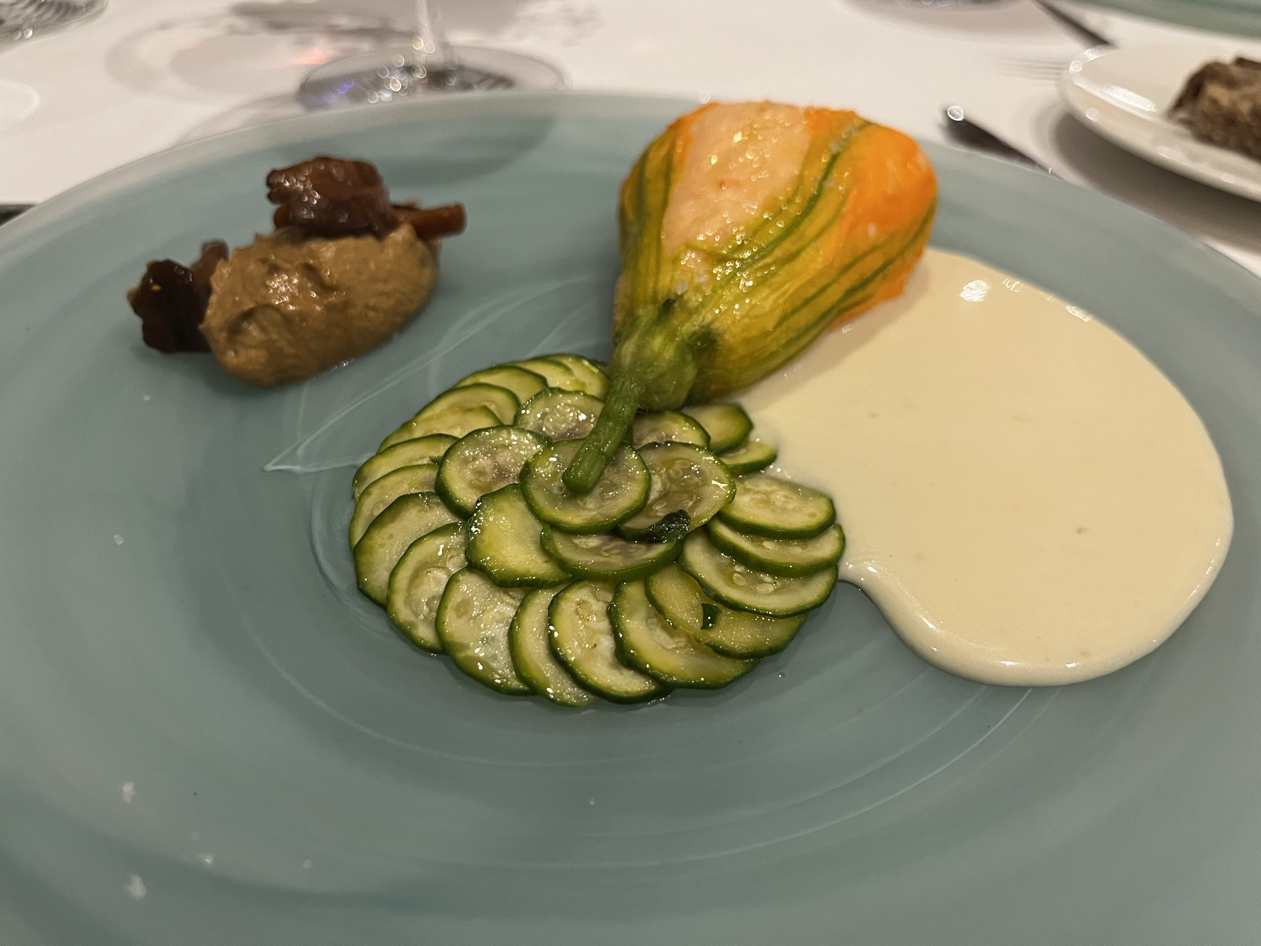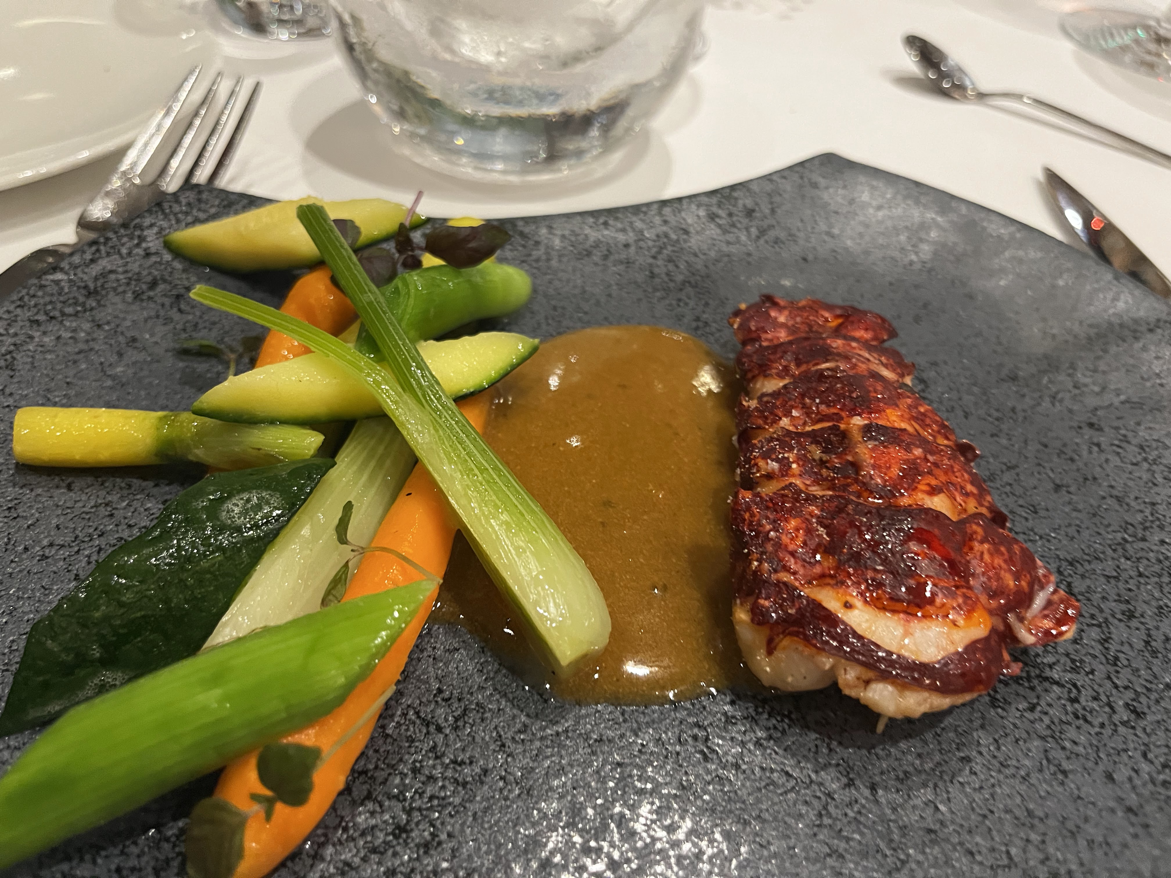 le chef a concocté avec goûts : courgette farcie gambas en entrée, le homards bleue en plat et le soufflé en dessert