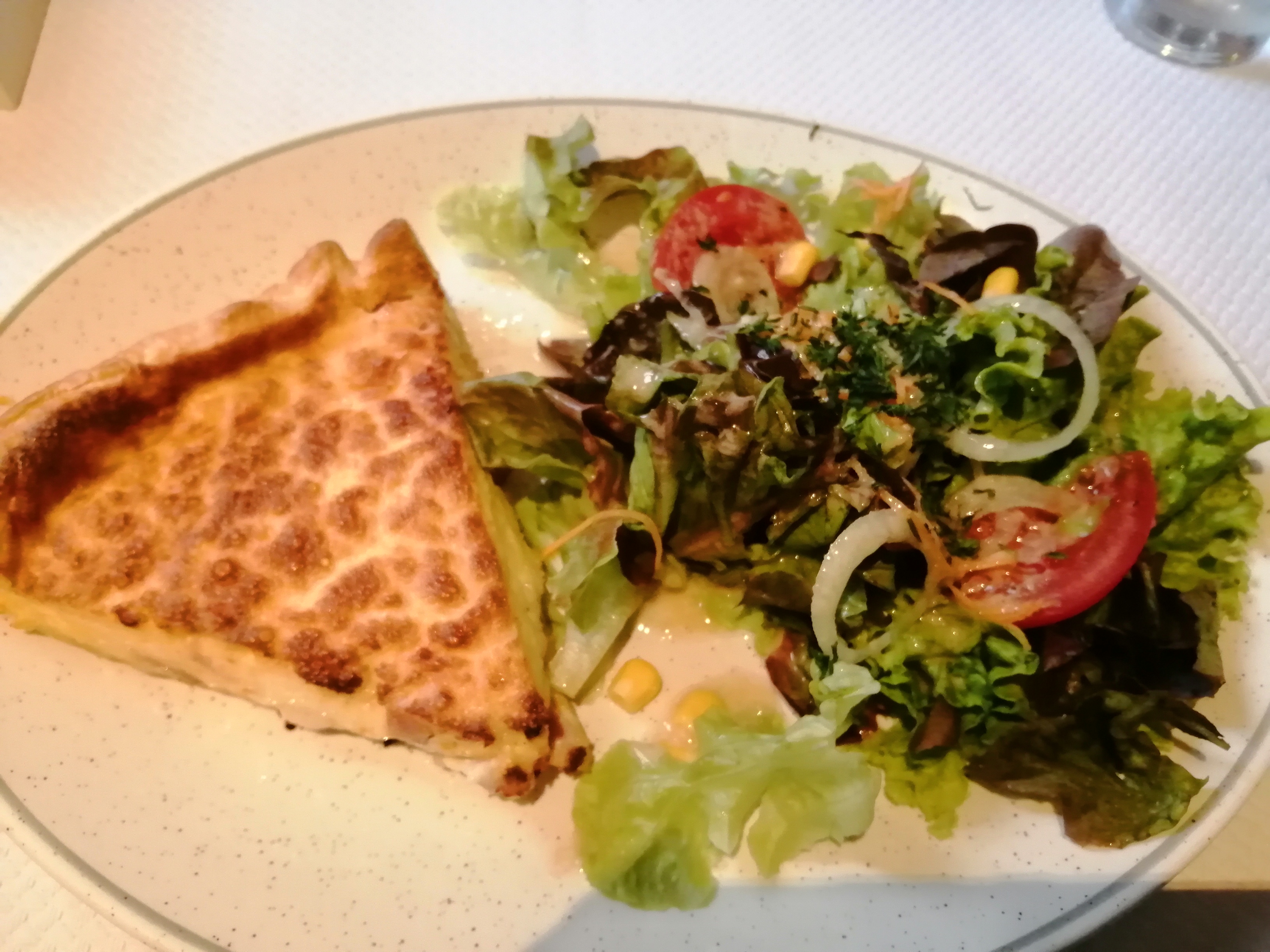 L'entrée (quiche lorraine et salade) et le plat principal (steak de veau avec sauce crémeuse aux champignons et pommes de terre frites) avaient l'air vraiment sympa, étaient délicieux et à un prix raisonnable. Tout ce dont un cycliste affamé avait besoin après une journée de randonnée à travers les Vosges.