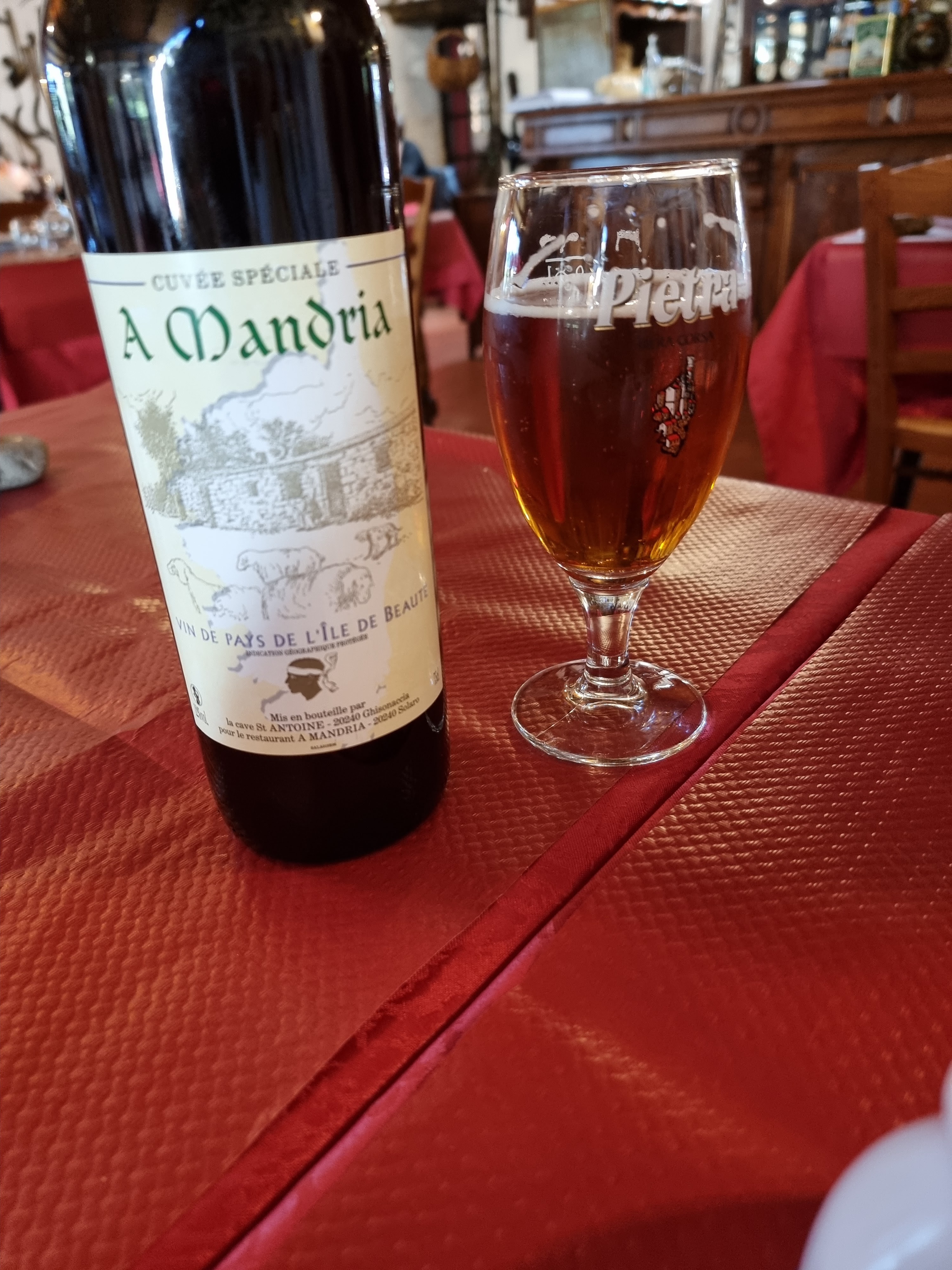 Vin cuvée spéciale A Mandria excellent ! Plats : cochon grillé et magret de canard. Assez dans l'assiette pour les bons mangeurs. Petit apéritif et digestif offerts par la Maison. Service impeccable, patron au top ! Nous étions au coin de la cheminée c'était très agréable. Cuisine corse avec produits corses. La décoration est typique et très belle Nous reviendrons c'est sûr !