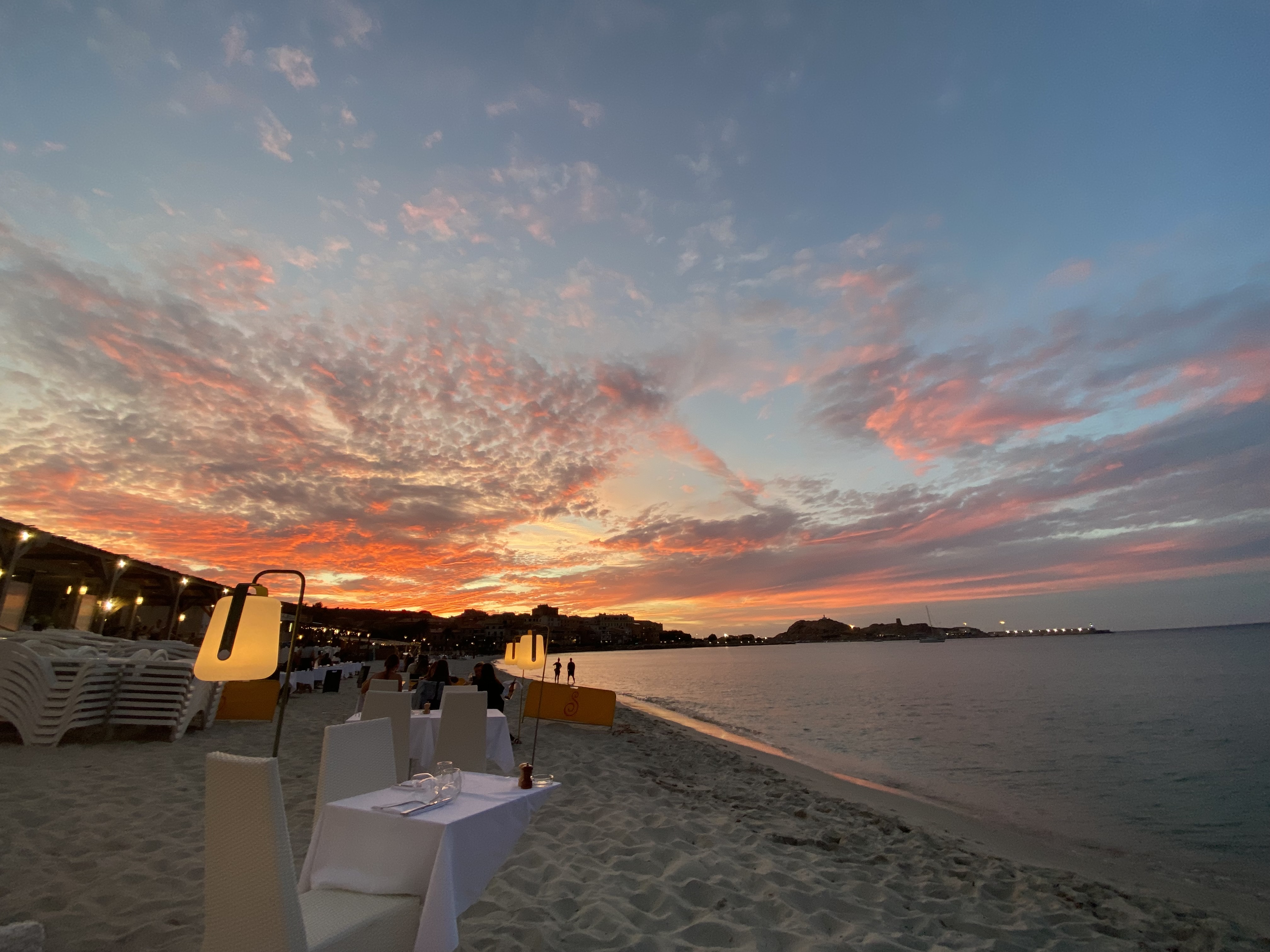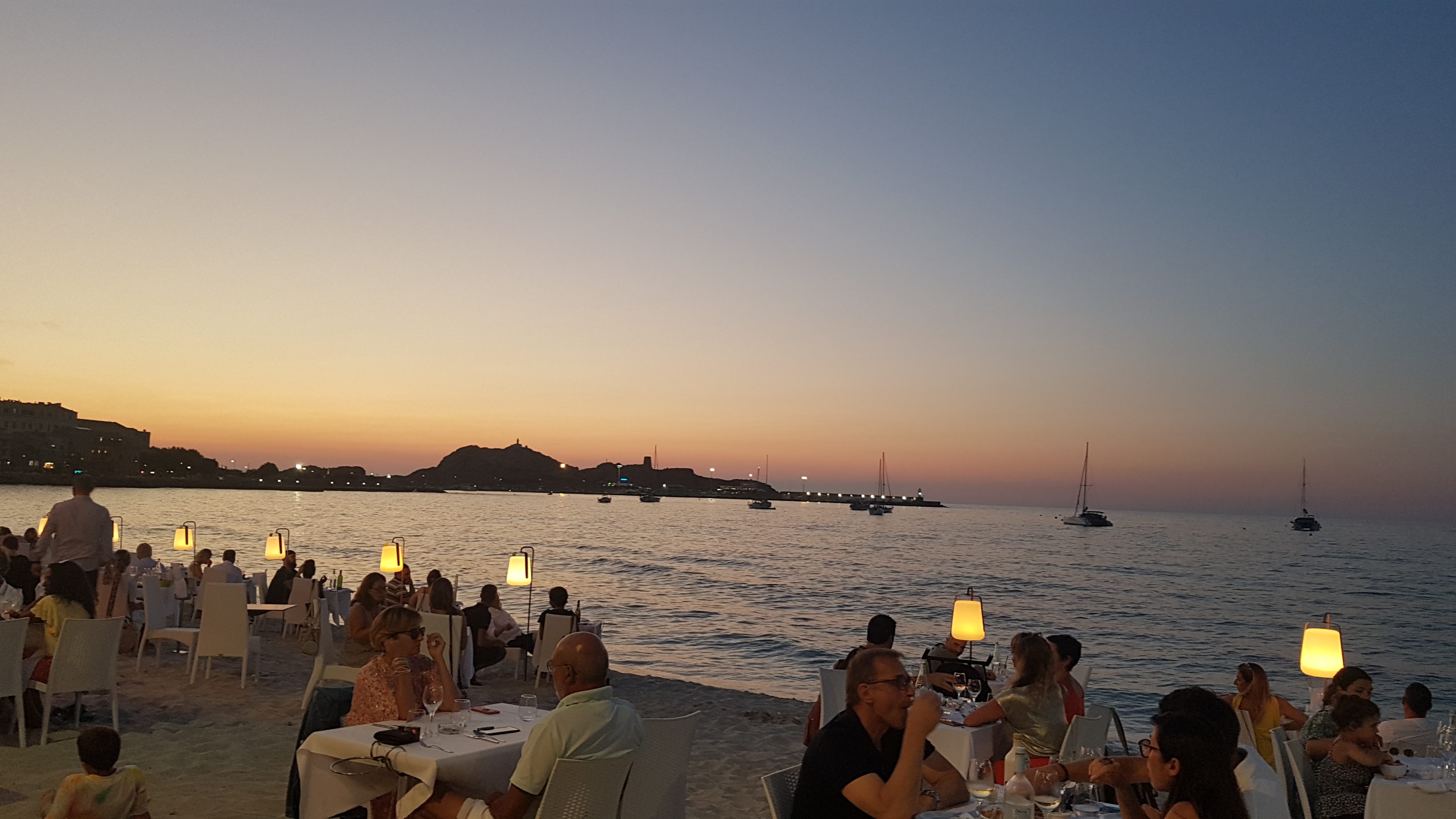 Une belle soirée sur la plage. Cuisine et une ambiance très agréable. Un joli couché de soleil sur l'île Rousse en cadeau.