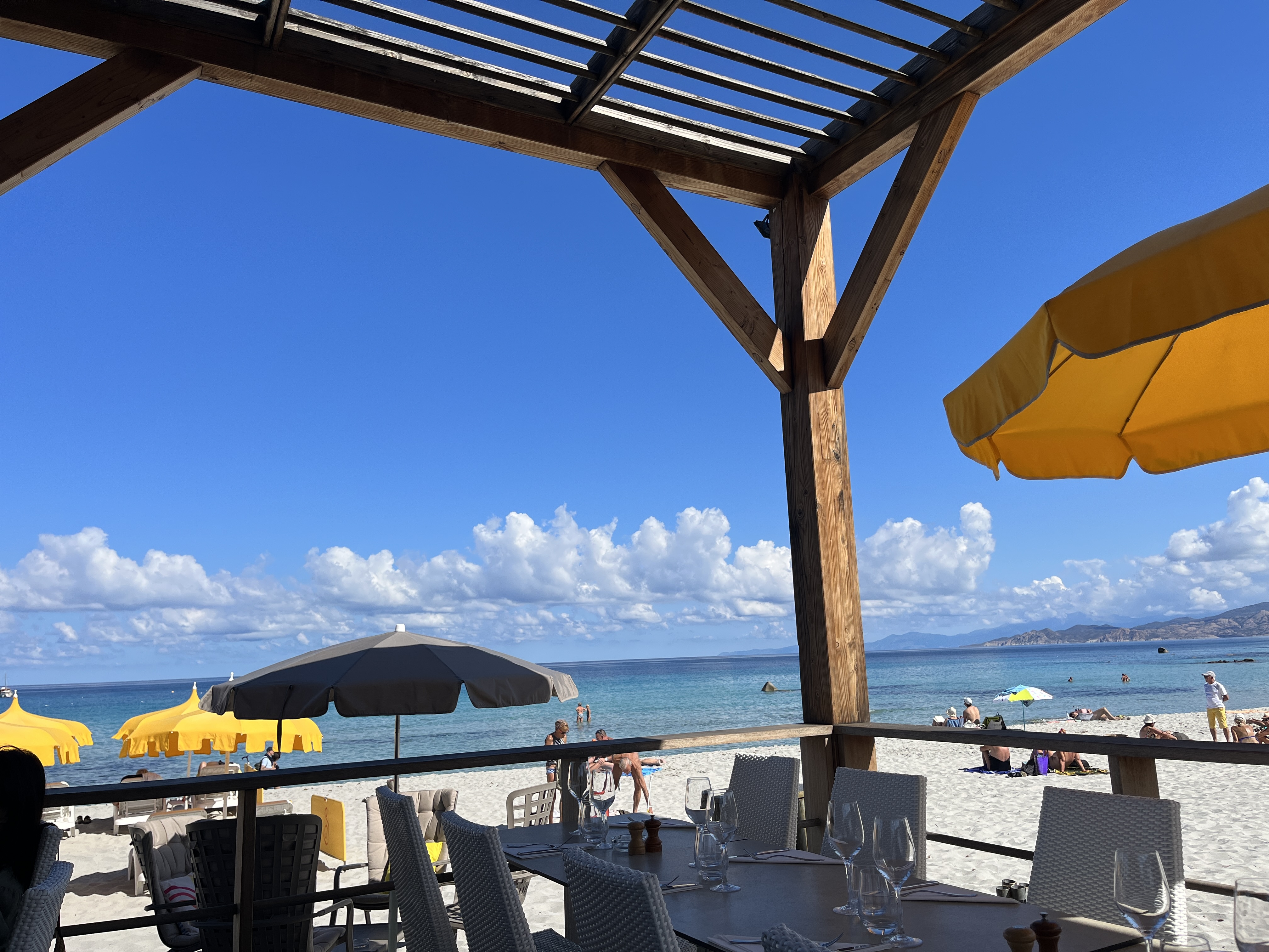 Superbe endroit, les pieds dans le sable, nous venons souvent lors de nos passages sur l'île de beaute. Plats bien servis, belle présentation, bons. Restaurant permettant d assister au couché de soleil superbe. Nous avons offert un diner à notre fille et son ami. Réservation sympathique accueil téléphonique agréable avec la promesse tenue d avoir les pieds dans l eau . Tout était idyllique sur le papier. Sauf que : Accueil froid en indiquant que la table réservée est la bas. Pas d accompagnement. Carte donnée sans stipuler qu il n y avait plus de carpaccios (heureusement que les autres tables a proximité permettaient d entendre certaines infos) attente TRÈS longue pour obtenir l addition qui n est jamais arrivée et qu il a fallu aller quémander a l accueil alors que les autres tables avaient le droit a l addition a table, cafe demande jamais servi, 45 mns d attente a table avant daller régler la note sans avoir eu le cafe digestif offert a tout le monde sauf notre table.....bref bel endroit bons plats mais il ne faut pas avoir 18 ans car vous serez accueillis et servus différemment des autres clients plus ages.... quelle déception.