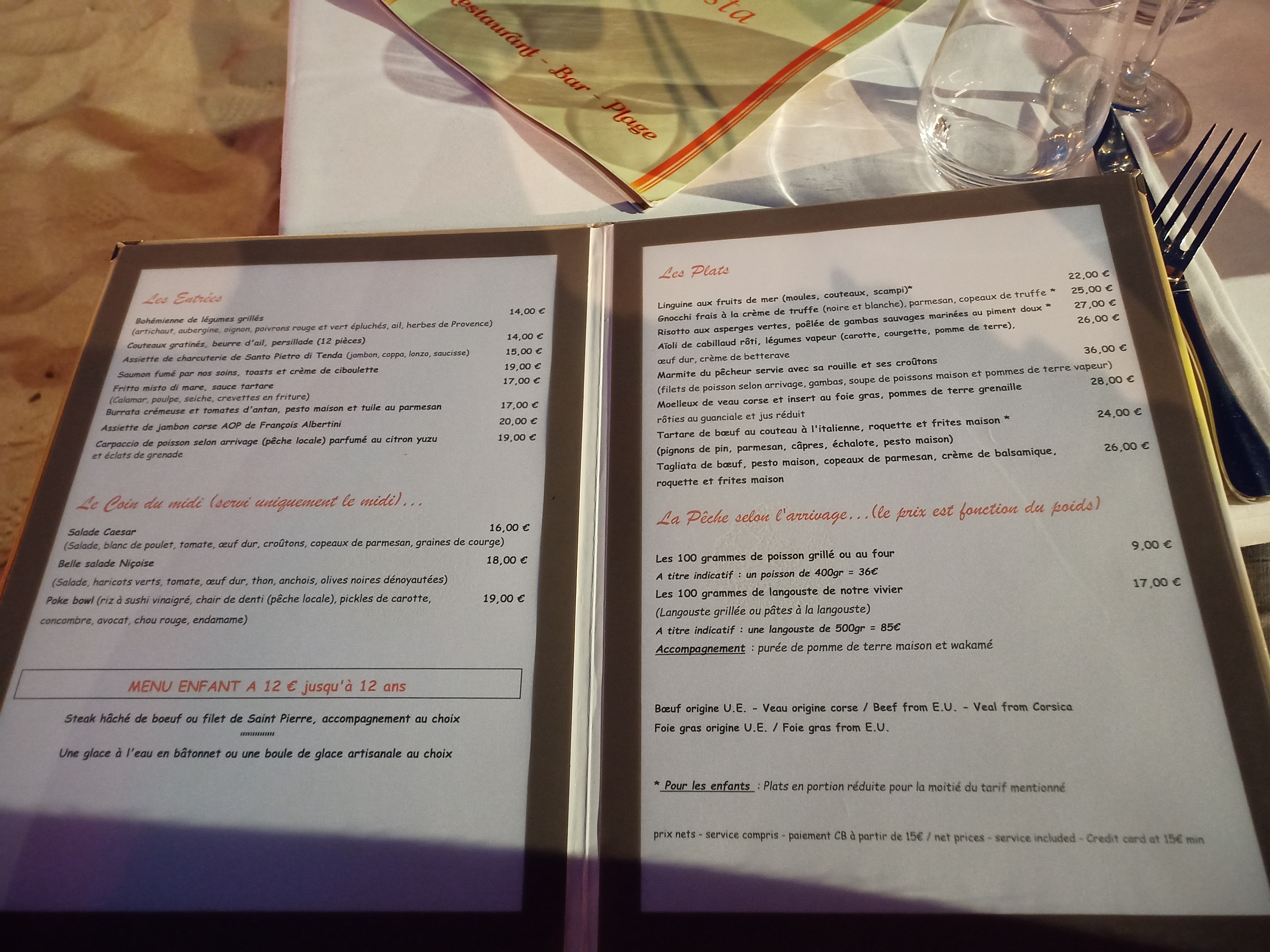 Ne pas tenir compte des commentaires de mécontents qui veulent de la qualité sans payer !( encore des français râleurs comme toujours en vacances qui veulent manger une pizza à 5 ! ) ils n’ont qu’à aller à Paris plage et pas en corse s’ils sont pas contents ! J y vais très souvent et j’ai jamais été déçu ! Très belle vue propriétaire très sympa et endroit très agréable ! Il y a bien des restaurants moins cotés et plus chers dans la région !