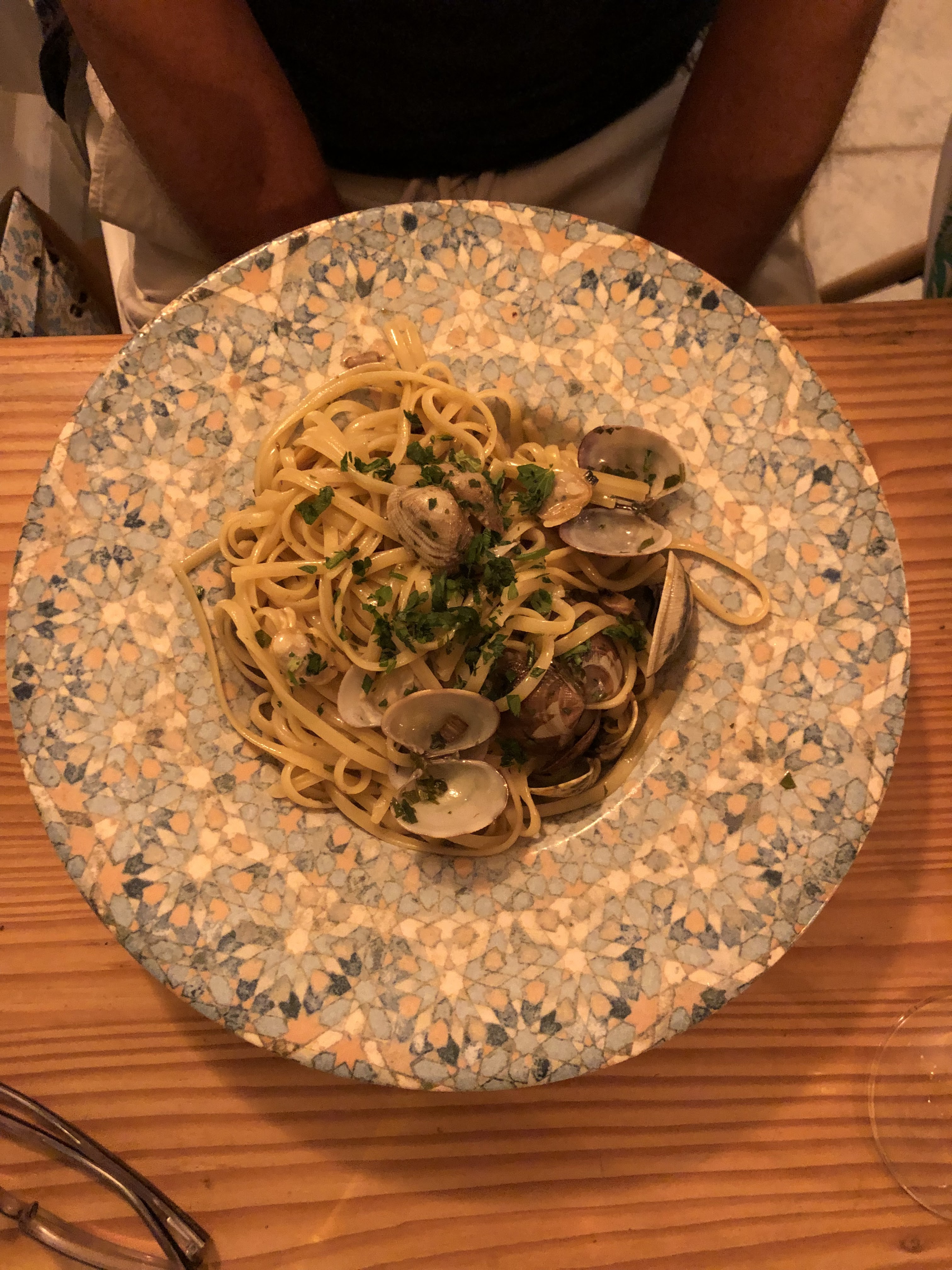 Le cadre est sympa, la petite ruelle calme et avec un petit vent bien agréable. Le service est sympathique. Par contre nos deux plats étaient ratés. Pasta alle vongole sans aucune saveur et pâtes aux fruits de mer trop cuites et vraiment pas bonnes. Les pizze sont peut être meilleures