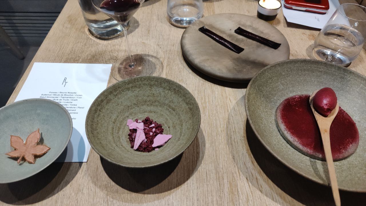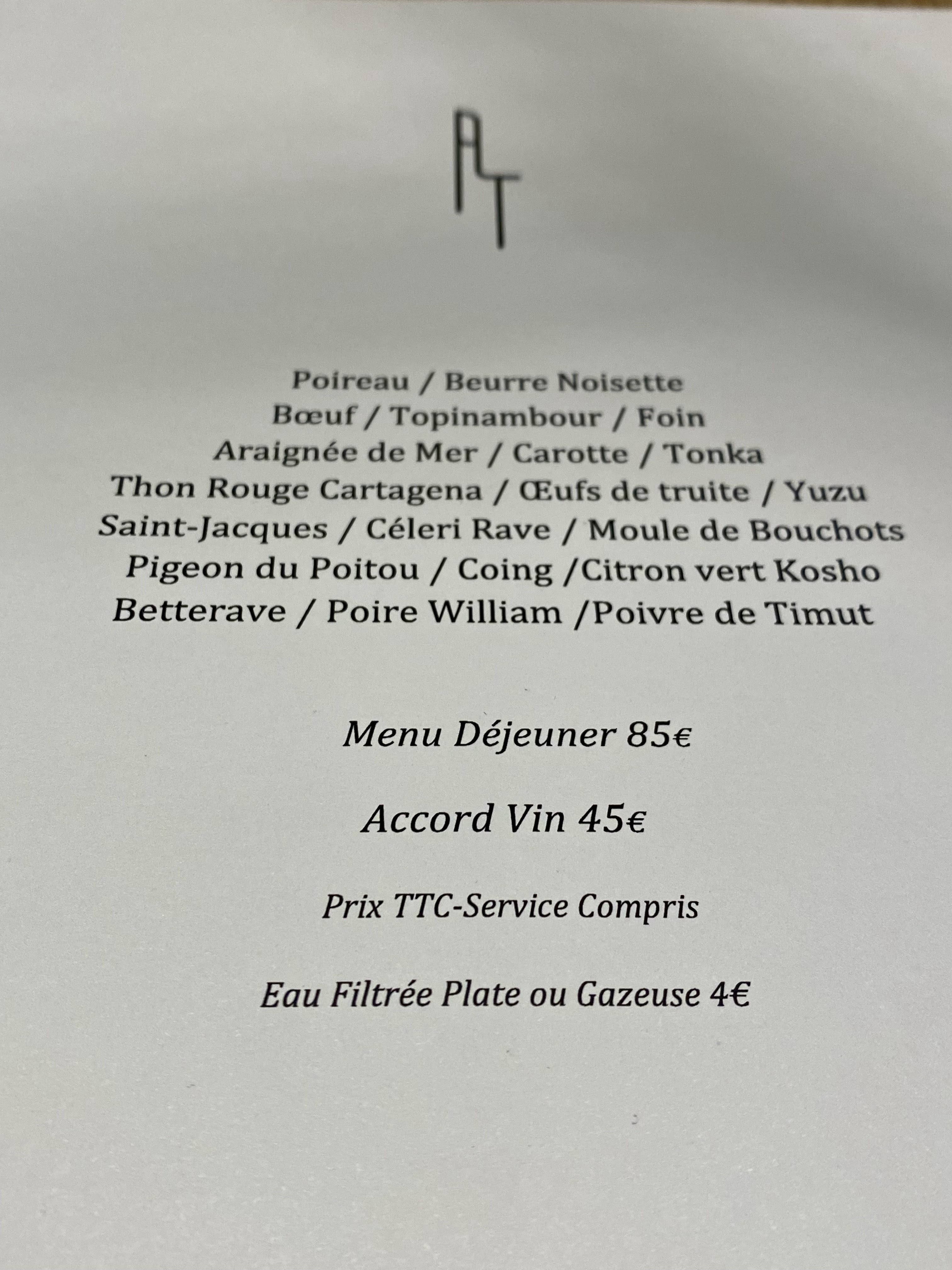 À la scandinave, A.T nous embarque dans un minimalisme efficace, texturé, inspiré. L'ambiance en salle fait du bien, décomplexée et monochromée. Cuisine créative de toute évidence, centrée sur les techniques et le visuel, peut-être parfois au détriment du goût selon nous... Nous avons apprécié le menu déjeuner ce midi avec une super entrée en matière Poireaux / Beurre noisette, bouchée très efficace. La tartelette chanterelles était excellemment maîtrisée dans les textures, mais un twist aurait été bienvenu type ail noir, vieux balsamique... Le plat phare en écailles oursin / carotte / tonka était très certainement la plus belle surprise niveau accord, bouillon archi intéressant, très belle longueur en bouche. La St Jacques crue, bergamote et oca gère le cru en jolies variations très pures, mais la fleur de sel manque ! Idem pour les deux plats qui suivront (moules et agneau du Quercy), du sel aurait fait du bien. La pièce d'agneau de ma compagne était aussi assez nerveuse ; bémol sur ce plat en (très) large déclinaison de betterave dont nous avons peu compris la pertinence... Belle découverte ludique sur le dessert coing / foin dont l'esthétique est parfaite, bien que les goûts pourraient être plus assumés. Rien à redire par contre pour le pain maison et le beurre fermenté, une pause réconfortante et gourmande au milieu du menu. Enfin l'accord mets et vins nous a déçu dans son rapport quantité/prix (35€/pers pour deux verres + 1 bière pour deux) bien que le vin rouge des Pouilles soit une jolie trouvaille. En bref, addition élevée mais sans surprise, qui souligne la masse de travail engagée derrière chaque assiette, mais qui laisse une légère fausse note sur la gourmandise et les quantités. Un 3 étoiles qui vaut 3,5. Merci à toute l'équipe.