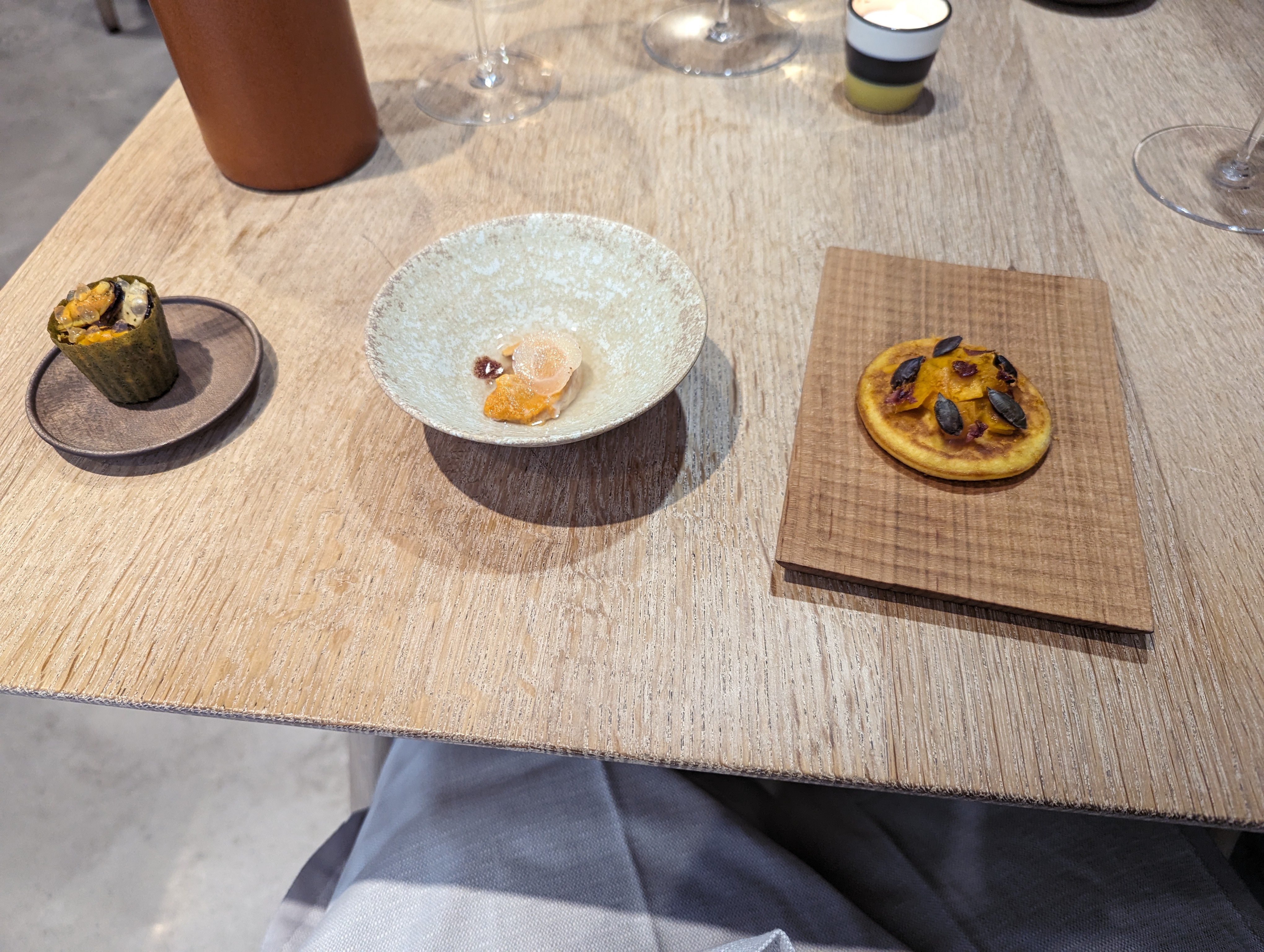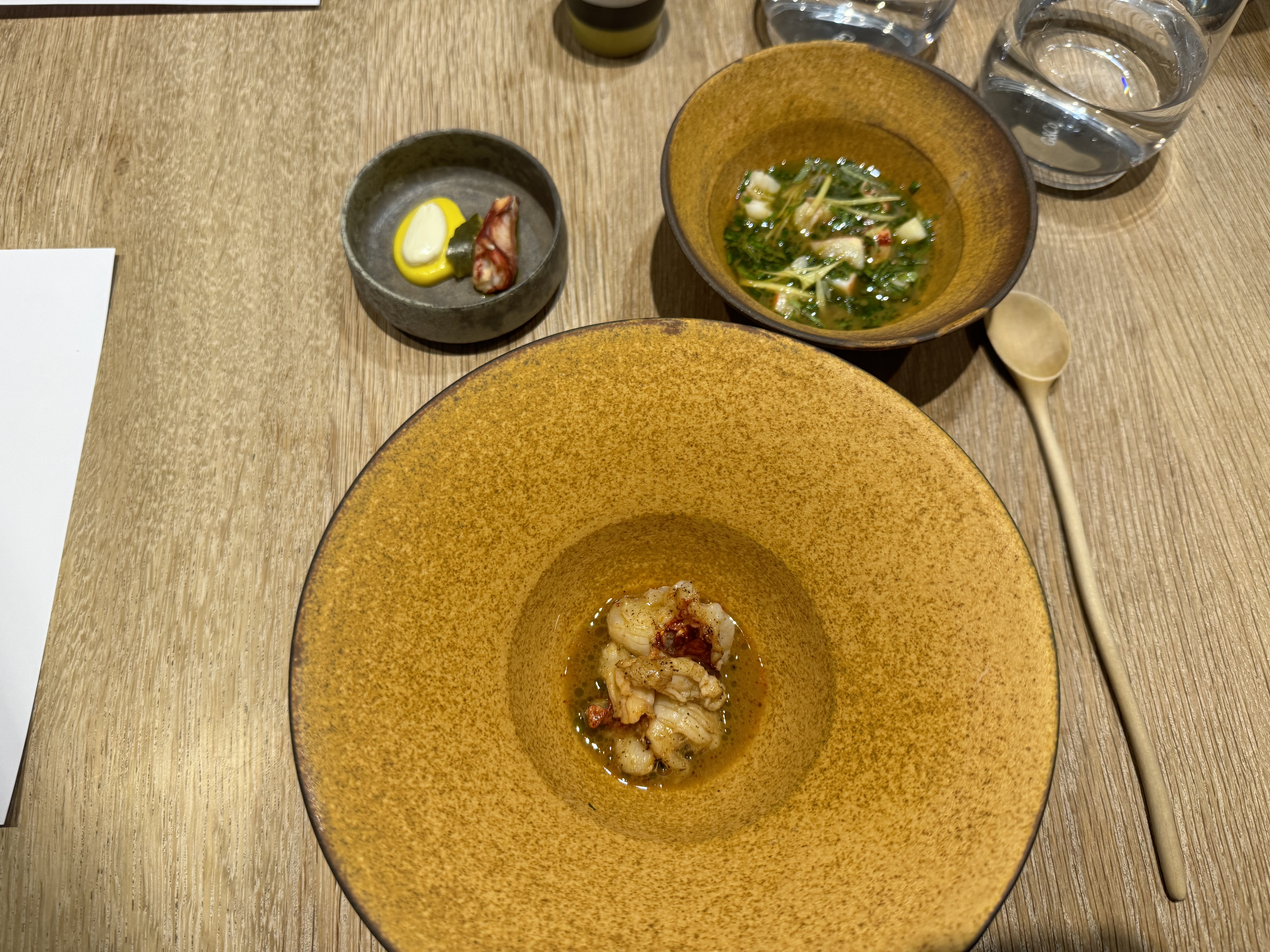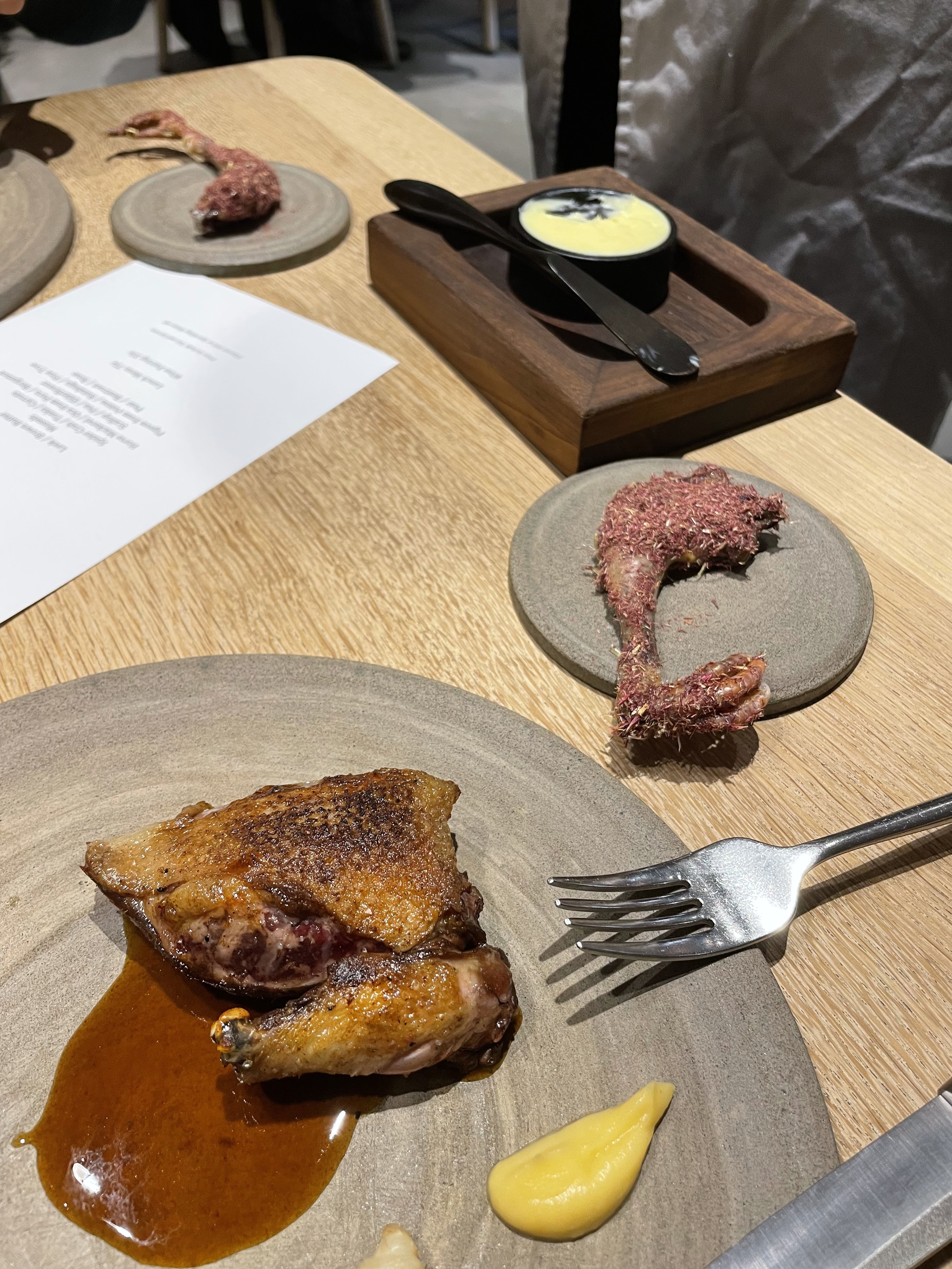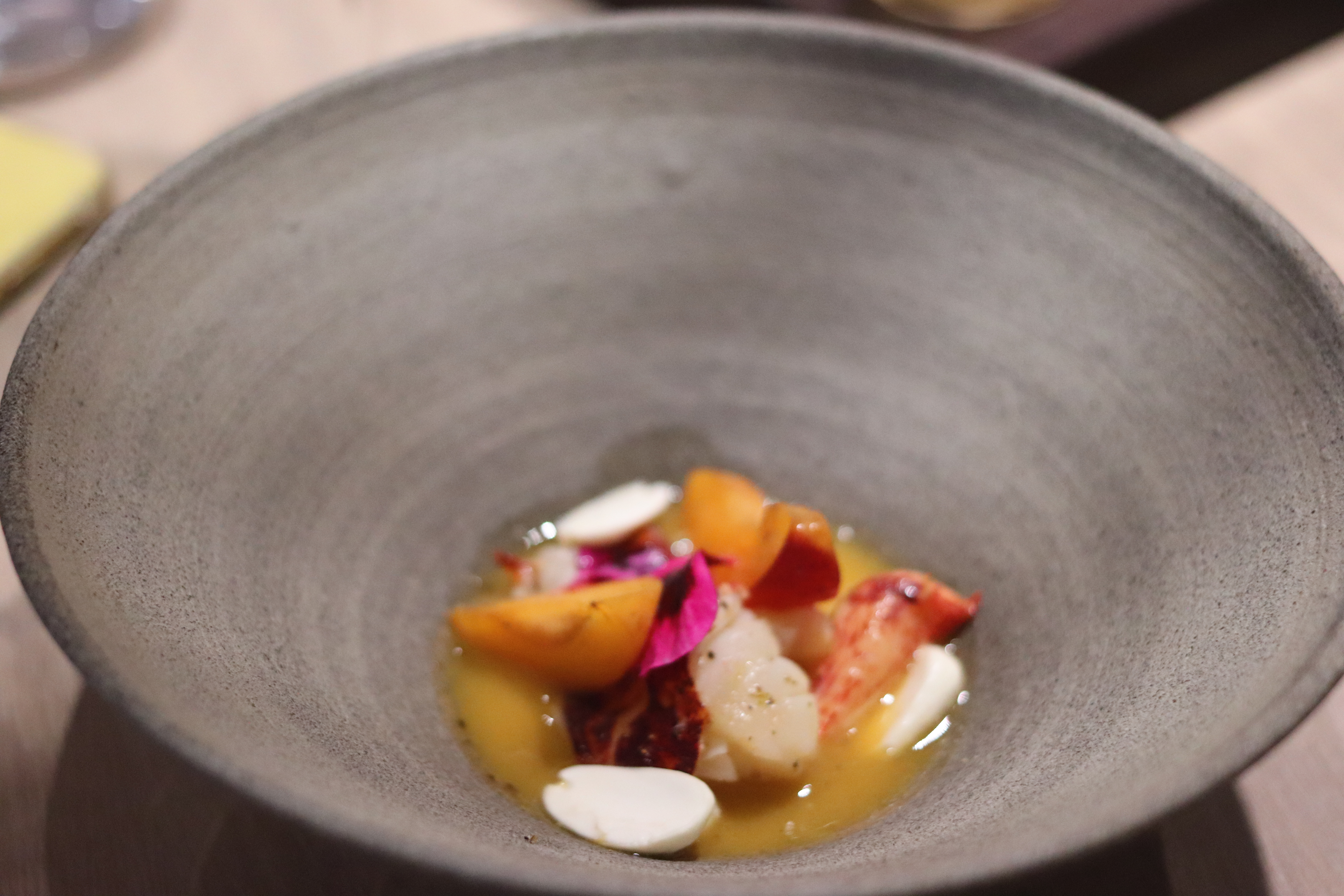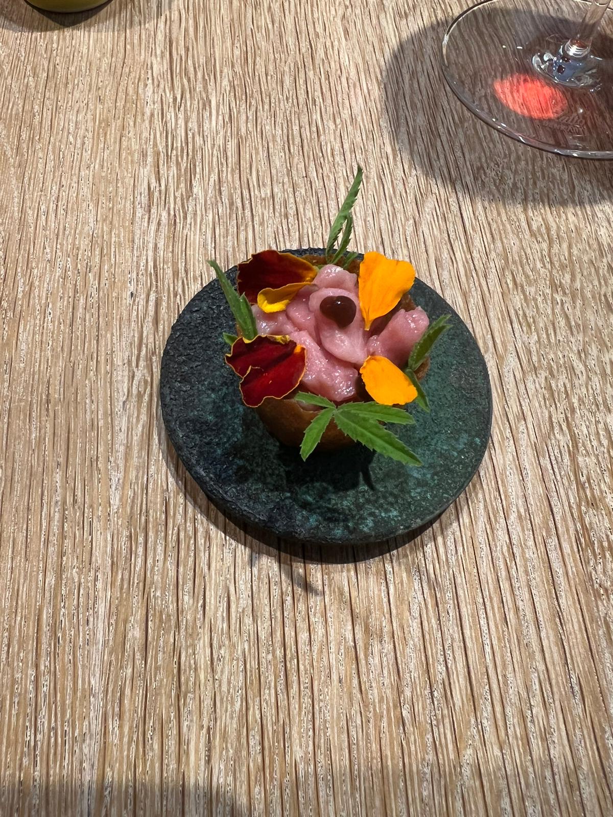 J'ai pu me faufiler pour un déjeuner «sans réservation», dans ce petit restaurant au décor minimaliste et ne comptant que 8 tables. J'ai apprécié les moules fumées avec du pain frit façon Naan, le magret et le gigot de pigeon, et le carpaccio de thon rouge, et bien sûr, le dessert aux soucis (quatre choix), Malheureusement, je n'ai pas été impressionné par le plat signature (crabe-araignée), même s'il était techniquement astucieux. Mais les serveurs étaient excellents, et par ailleurs je me suis régalé… J'y retournerai. / I was able to sneak in for a no-reservation lunch, in this small minimalist decor restaurant with only 8 tables. I enjoyed the smoked mussels with Naan style fried bread, the pigeon breast and leg, and the red tuna carpaccio, and of course, the marigold dessert (four choices), Unfortunately, I was not impressed with the signature dish (spider crab), although it was technically clever. But the servers were excellent, and I otherwise enjoyed myself… I'll return. 2023 09 08. M1.