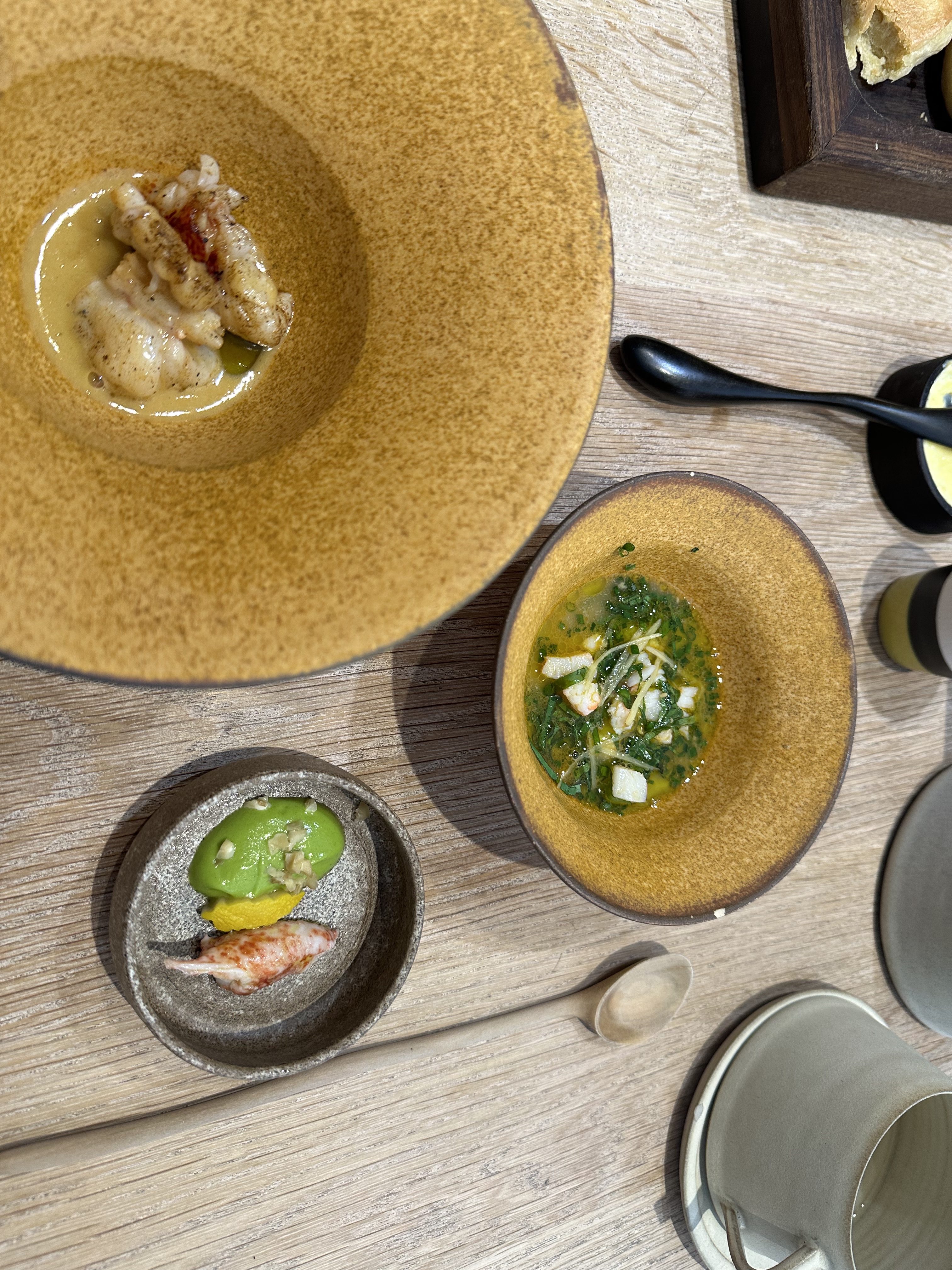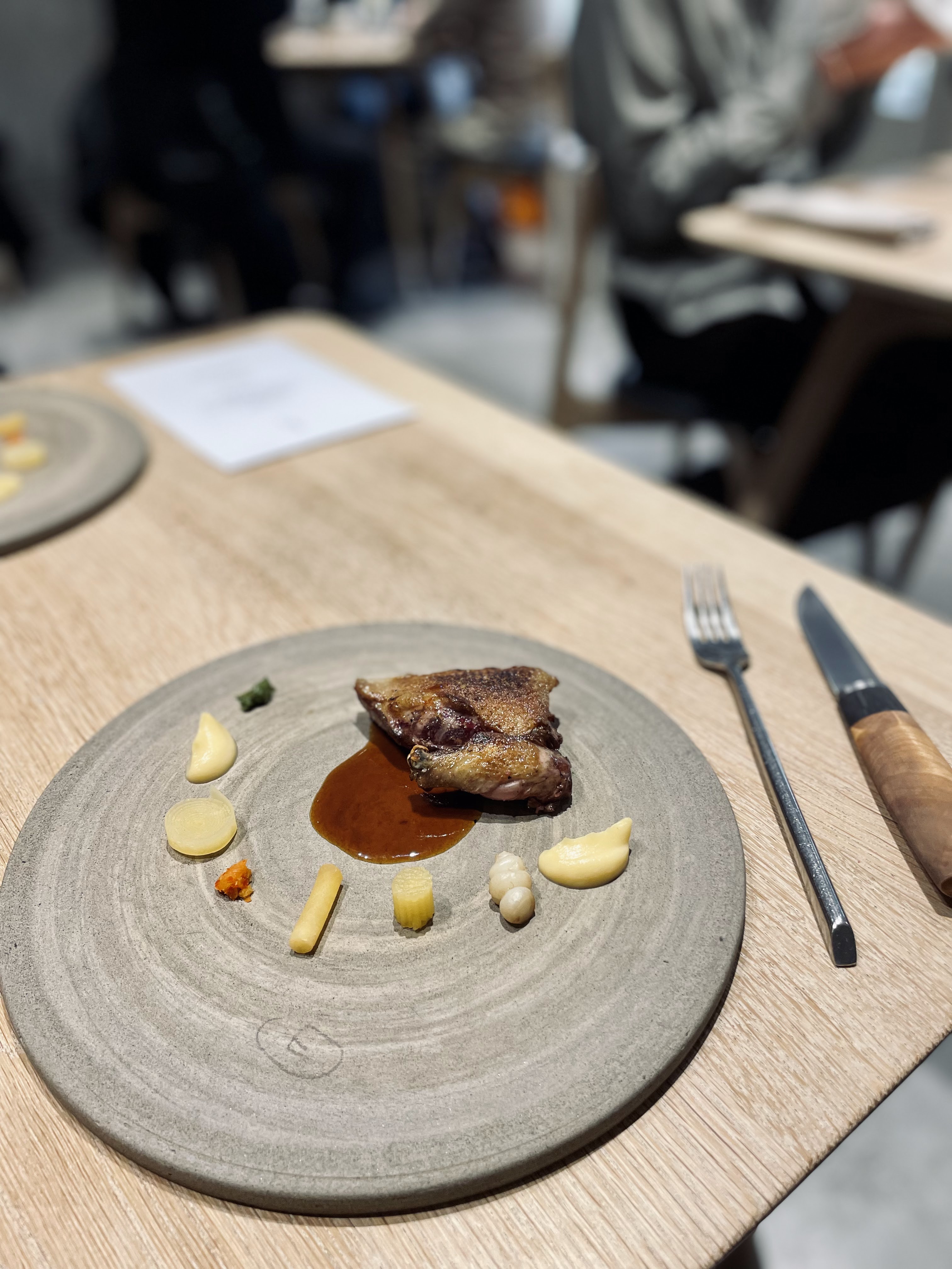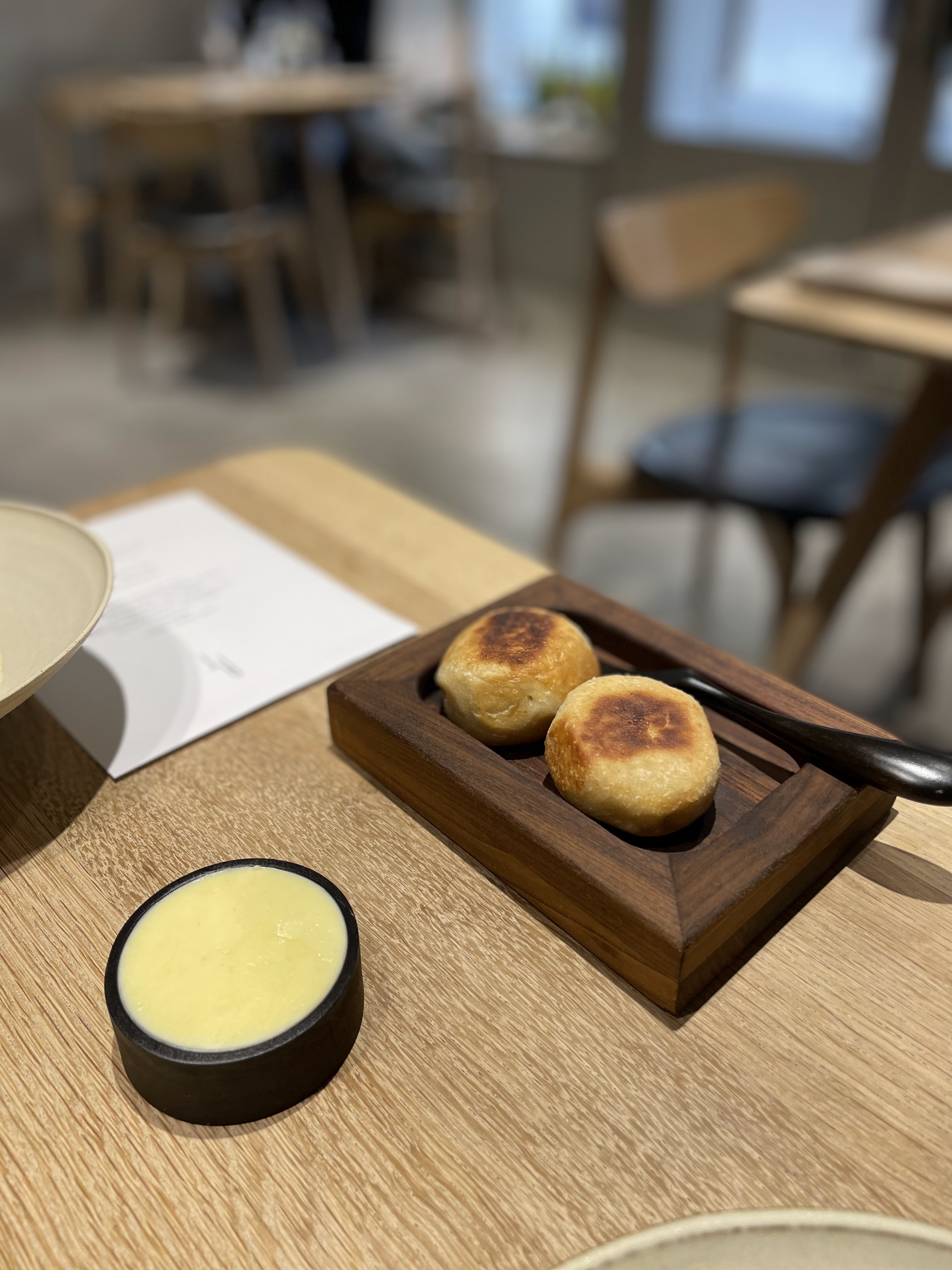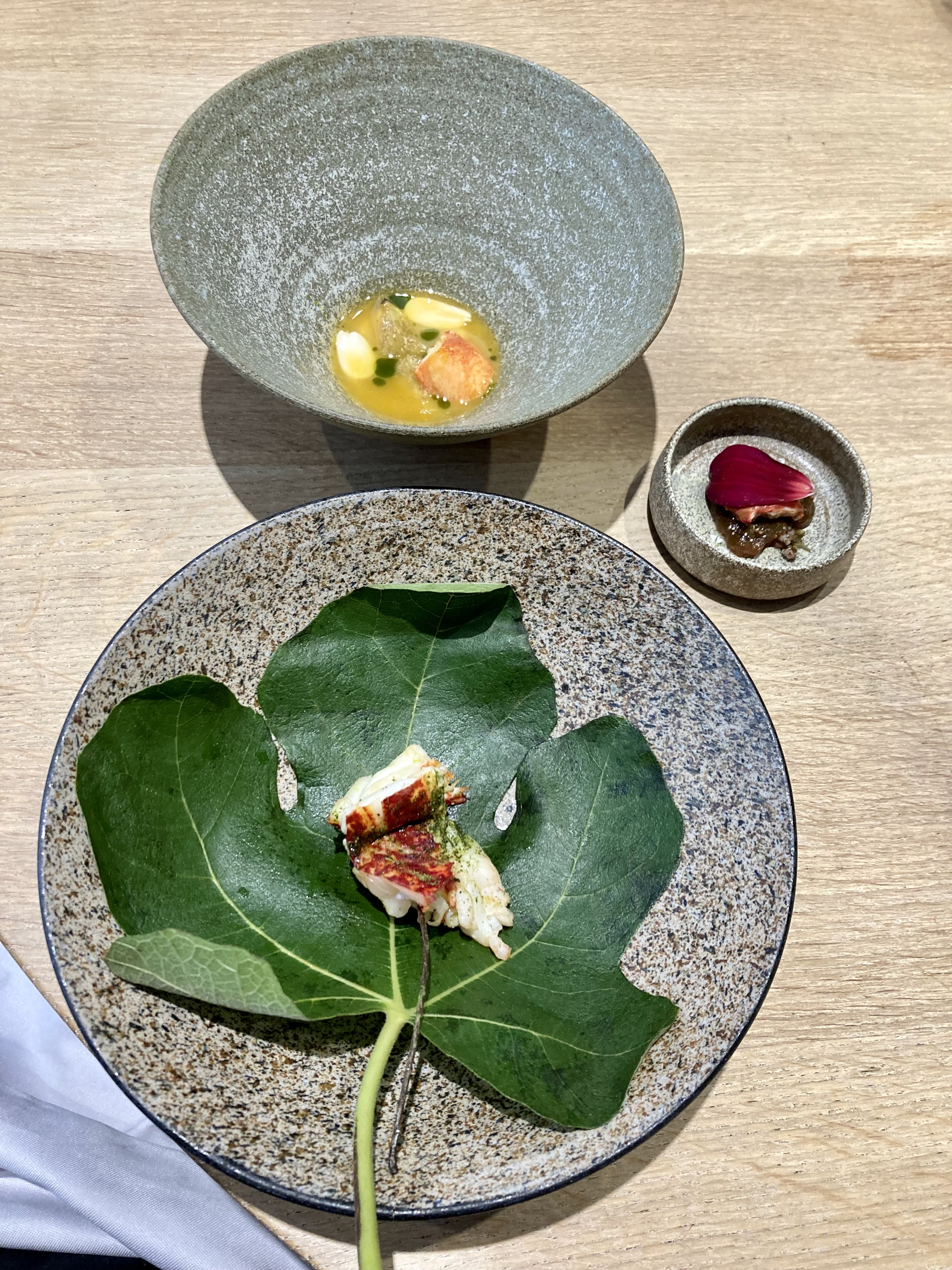 J'ai pu me faufiler pour un déjeuner «sans réservation», dans ce petit restaurant au décor minimaliste et ne comptant que 8 tables. J'ai apprécié les moules fumées avec du pain frit façon Naan, le magret et le gigot de pigeon, et le carpaccio de thon rouge, et bien sûr, le dessert aux soucis (quatre choix), Malheureusement, je n'ai pas été impressionné par le plat signature (crabe-araignée), même s'il était techniquement astucieux. Mais les serveurs étaient excellents, et par ailleurs je me suis régalé… J'y retournerai. / I was able to sneak in for a no-reservation lunch, in this small minimalist decor restaurant with only 8 tables. I enjoyed the smoked mussels with Naan style fried bread, the pigeon breast and leg, and the red tuna carpaccio, and of course, the marigold dessert (four choices), Unfortunately, I was not impressed with the signature dish (spider crab), although it was technically clever. But the servers were excellent, and I otherwise enjoyed myself… I'll return. 2023 09 08. M1.