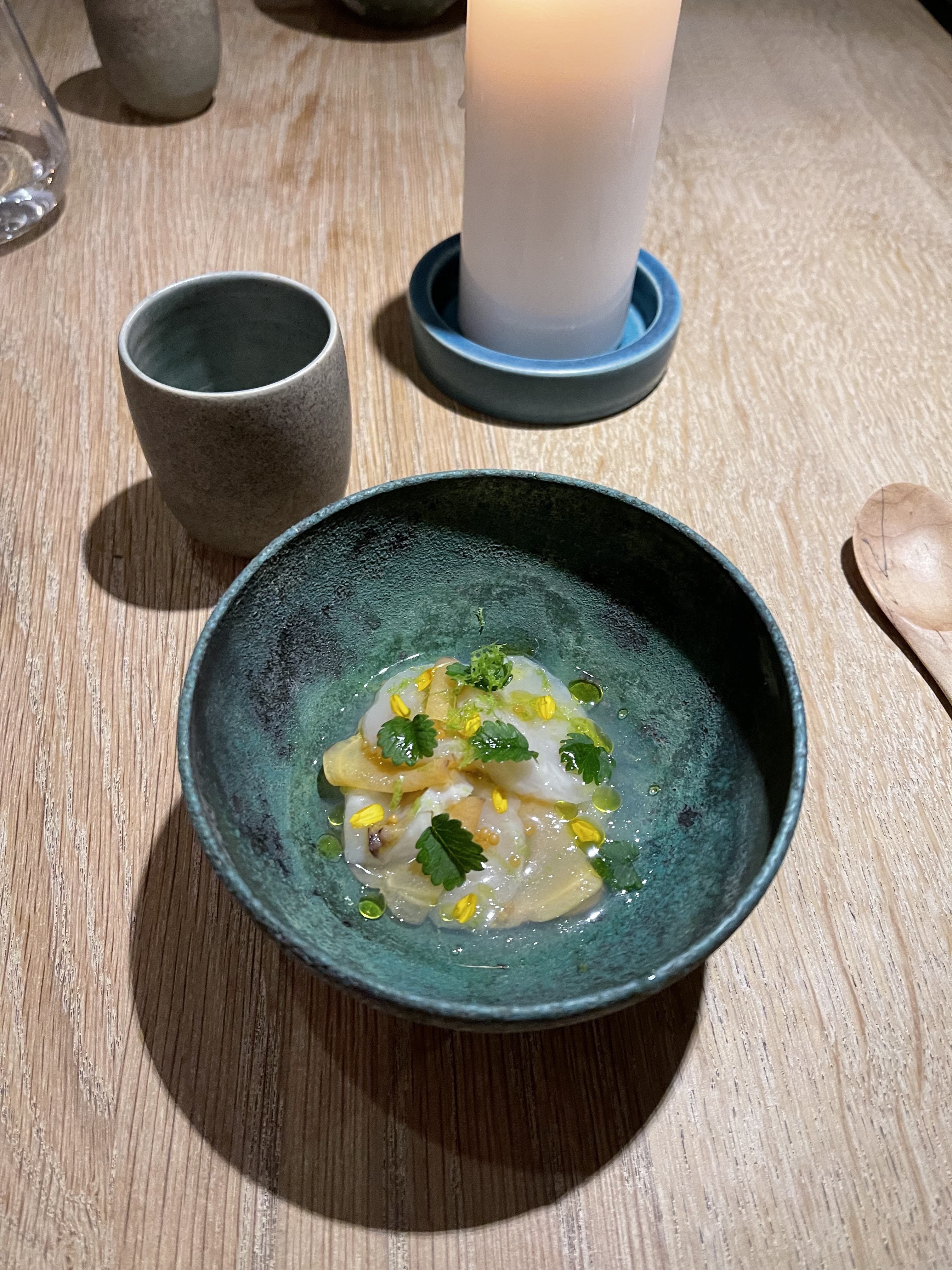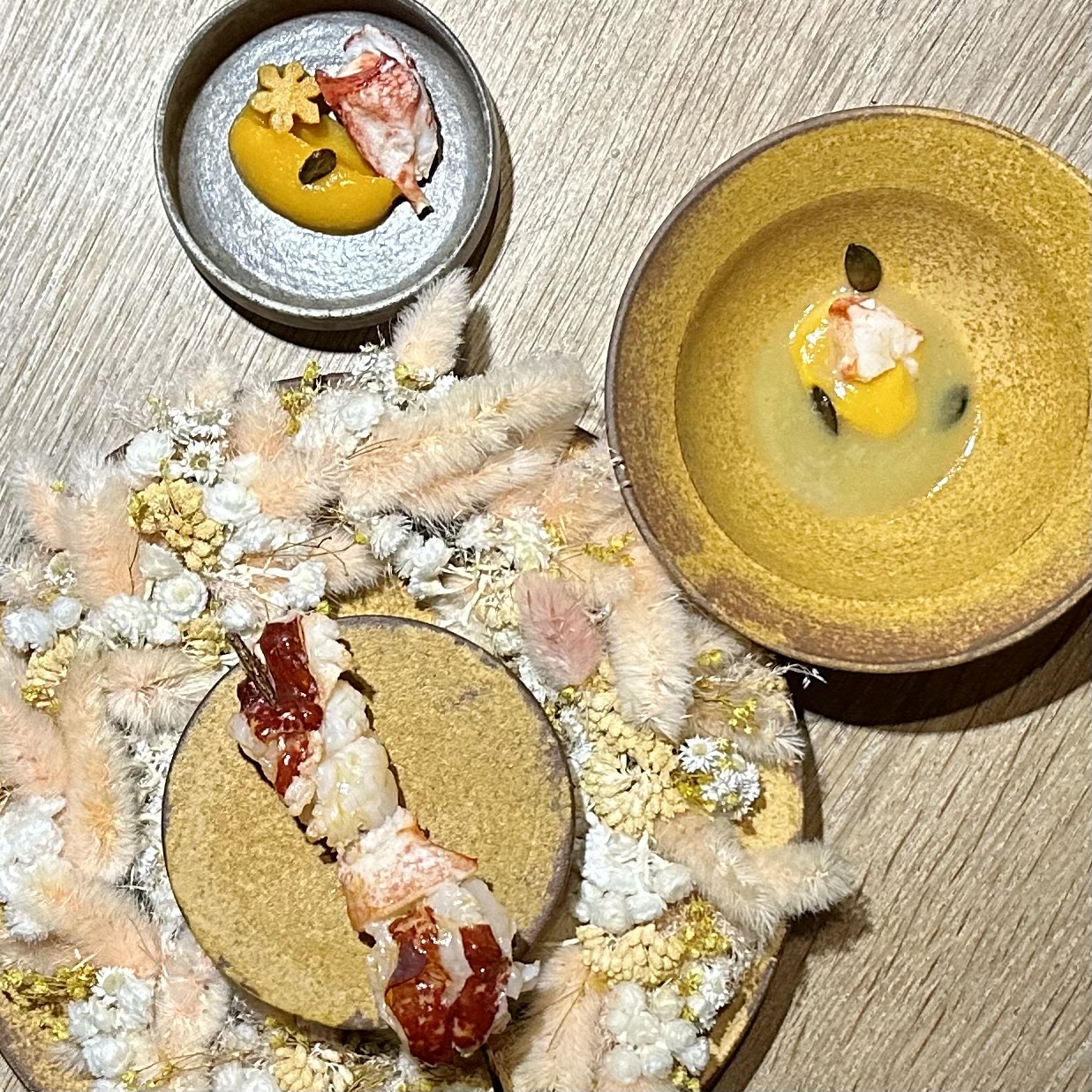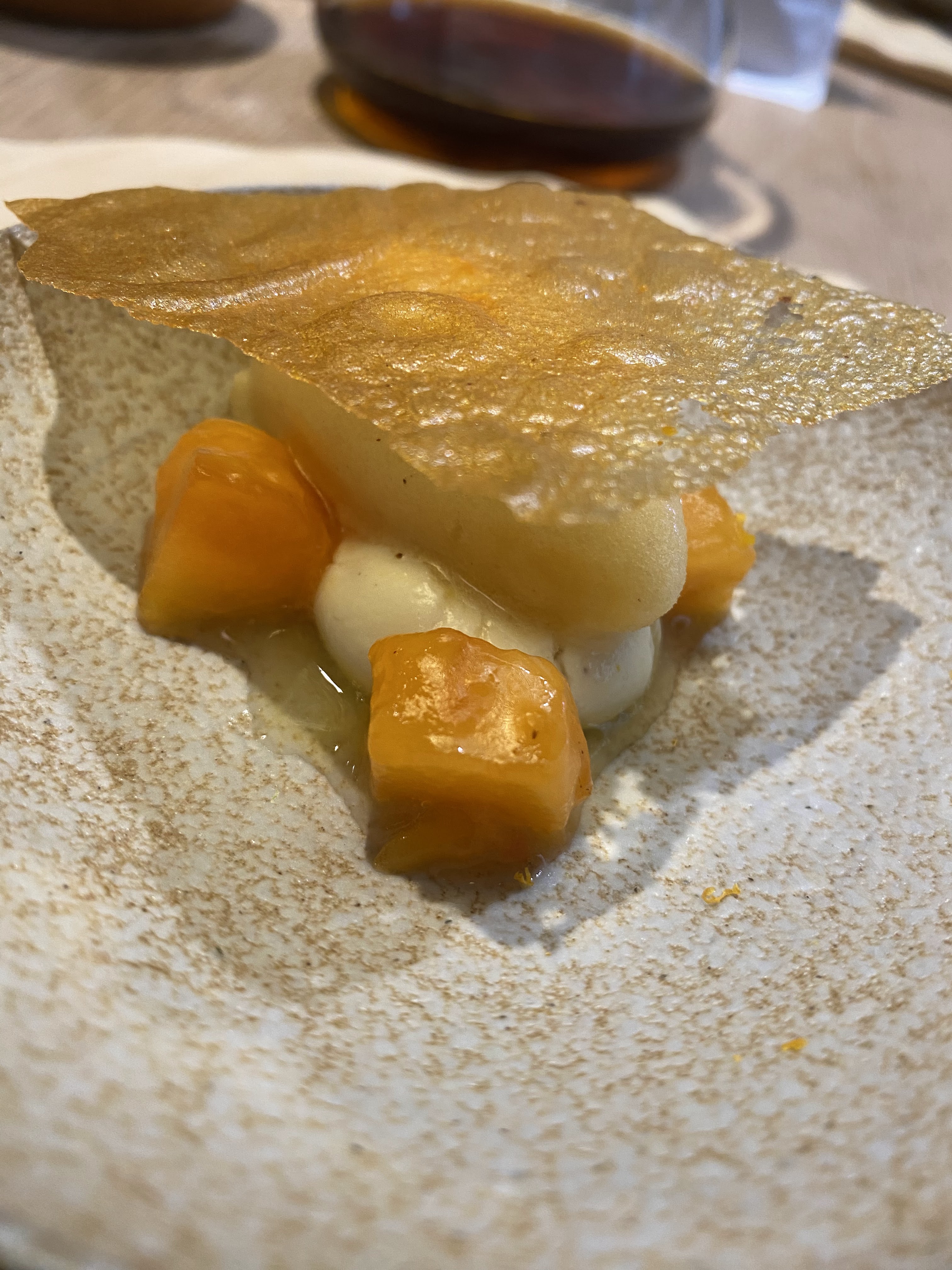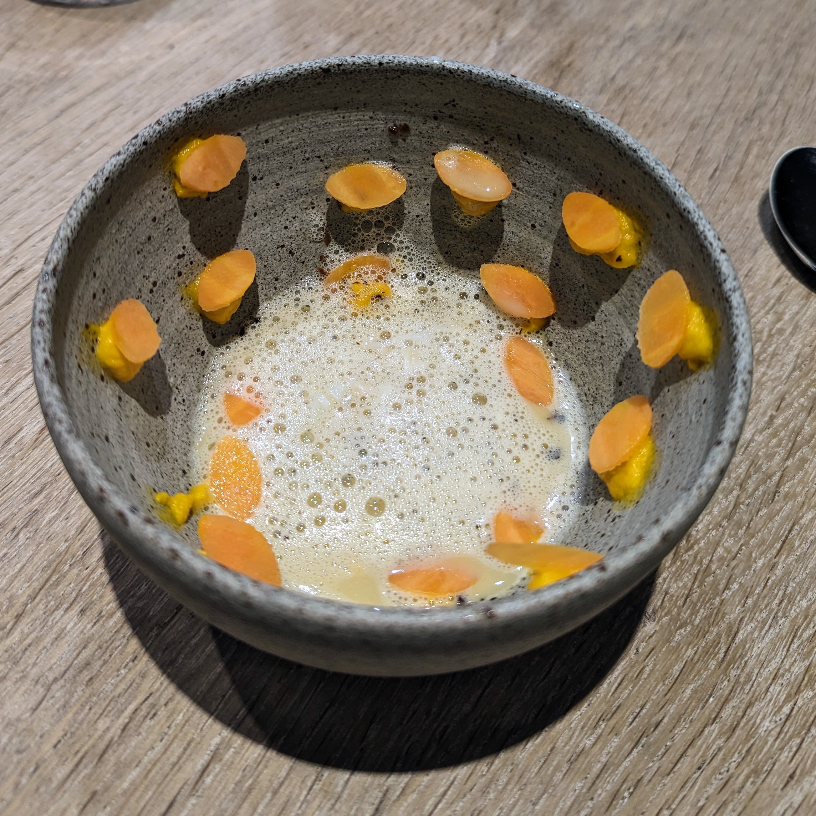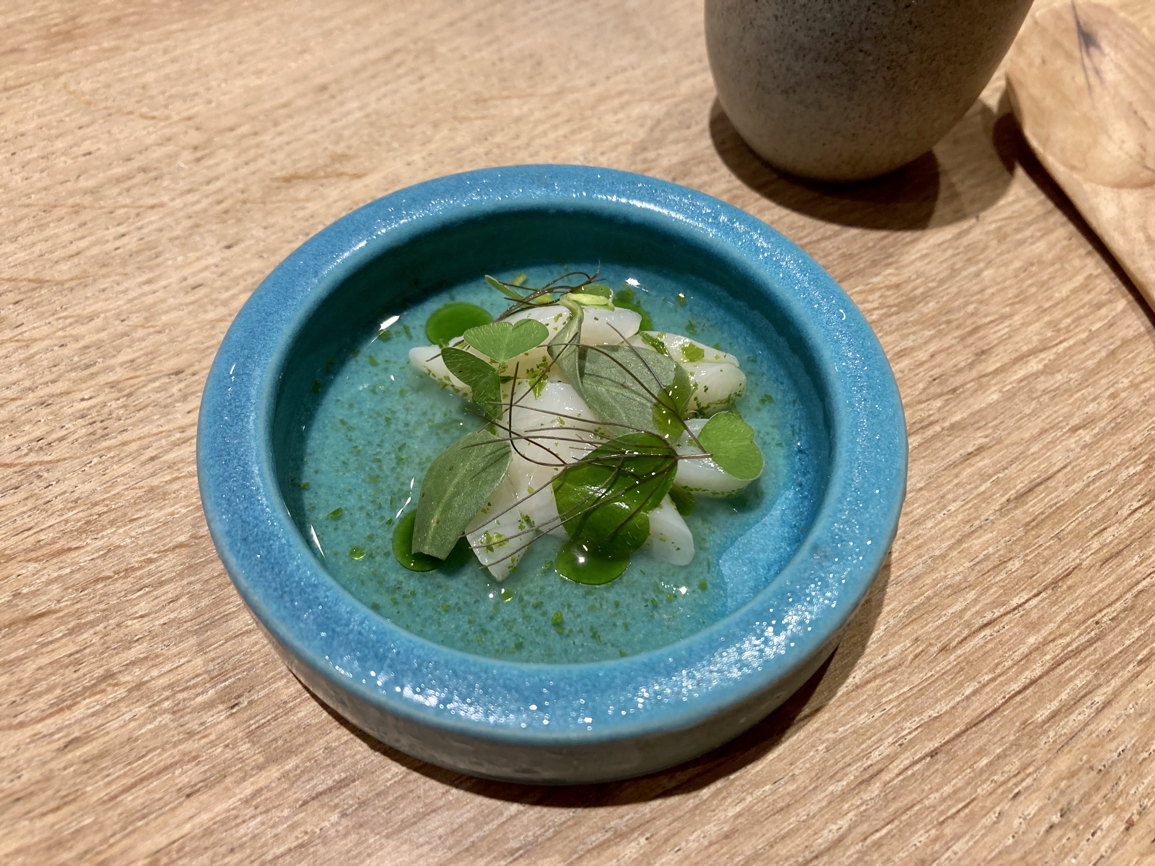 J'ai pu me faufiler pour un déjeuner «sans réservation», dans ce petit restaurant au décor minimaliste et ne comptant que 8 tables. J'ai apprécié les moules fumées avec du pain frit façon Naan, le magret et le gigot de pigeon, et le carpaccio de thon rouge, et bien sûr, le dessert aux soucis (quatre choix), Malheureusement, je n'ai pas été impressionné par le plat signature (crabe-araignée), même s'il était techniquement astucieux. Mais les serveurs étaient excellents, et par ailleurs je me suis régalé… J'y retournerai. / I was able to sneak in for a no-reservation lunch, in this small minimalist decor restaurant with only 8 tables. I enjoyed the smoked mussels with Naan style fried bread, the pigeon breast and leg, and the red tuna carpaccio, and of course, the marigold dessert (four choices), Unfortunately, I was not impressed with the signature dish (spider crab), although it was technically clever. But the servers were excellent, and I otherwise enjoyed myself… I'll return. 2023 09 08. M1.