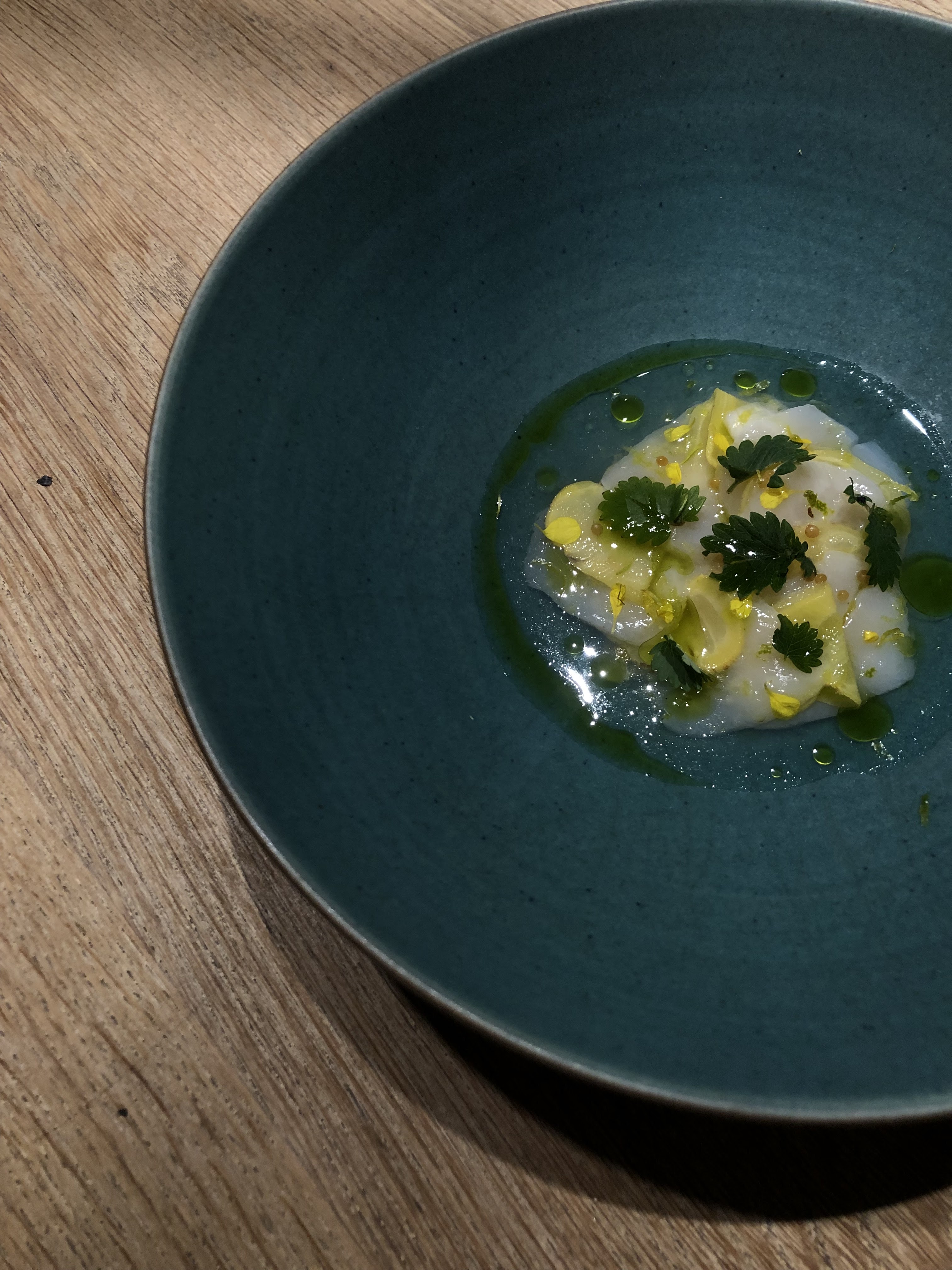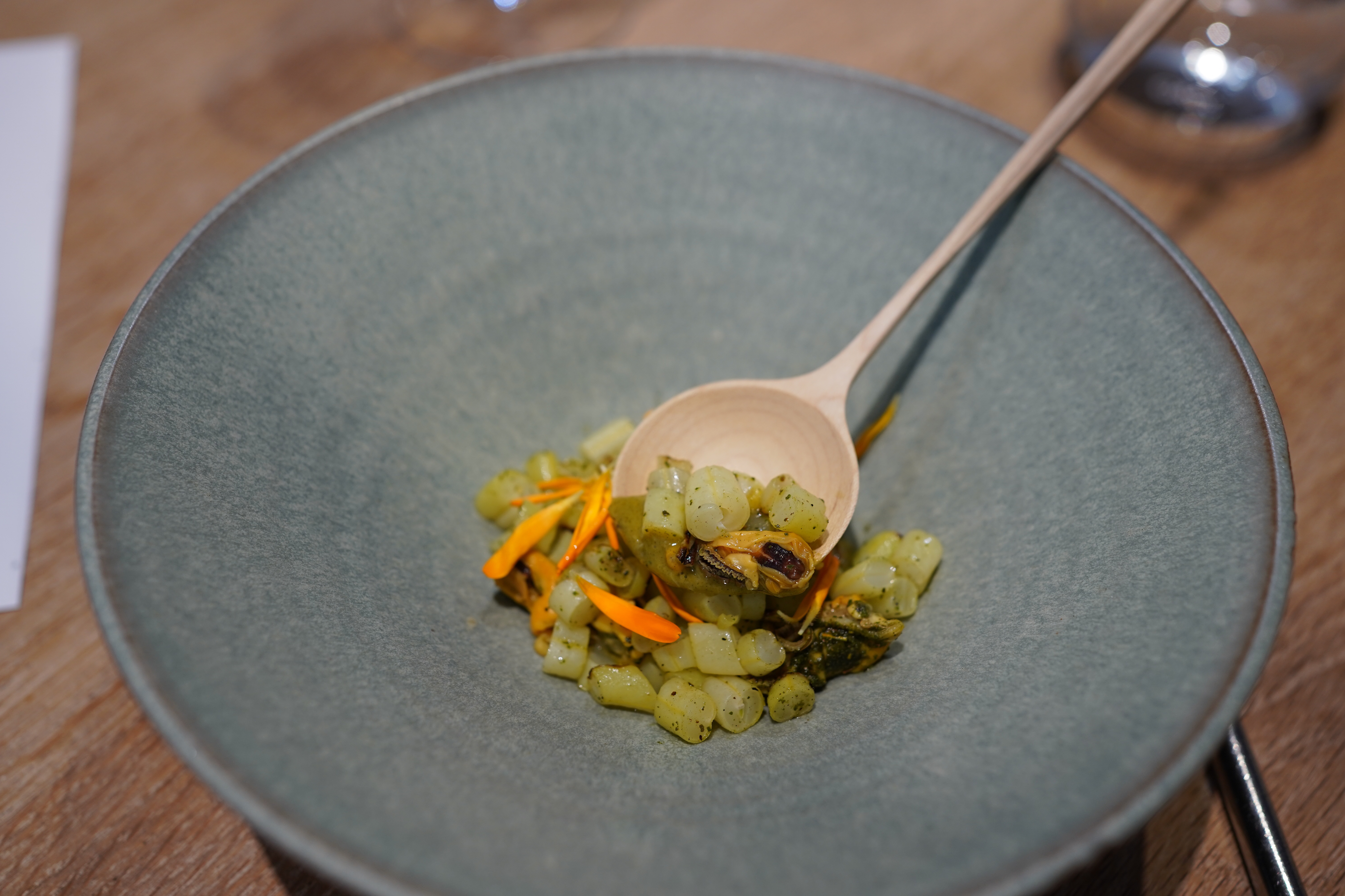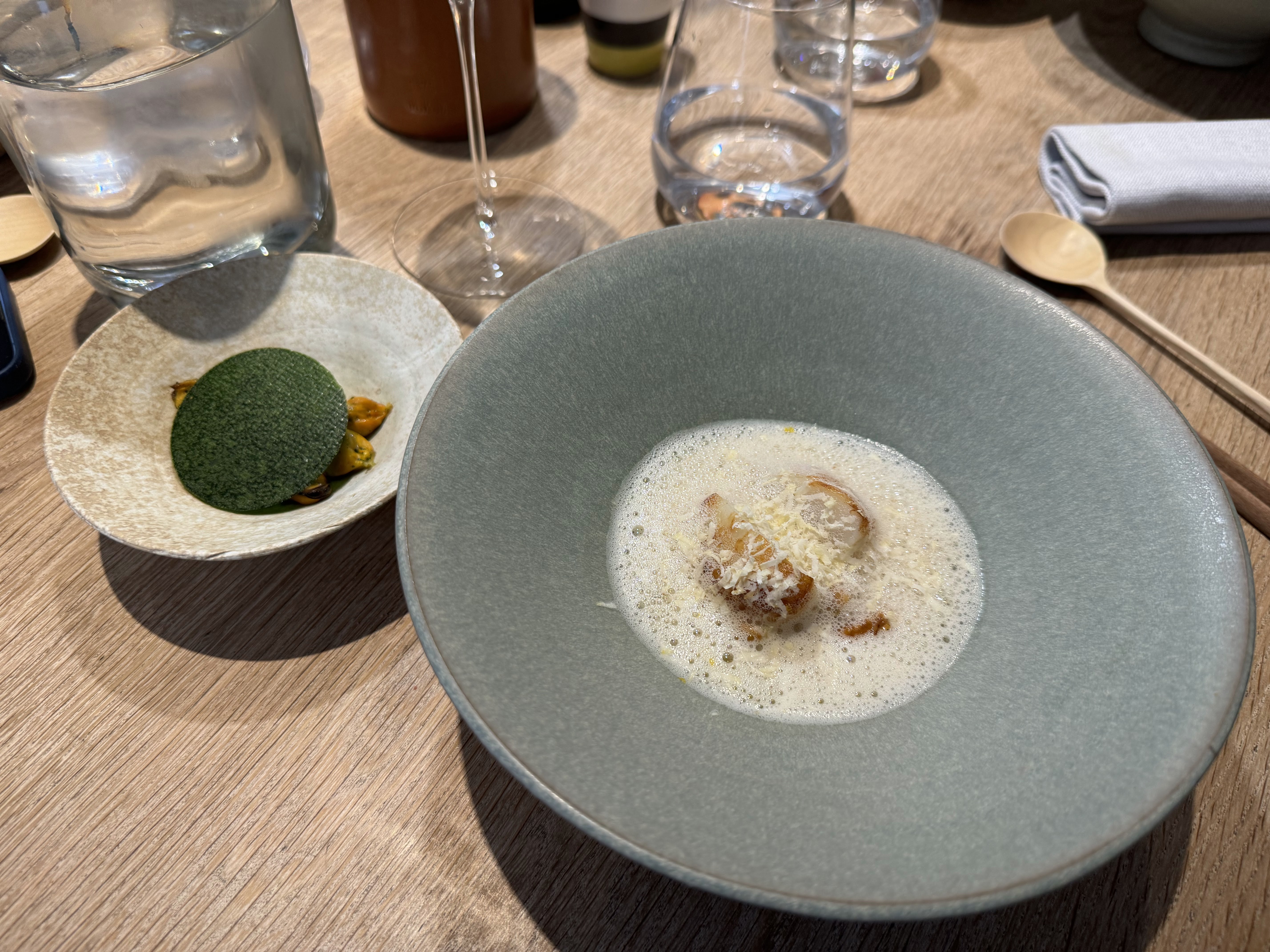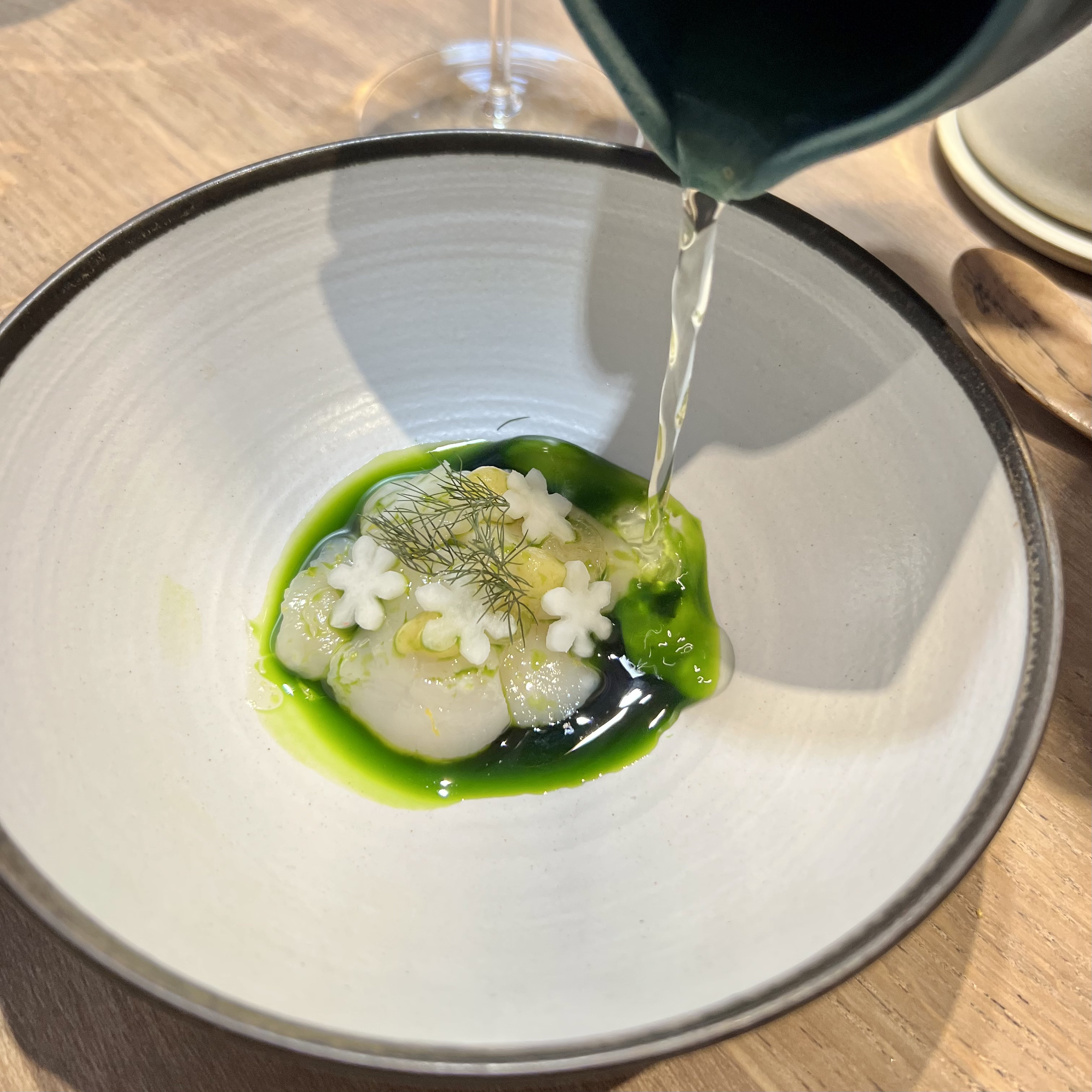 J'ai pu me faufiler pour un déjeuner «sans réservation», dans ce petit restaurant au décor minimaliste et ne comptant que 8 tables. J'ai apprécié les moules fumées avec du pain frit façon Naan, le magret et le gigot de pigeon, et le carpaccio de thon rouge, et bien sûr, le dessert aux soucis (quatre choix), Malheureusement, je n'ai pas été impressionné par le plat signature (crabe-araignée), même s'il était techniquement astucieux. Mais les serveurs étaient excellents, et par ailleurs je me suis régalé… J'y retournerai. / I was able to sneak in for a no-reservation lunch, in this small minimalist decor restaurant with only 8 tables. I enjoyed the smoked mussels with Naan style fried bread, the pigeon breast and leg, and the red tuna carpaccio, and of course, the marigold dessert (four choices), Unfortunately, I was not impressed with the signature dish (spider crab), although it was technically clever. But the servers were excellent, and I otherwise enjoyed myself… I'll return. 2023 09 08. M1.