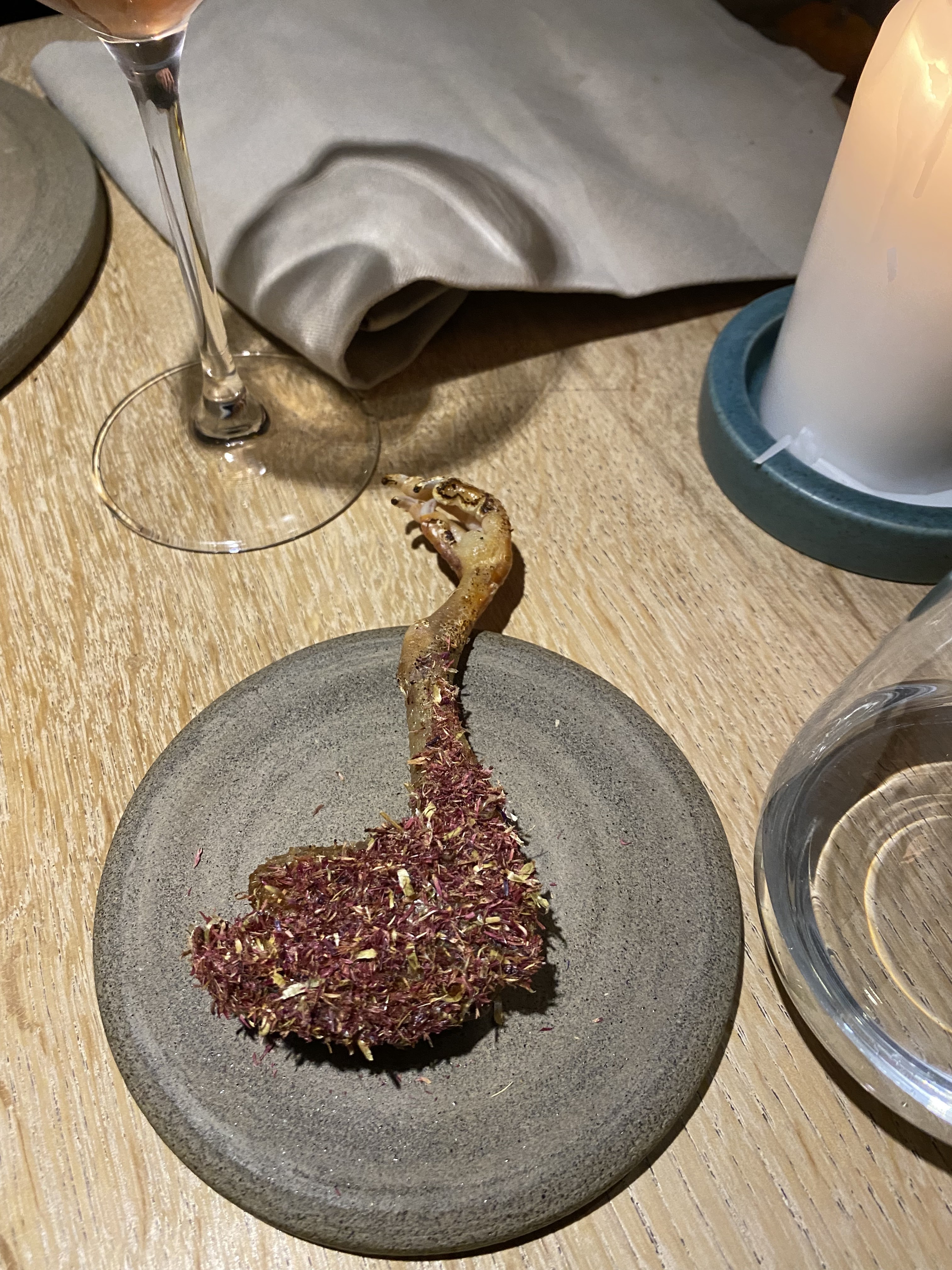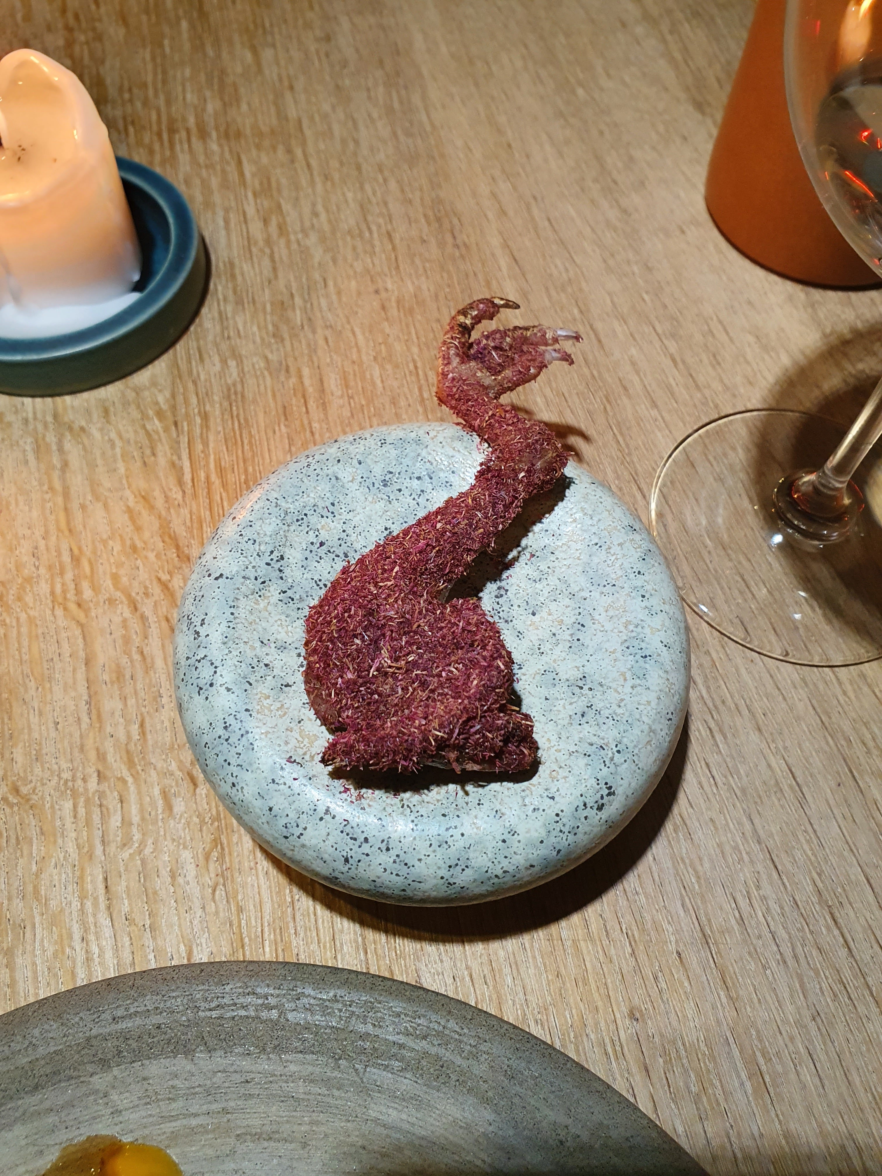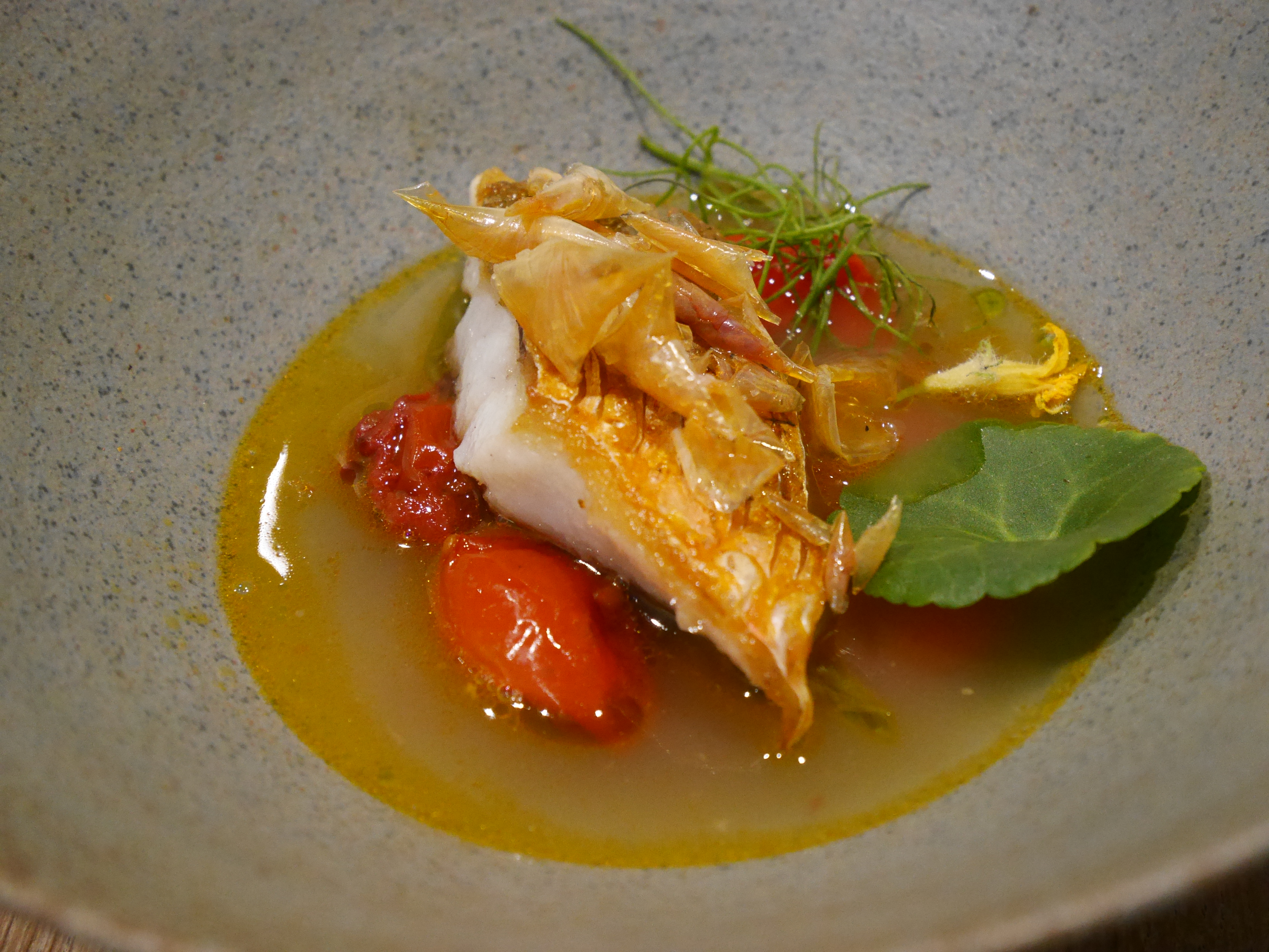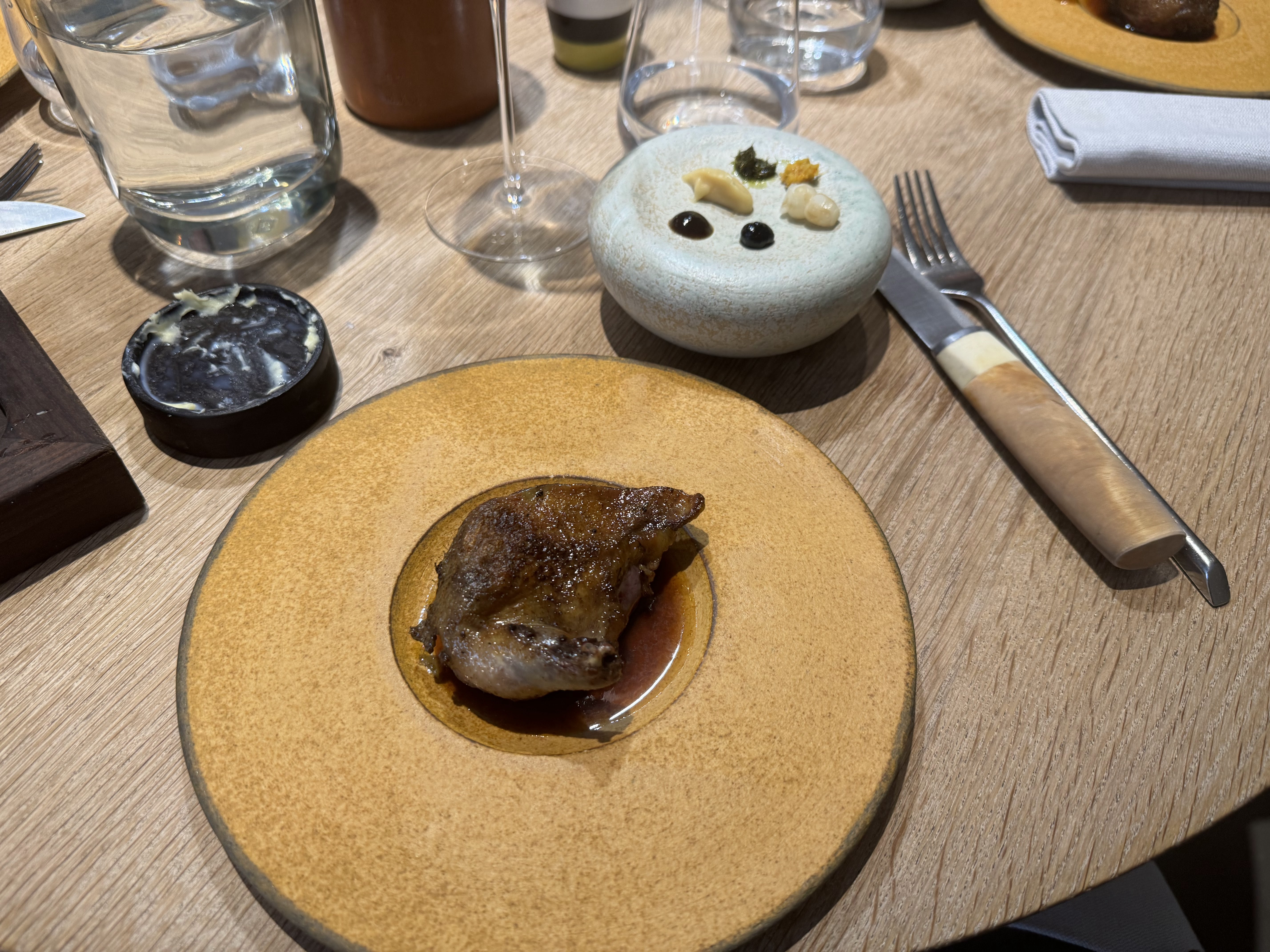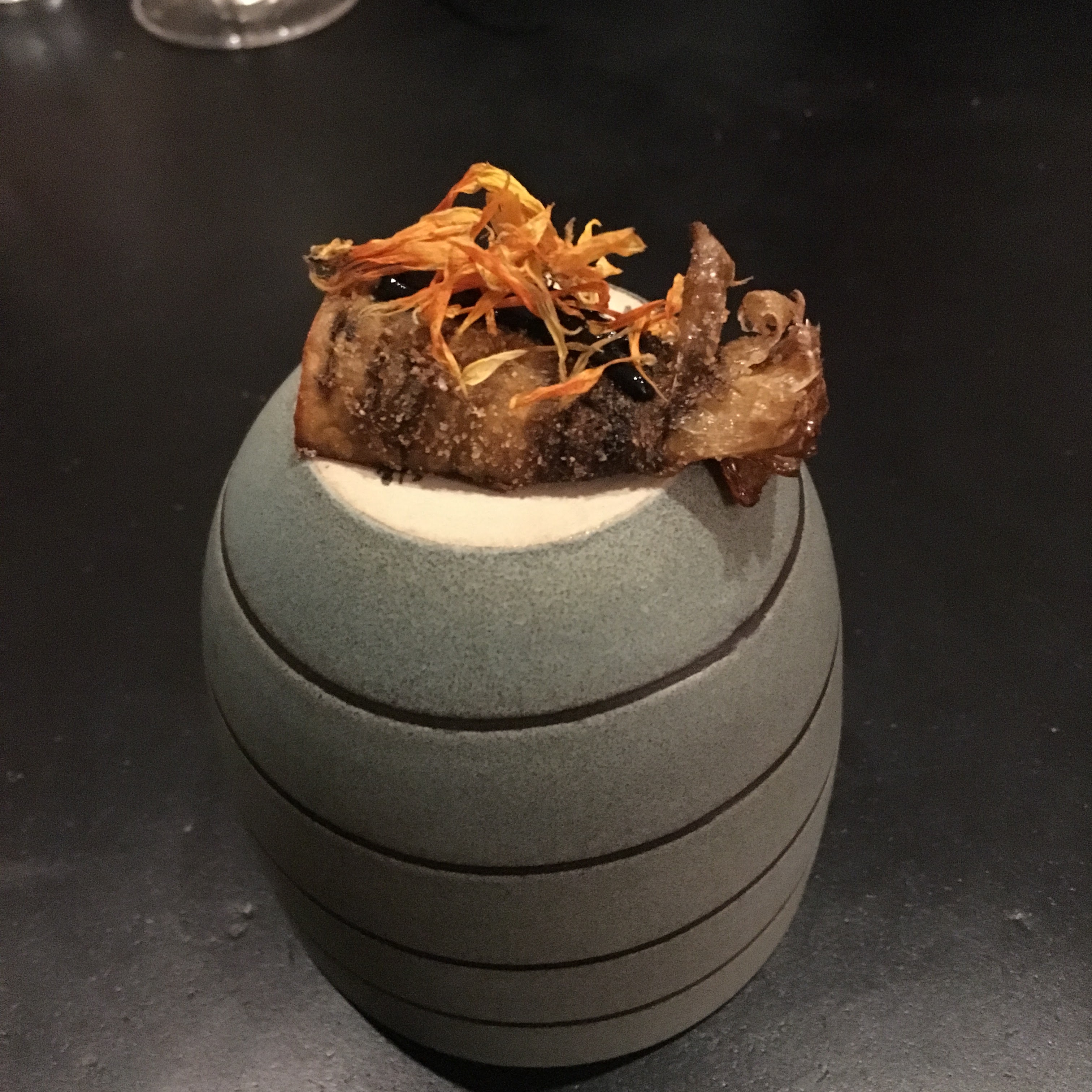 J'ai pu me faufiler pour un déjeuner «sans réservation», dans ce petit restaurant au décor minimaliste et ne comptant que 8 tables. J'ai apprécié les moules fumées avec du pain frit façon Naan, le magret et le gigot de pigeon, et le carpaccio de thon rouge, et bien sûr, le dessert aux soucis (quatre choix), Malheureusement, je n'ai pas été impressionné par le plat signature (crabe-araignée), même s'il était techniquement astucieux. Mais les serveurs étaient excellents, et par ailleurs je me suis régalé… J'y retournerai. / I was able to sneak in for a no-reservation lunch, in this small minimalist decor restaurant with only 8 tables. I enjoyed the smoked mussels with Naan style fried bread, the pigeon breast and leg, and the red tuna carpaccio, and of course, the marigold dessert (four choices), Unfortunately, I was not impressed with the signature dish (spider crab), although it was technically clever. But the servers were excellent, and I otherwise enjoyed myself… I'll return. 2023 09 08. M1.
