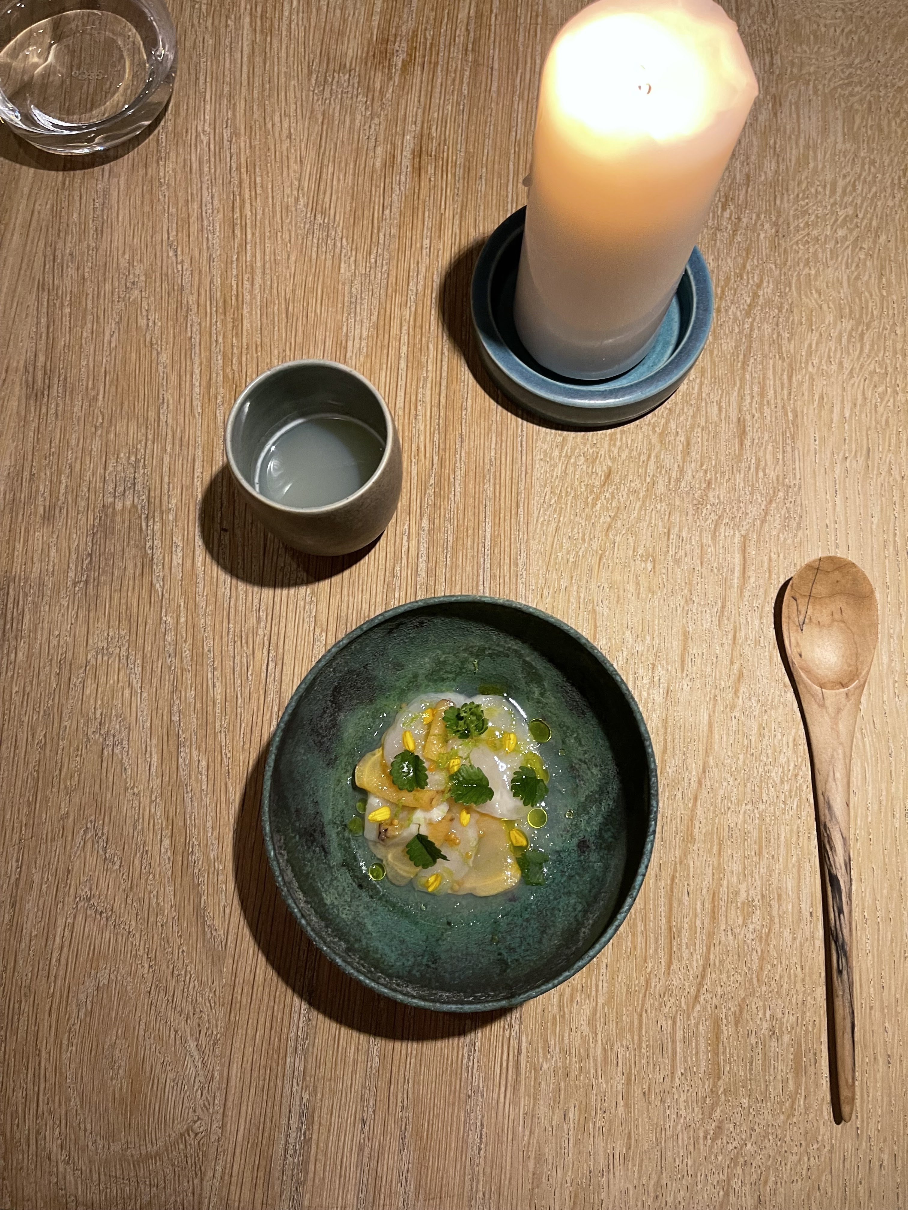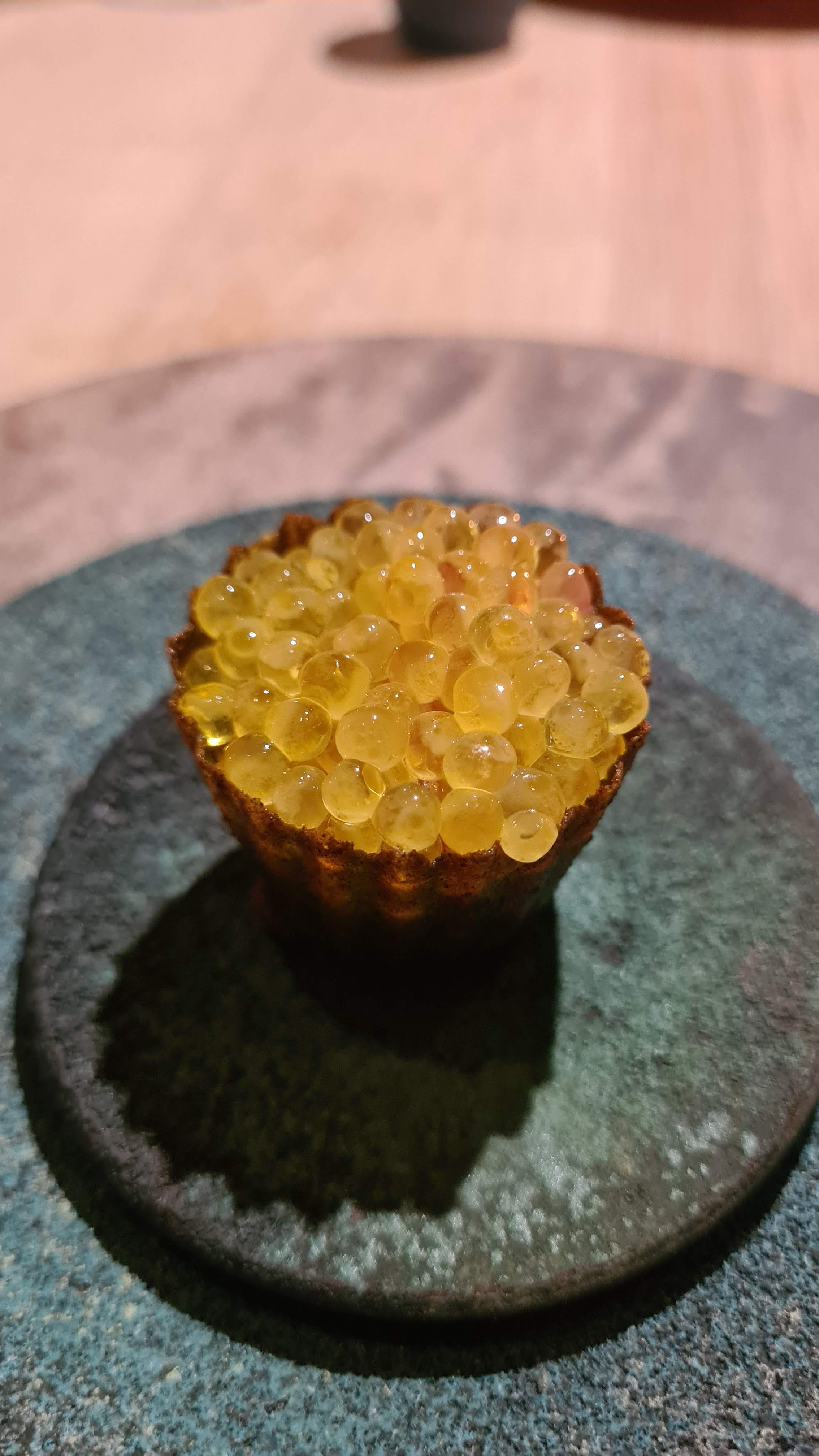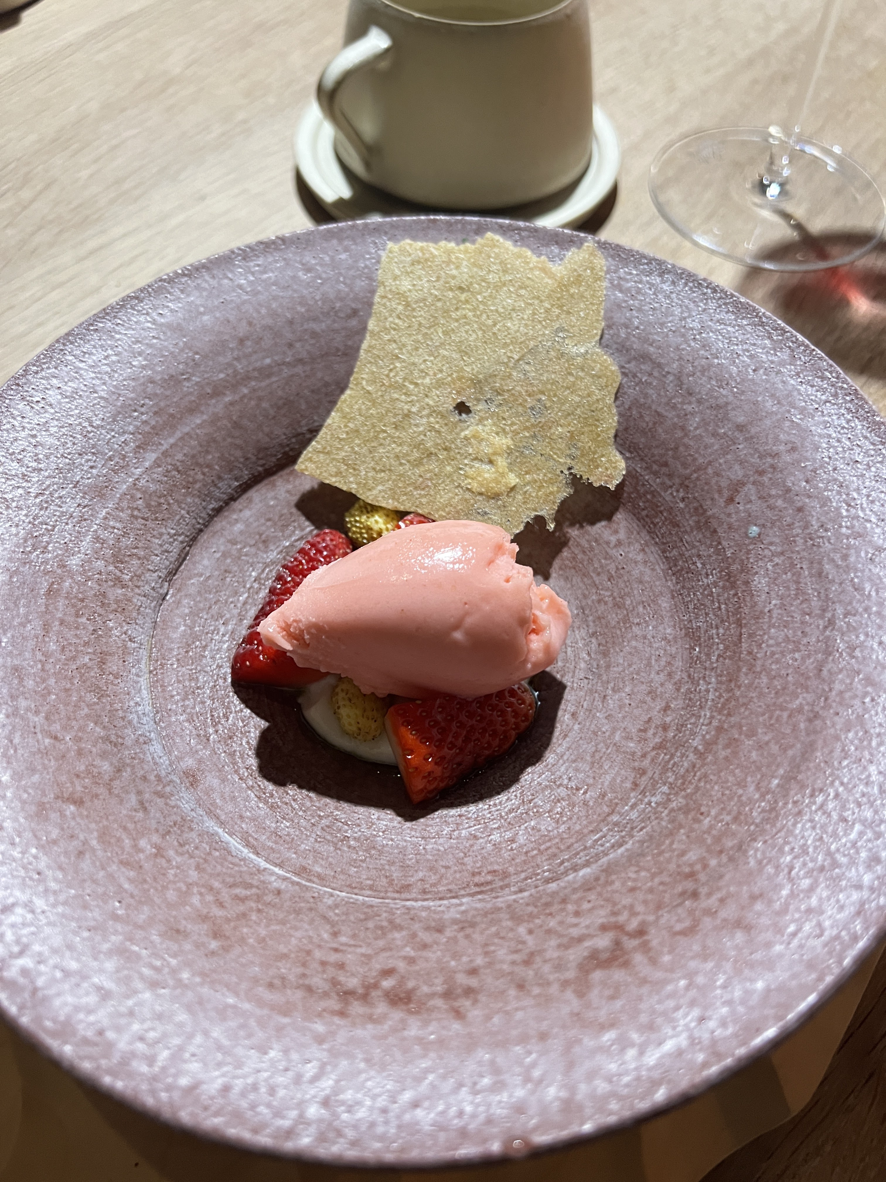 A.T était une fête dans nos bouches ! C'était probablement l'une des meilleures expériences de menu de dégustation que nous ayons eues, avec de jolis intérieurs et un service, de belles céramiques faites sur mesure, etc. Le chef Tanaka venu discuter avec nous était la cerise sur le gâteau de cette expérience !