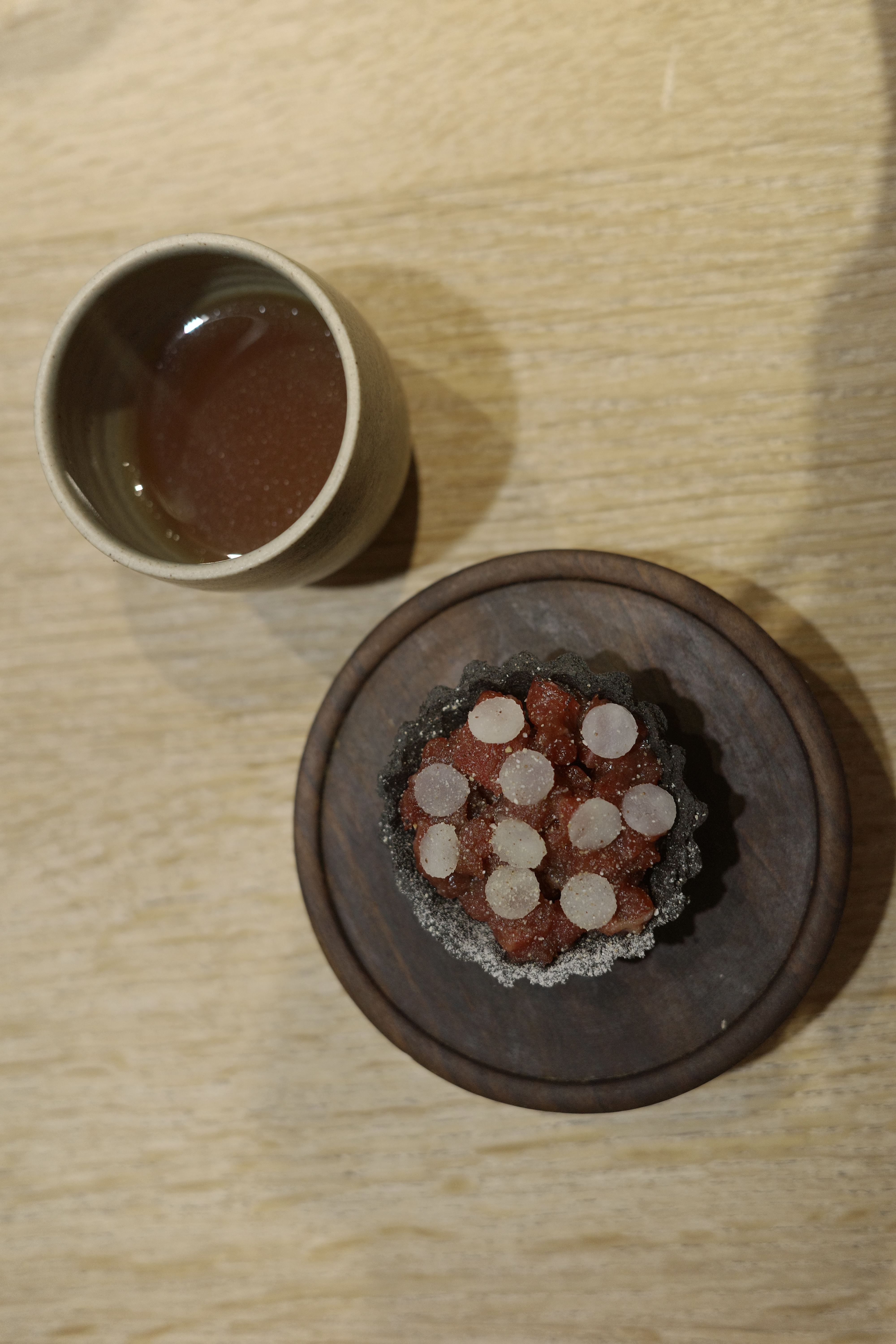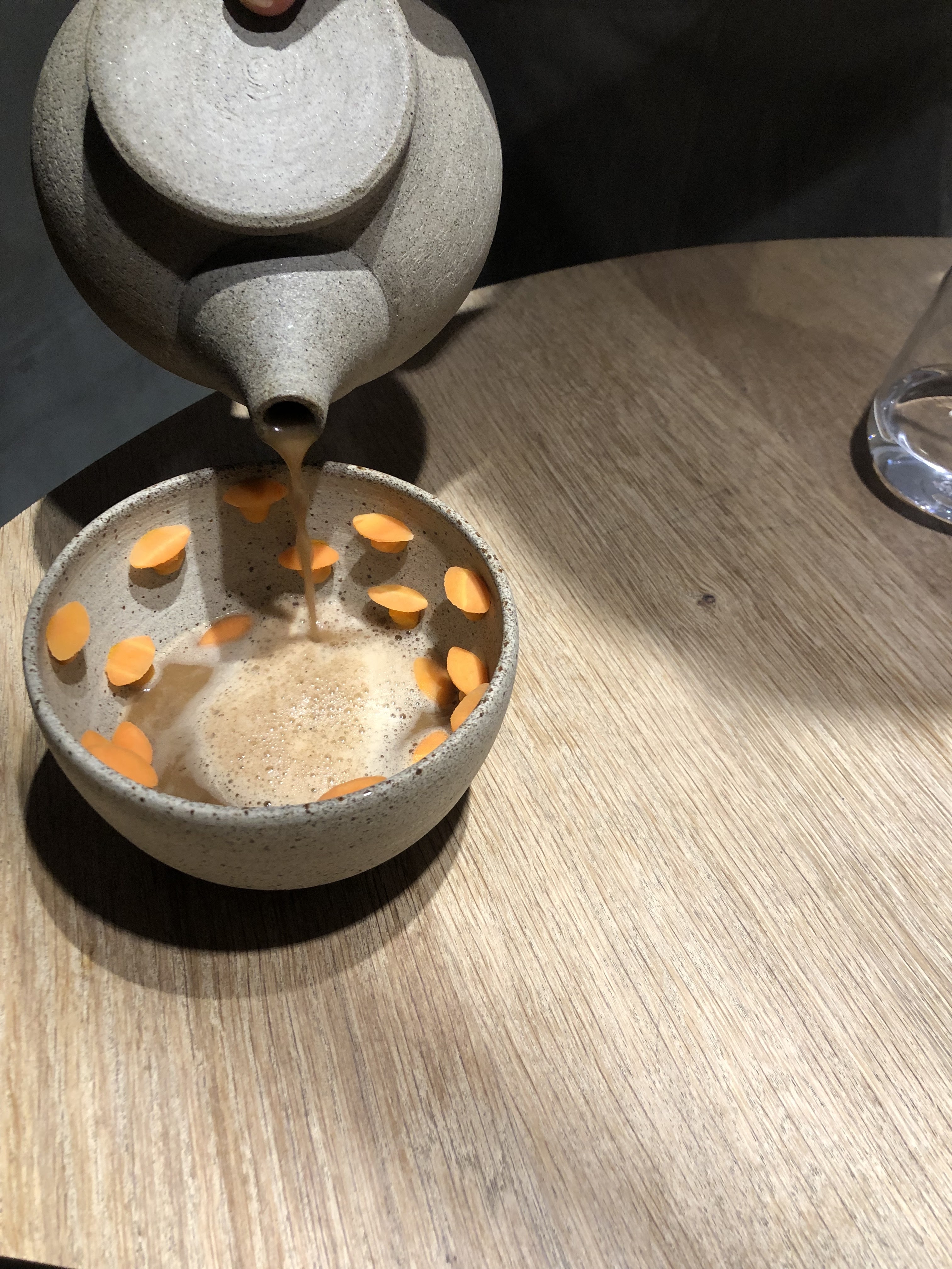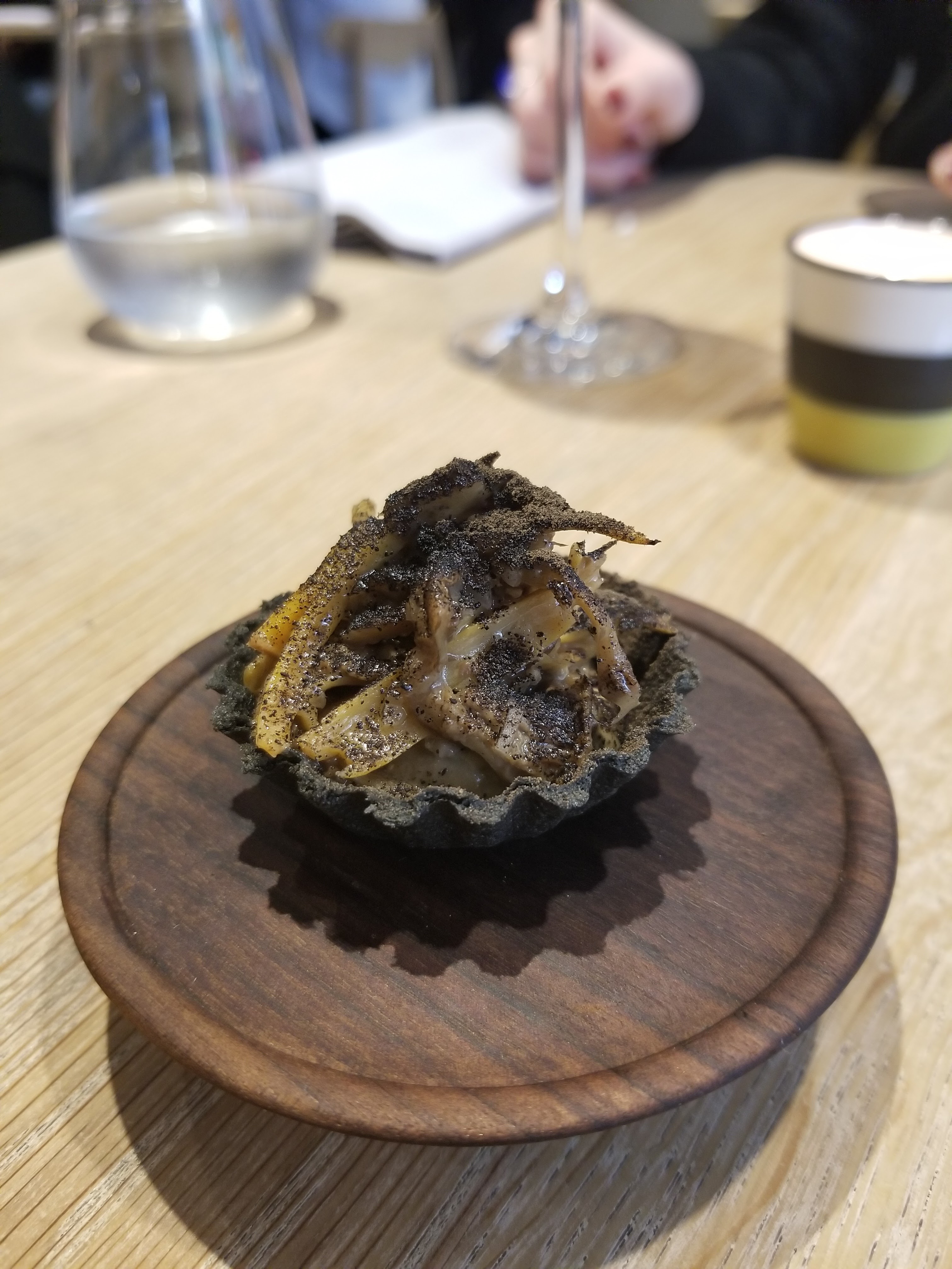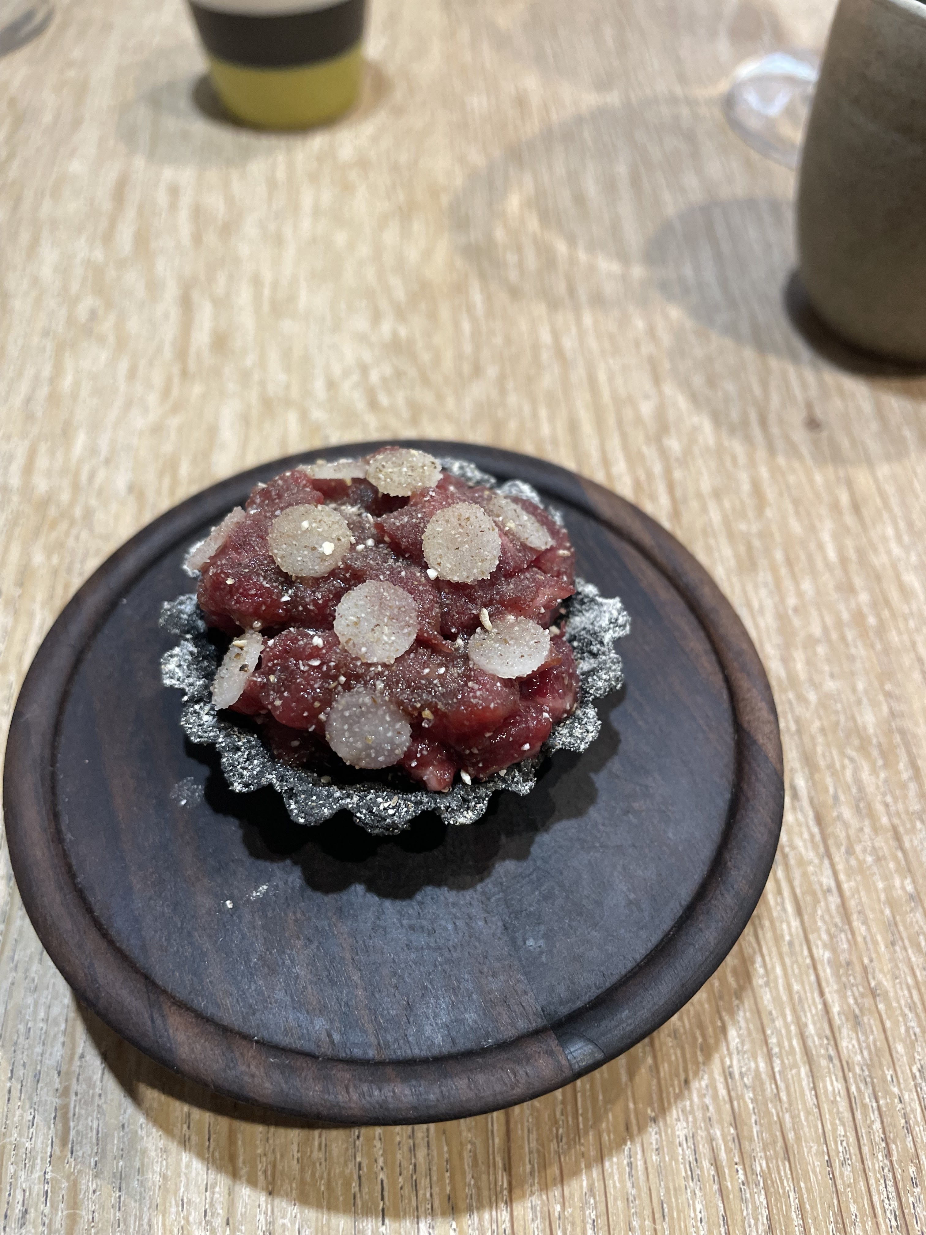 A.T était une fête dans nos bouches ! C'était probablement l'une des meilleures expériences de menu de dégustation que nous ayons eues, avec de jolis intérieurs et un service, de belles céramiques faites sur mesure, etc. Le chef Tanaka venu discuter avec nous était la cerise sur le gâteau de cette expérience !