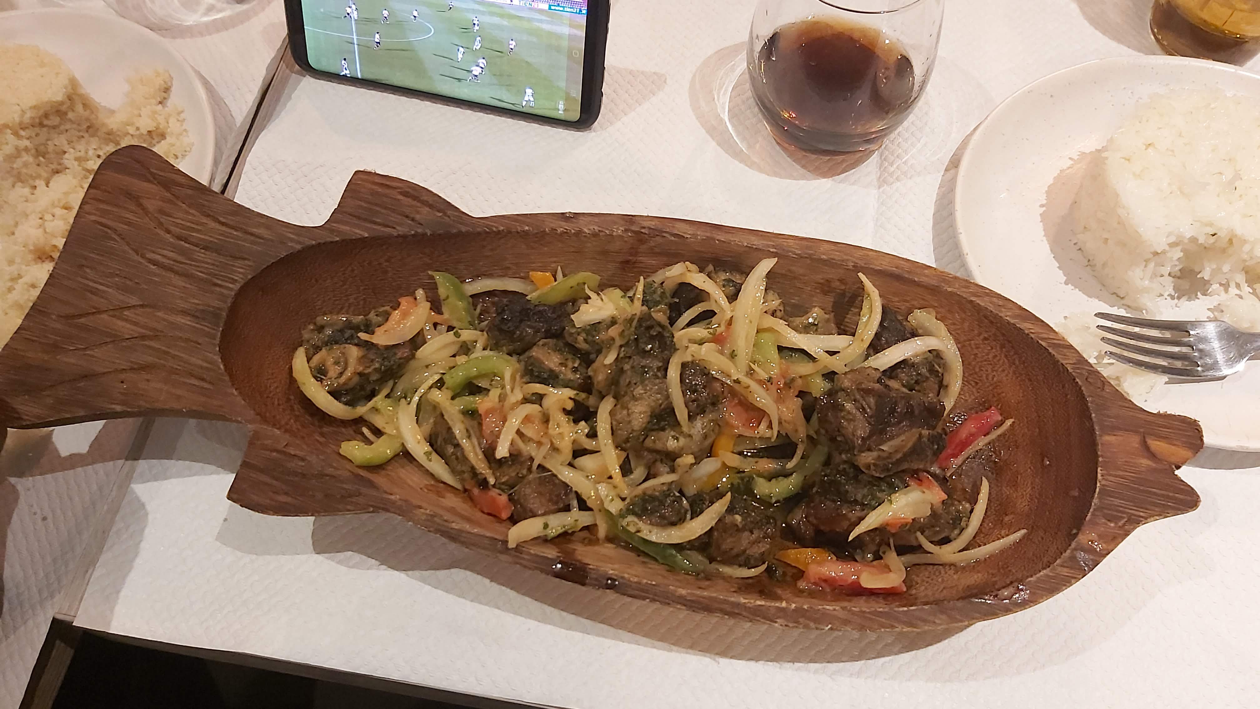 Cuisine nickel nous avons pris des brochettes de bœuf attieke alloco et un poisson tout était bon et les portions étaient bien chargées. En boisson bissap un peu trop sucré sinon ça allait en rajoutant un peu d’eau. Le service très bien on s’occupait bien de nous du début à la fin. Et l’ambiance jour de match de la CAN on a bien rigolé