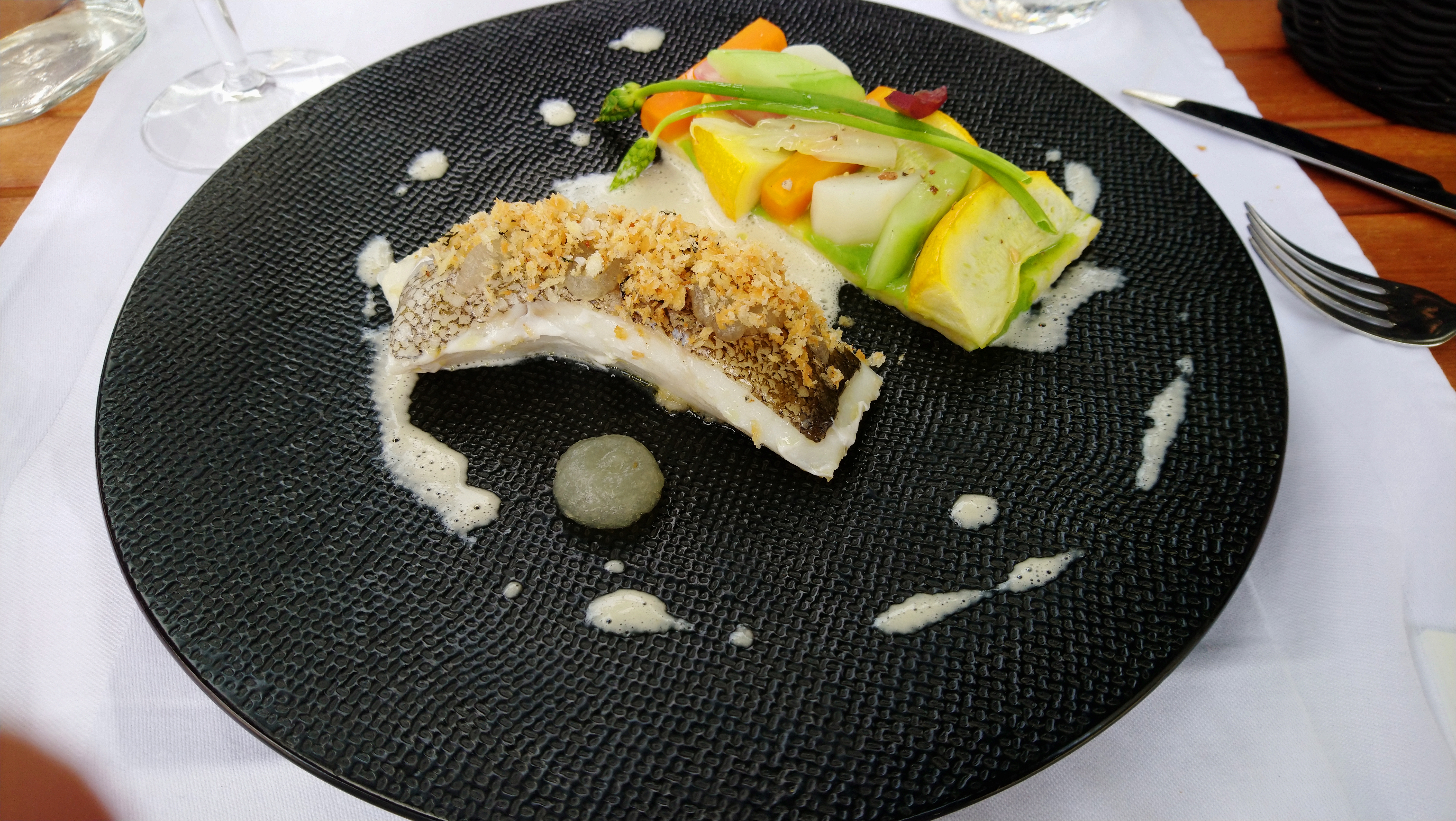 Un dimanche en terrasse à l ombre pour un repas très très bien un cabillaud cuit à la perfection brillant succulent et petits légumes avec aïoli Juste parfait Un dessert merveilleux Franchement une adresse à ne pas manquer Ce jeune cuisinier mérite Vous pouvez y aller sans hésitation Nous reviendrons