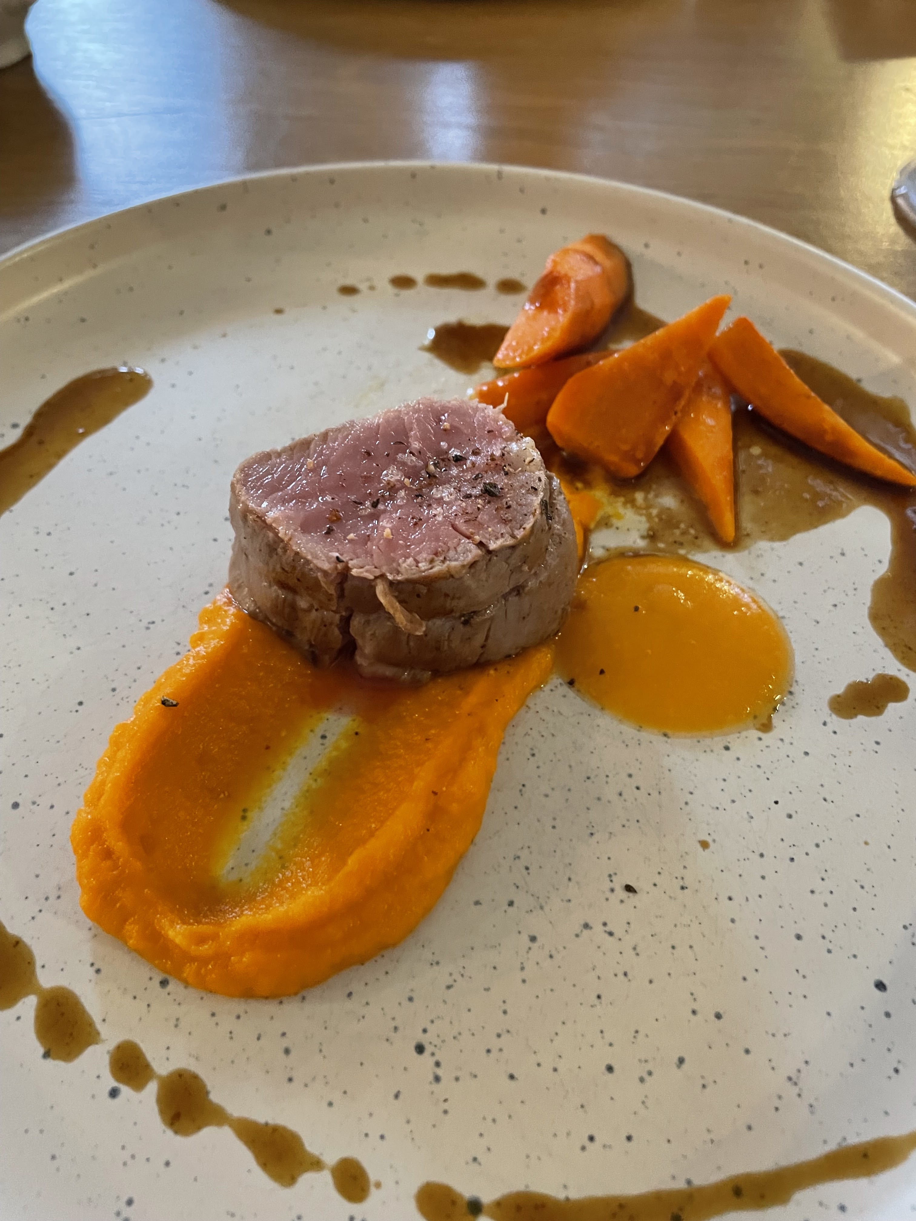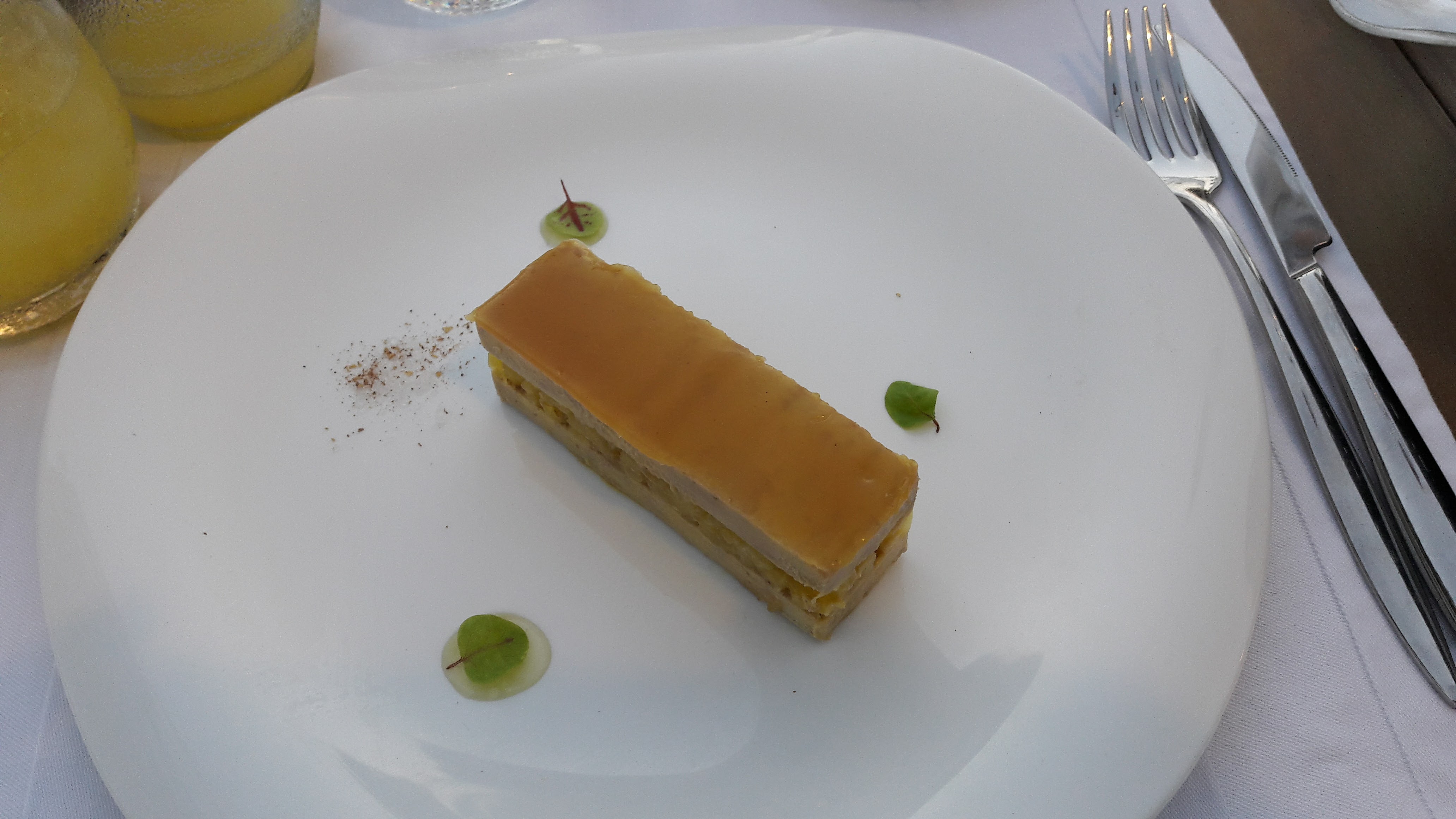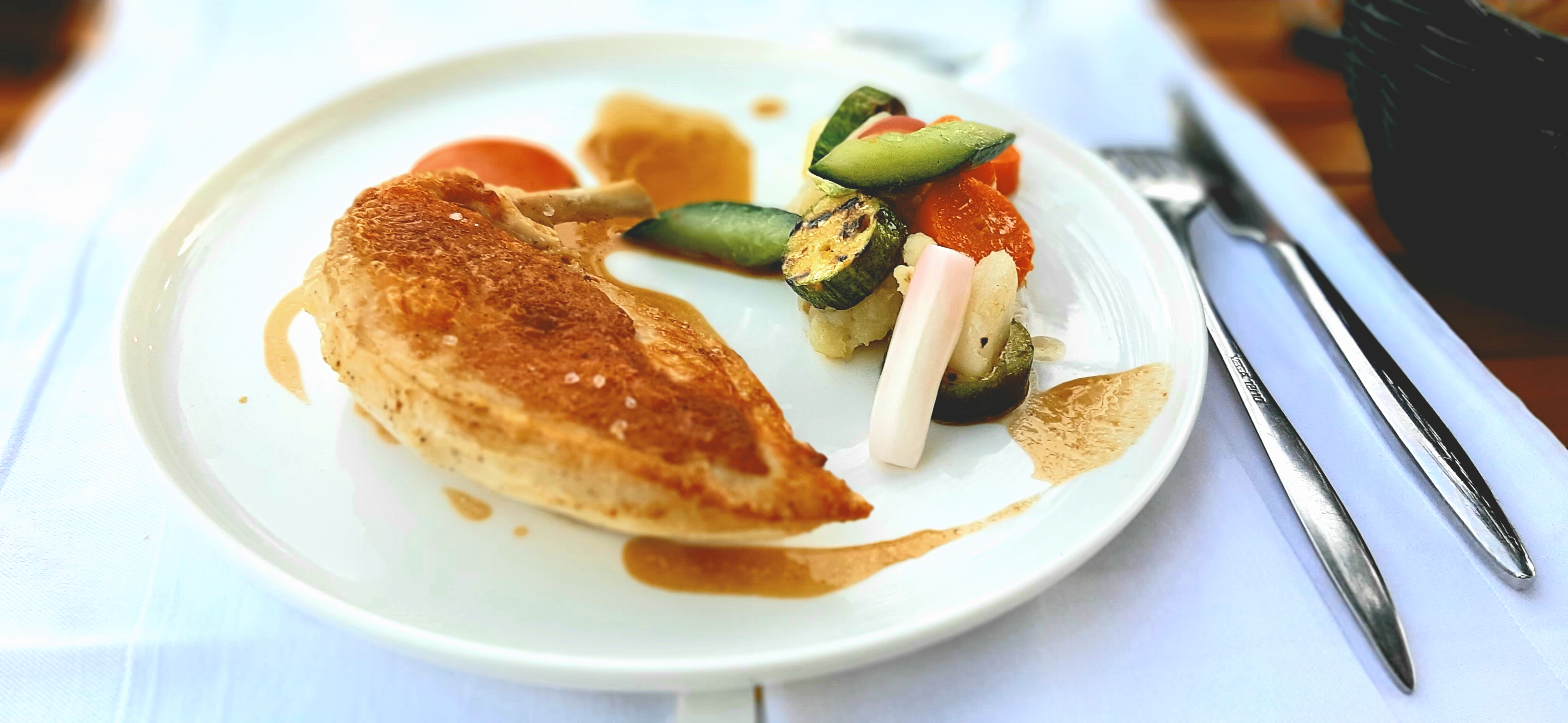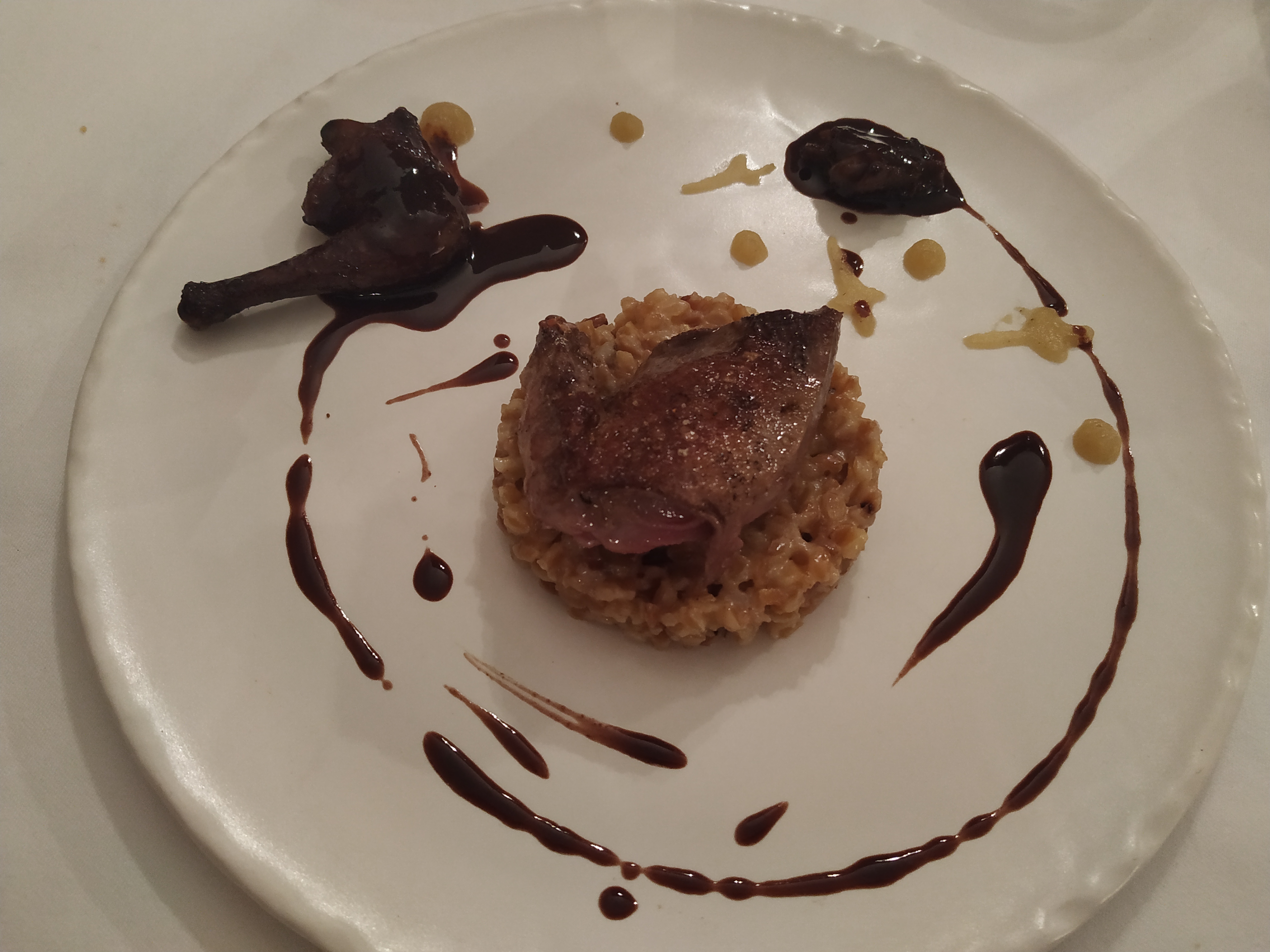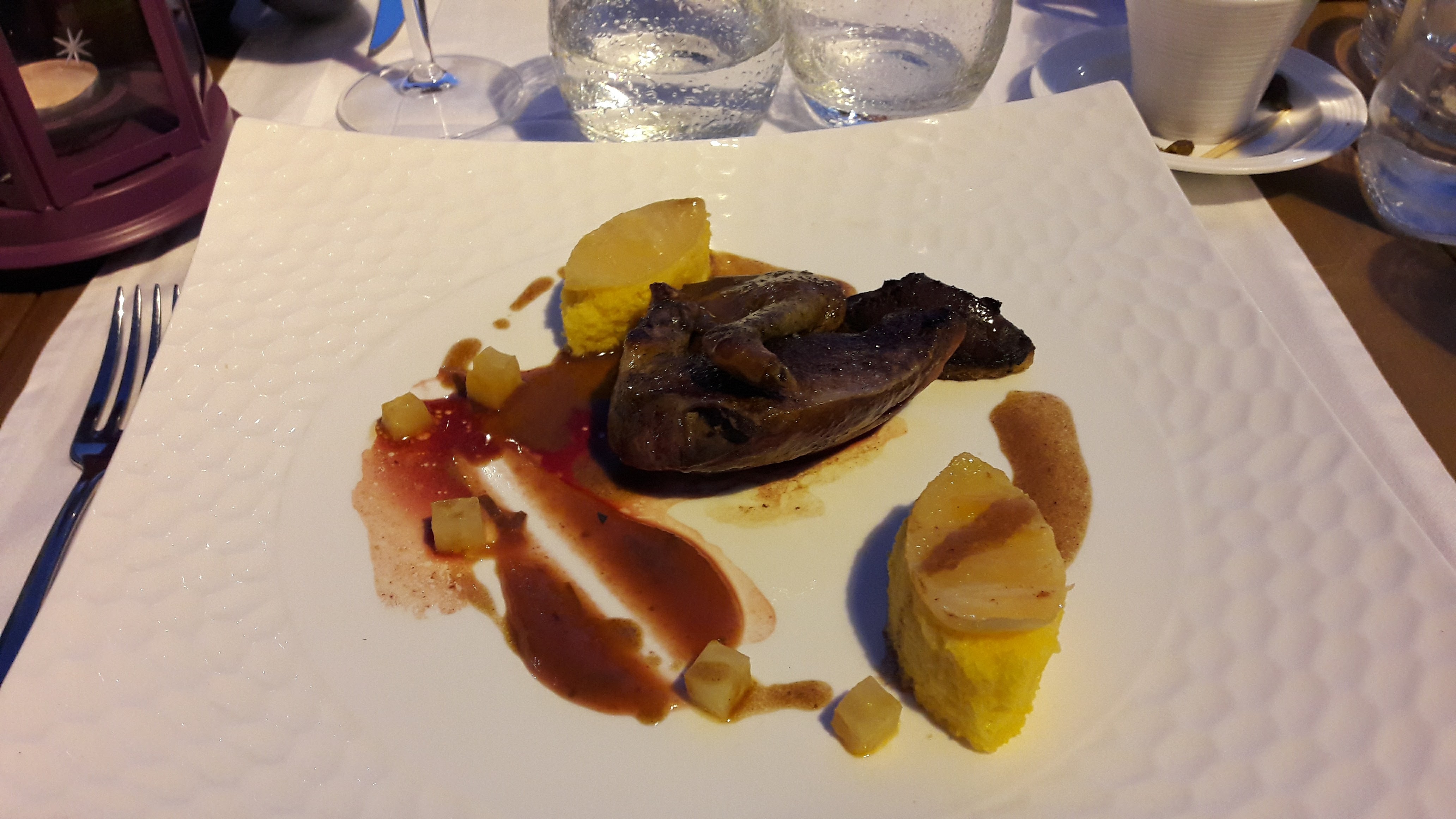 C etait bon et raffiné. Le tout servi avec sourire et gentillesse. Dans l assiette copieuse crème brûlée au foie gras puis cannette cuite comme demandée avec carottes appetissantes. Le dessert une tuerie.