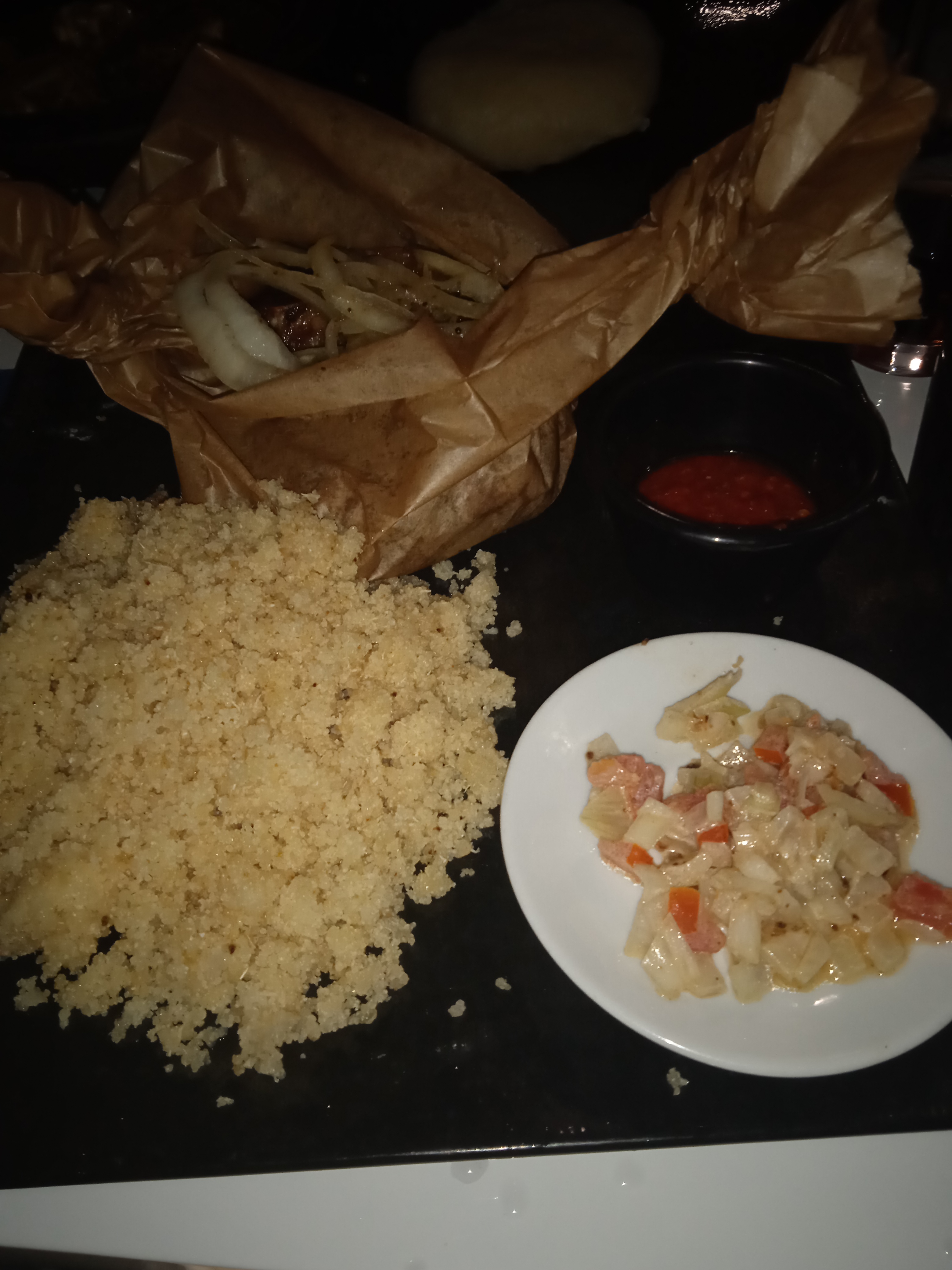 Nous avons goûté le plakali, le foufou, le choukouia, les plantains (aloko) et l’atiéké. Tout était très bon. Je recommande. Et en plus ils ont passé Hotel California.