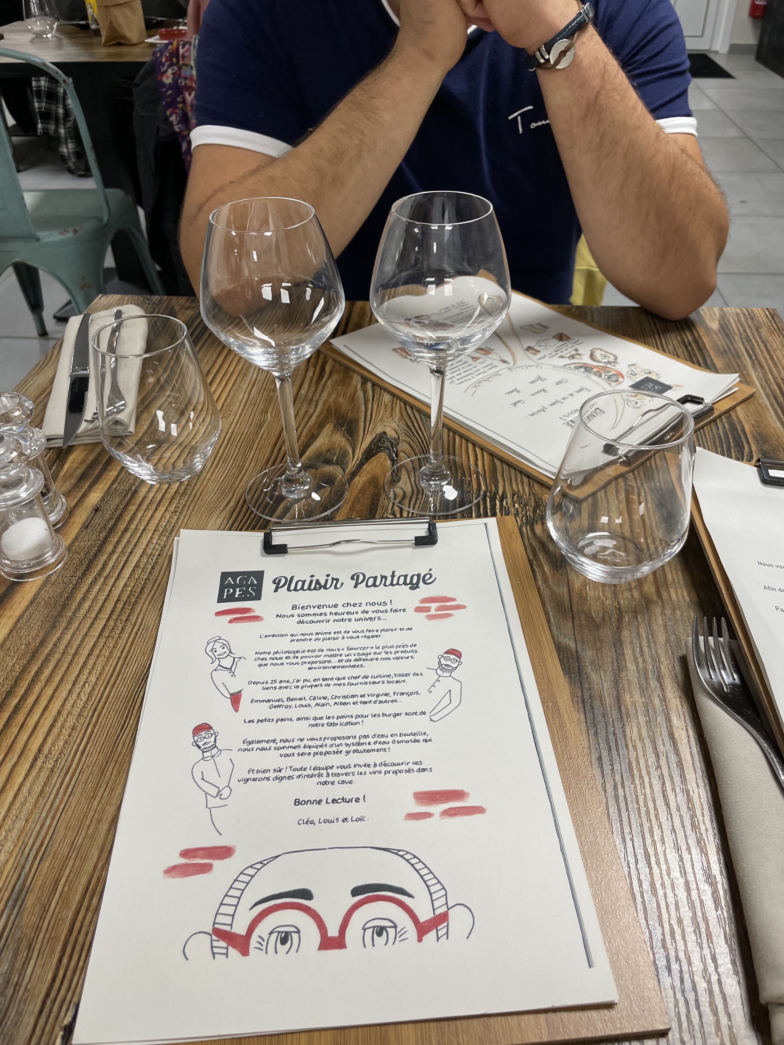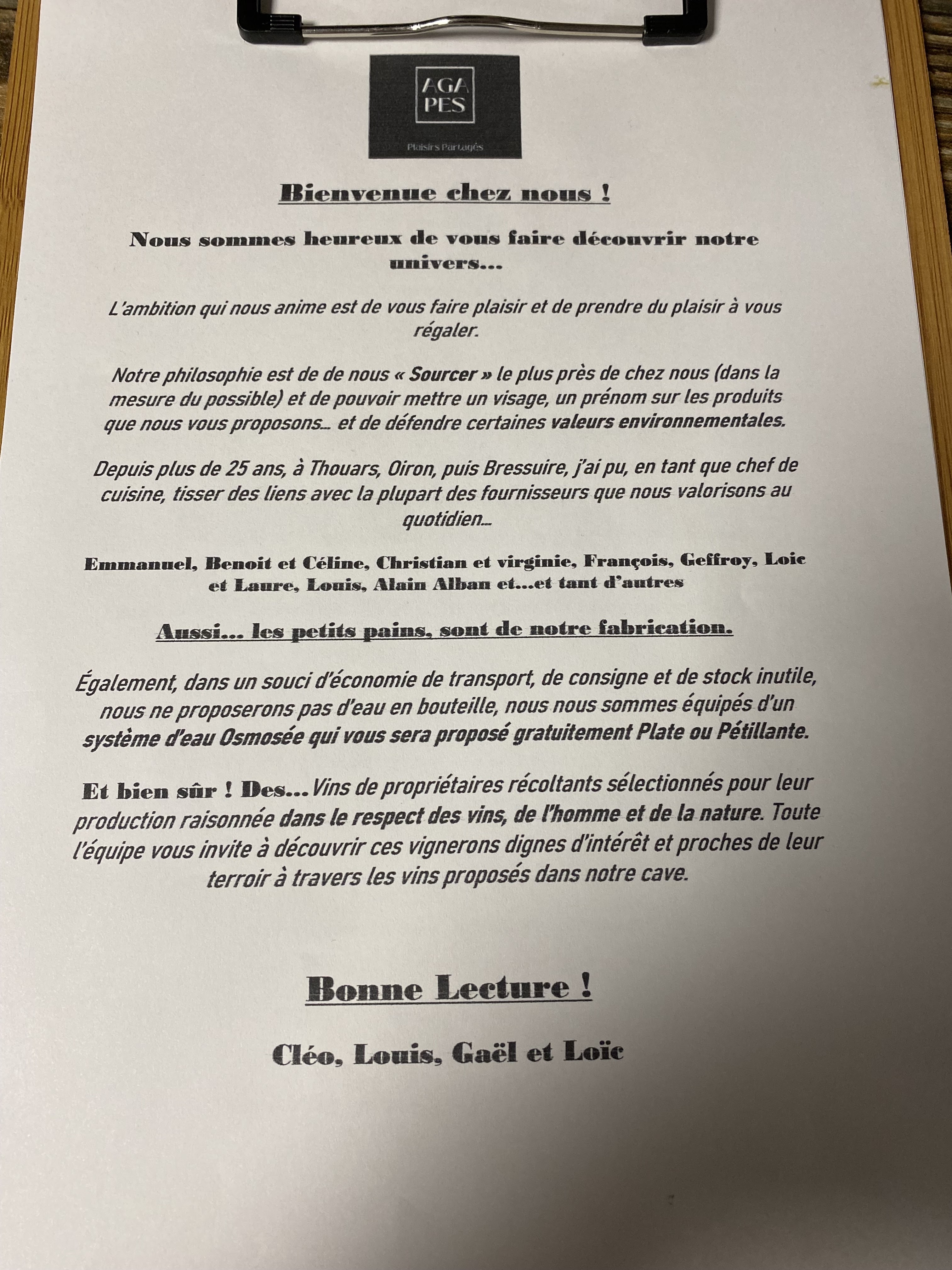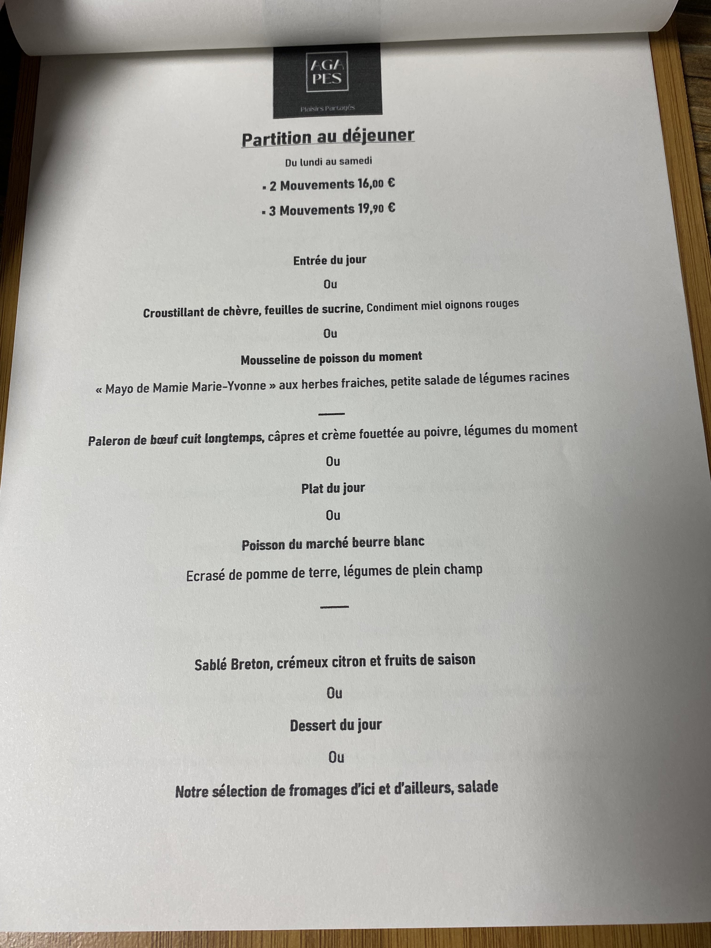 Nous avons beaucoup apprécié la cuisine de l Agapes. Le personnel est très sympathique ce qui devient rare aujourd'hui. Je comprends qu il soit victime de son succès