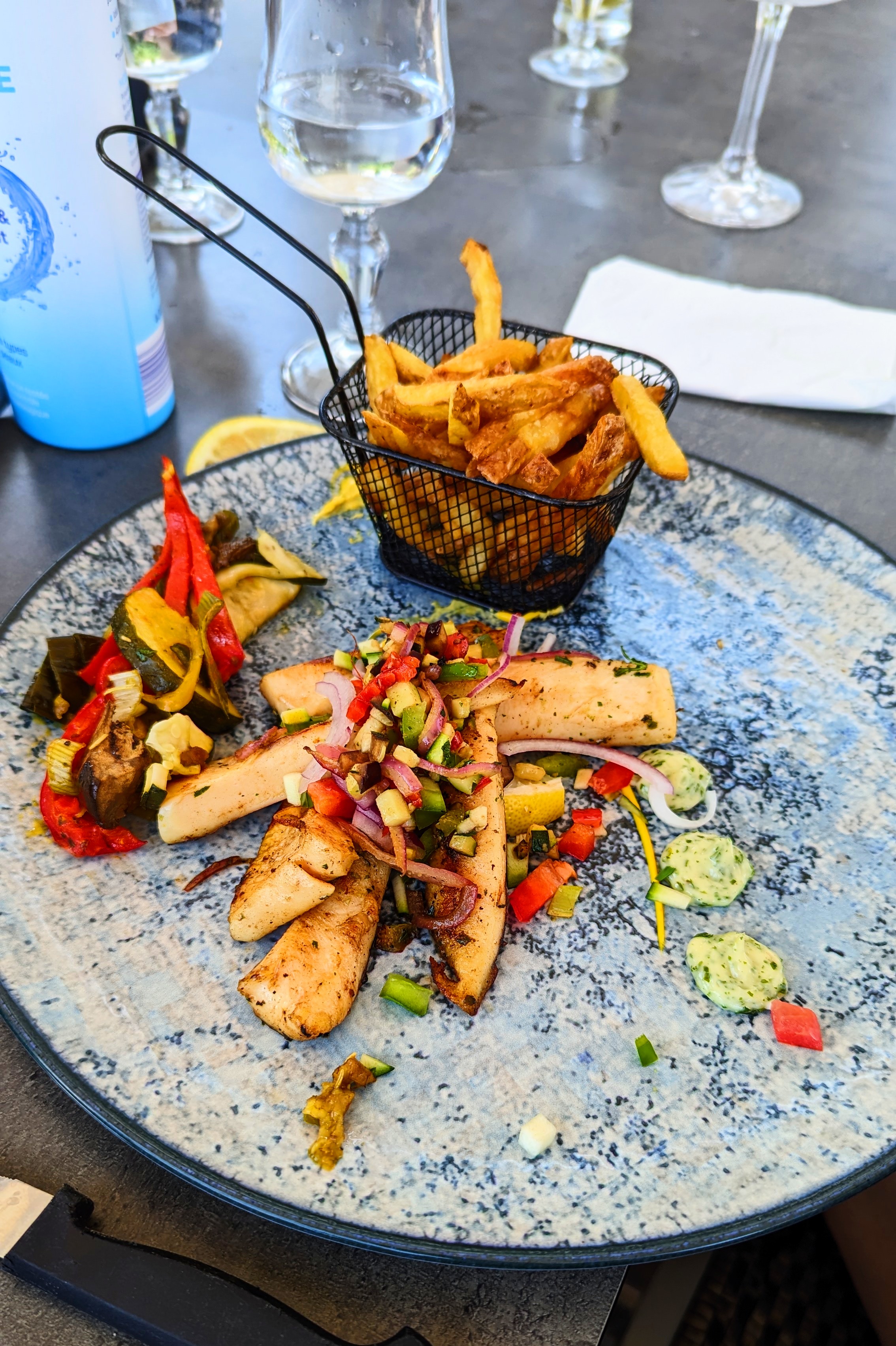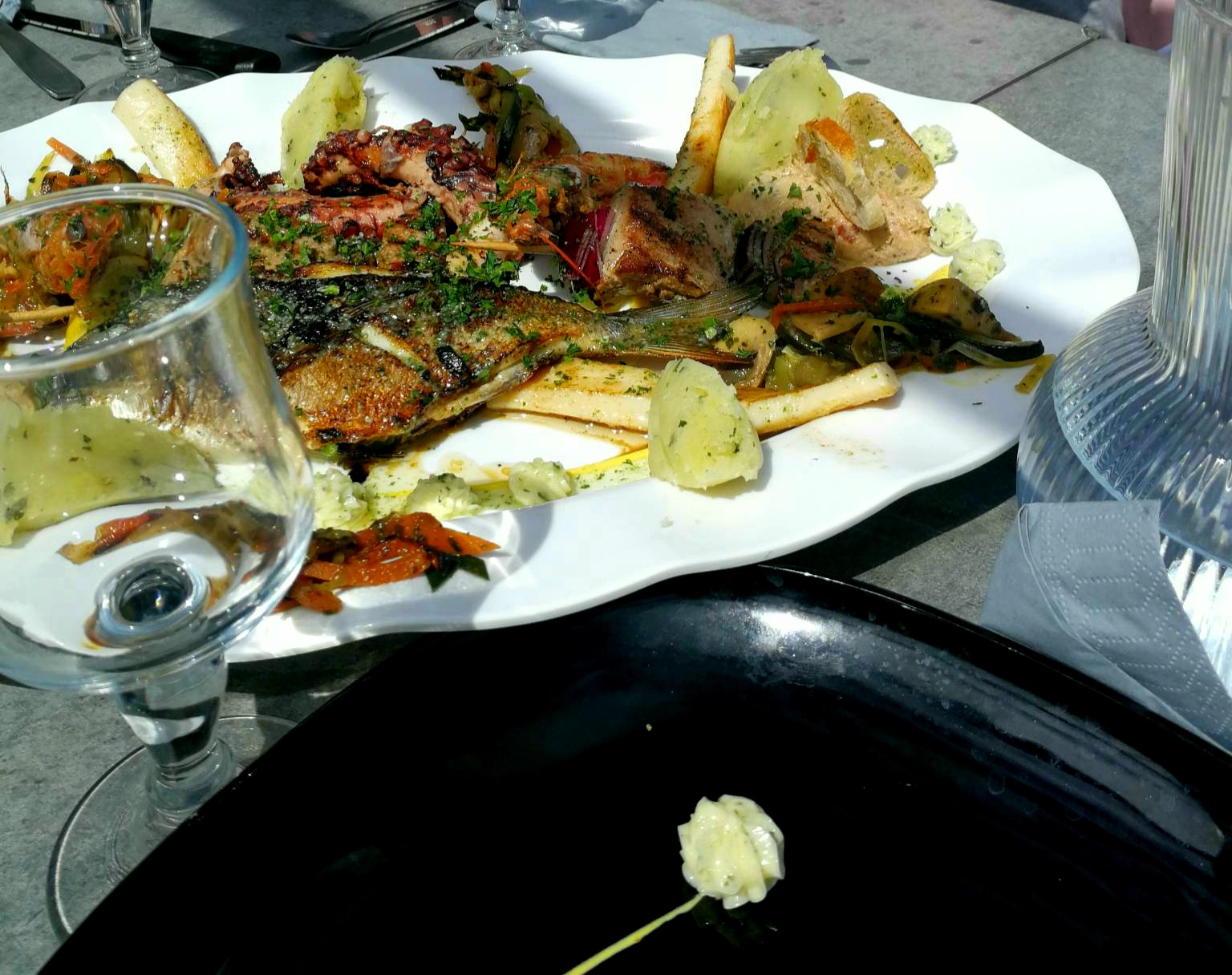 Extrêmement déçu du comportement de la serveuse qui visiblement n’est pas du métier . Bouteille de vin blanc pas fraîche (nous avons demandé deux fois des glaçons). Gratiné de fruits de mer (oui bien gratiné avec beaucoup beaucoup de gruyère). Moules frites (de très gros coquillage avec pas beaucoup de moules). Les frites, j’ai cru à une plaisanterie (6 frites dans un ramequin). Pas de rince-doigts, pas de sel ni poivre , pas de carafe d’eau.seul mon poulpe était très bien.