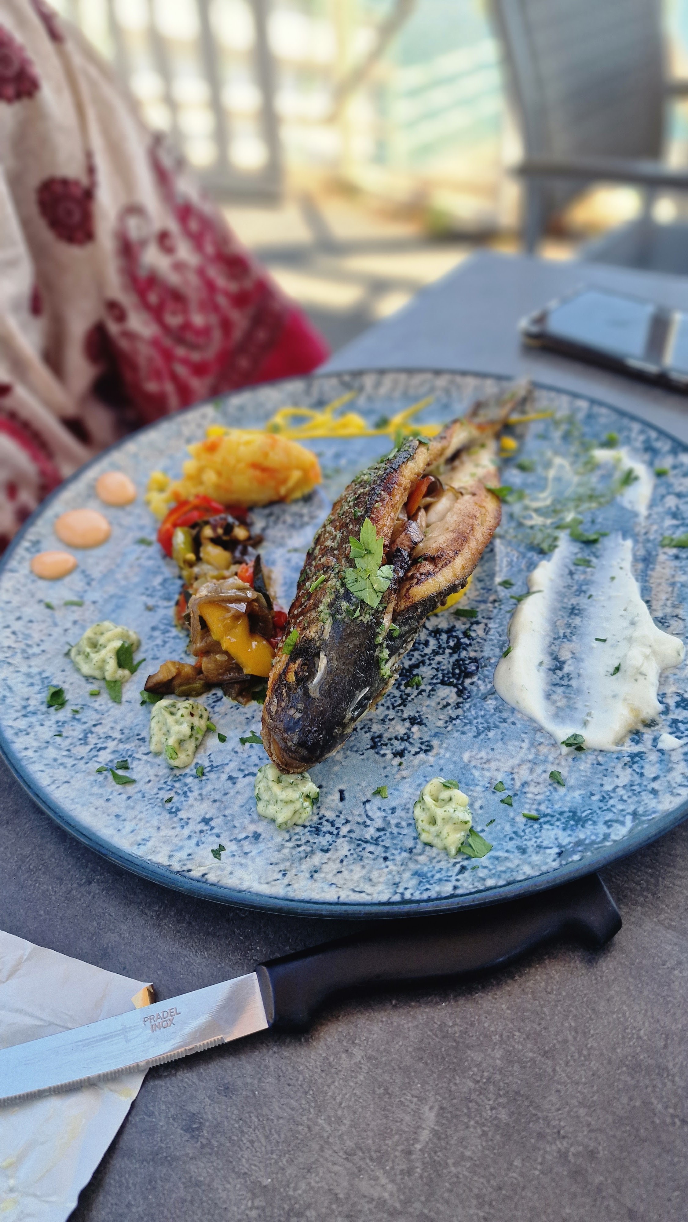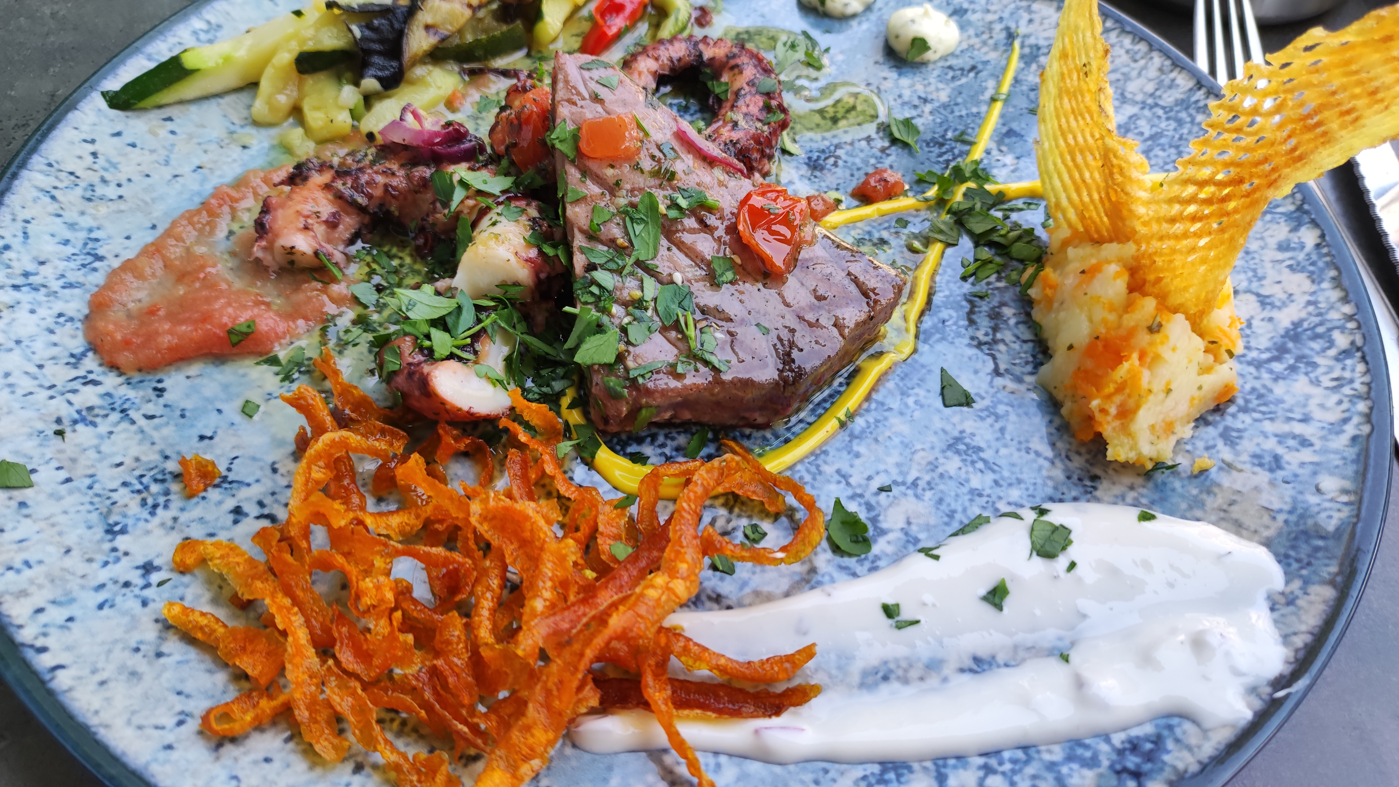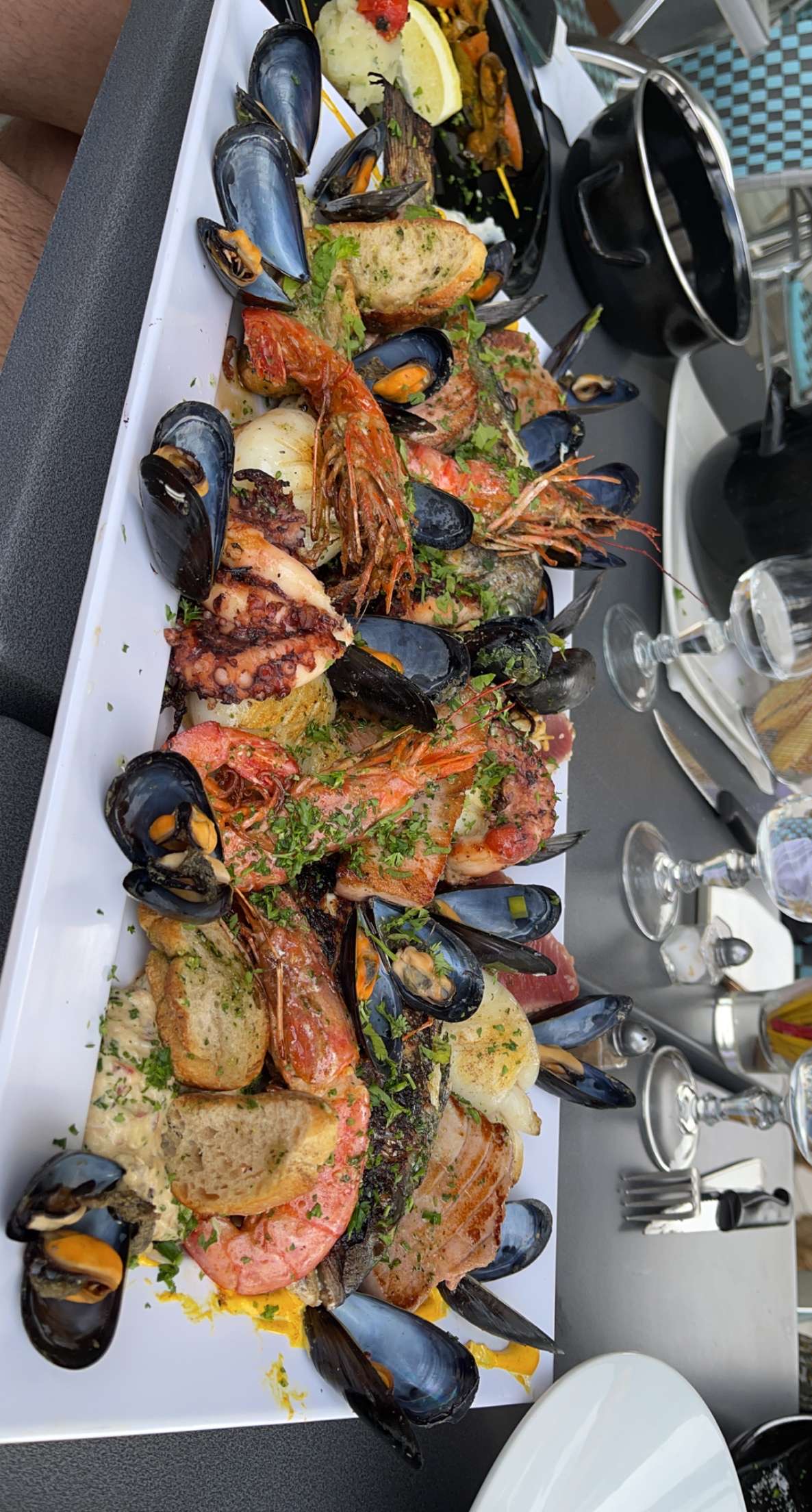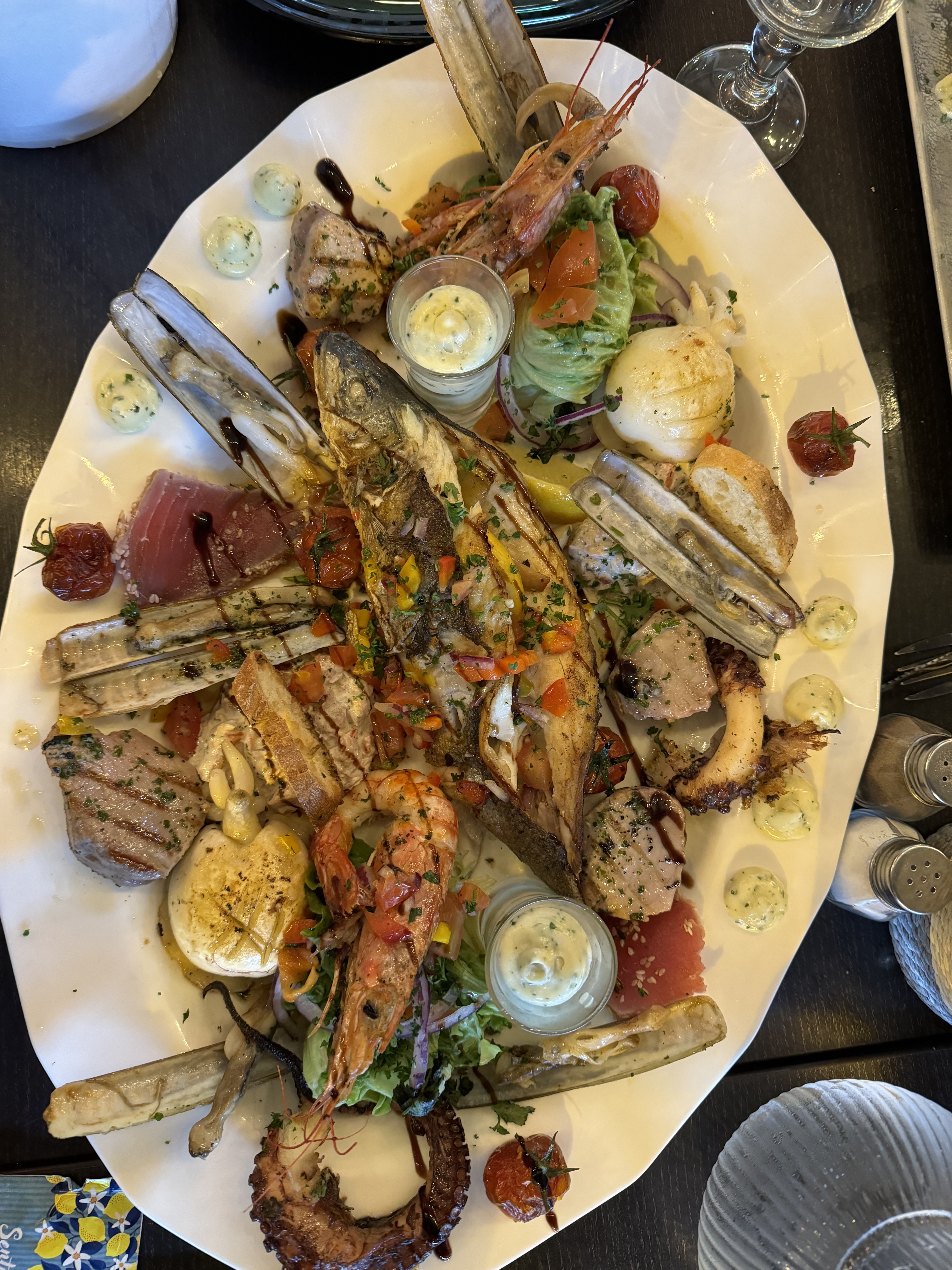 Quoi dire service impeccable Très pro Nous avons pris un plat à partager compris de gambas ( pas assez) seiches, thon, moules, loup, .... C est vraiment copirtet delicieux Lje recommande à tous ceux qui viennent dans la région Vous ne serrez pas déçu !!!!!!!!!!!!!