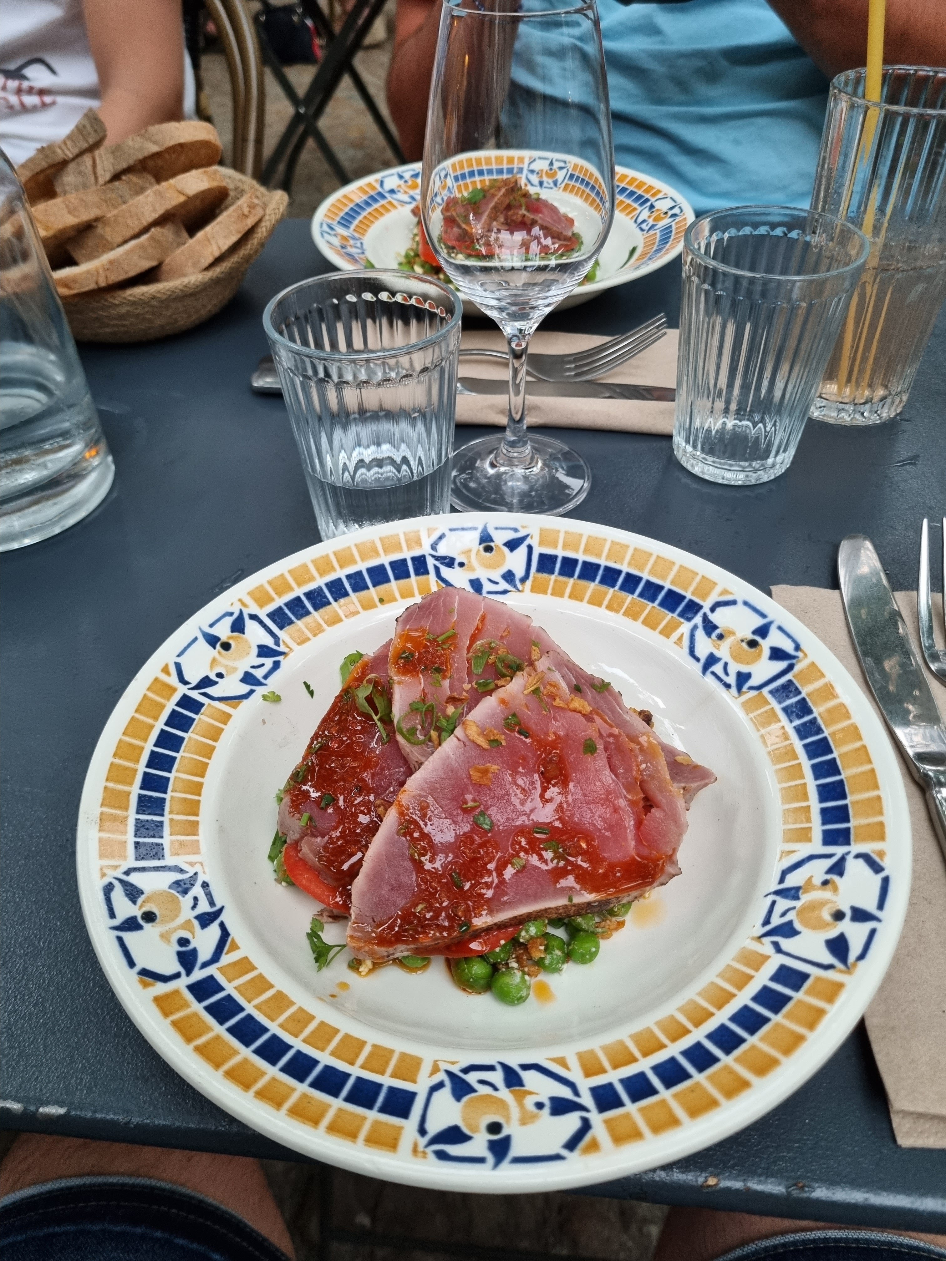 Serveuse au top, avec une petite voix douce, pleine de conseils, carte courte mais signe de fait maison. Qualité de la cuisine au top, me raviol est bon, Le thon en sashimi est goûteux, quand à la pièce de viande, super savoureuse, le pain est bon, La carte des vins est de la région et c'est du bon. pas encore goûter le dessert mais il as l'air prometteur. Le tout sur une petit place bien sympas. Je recommande fortement si vous êtes de passage à Avignon. Le palais des papes est juste à côté, et sa vaux le coup.