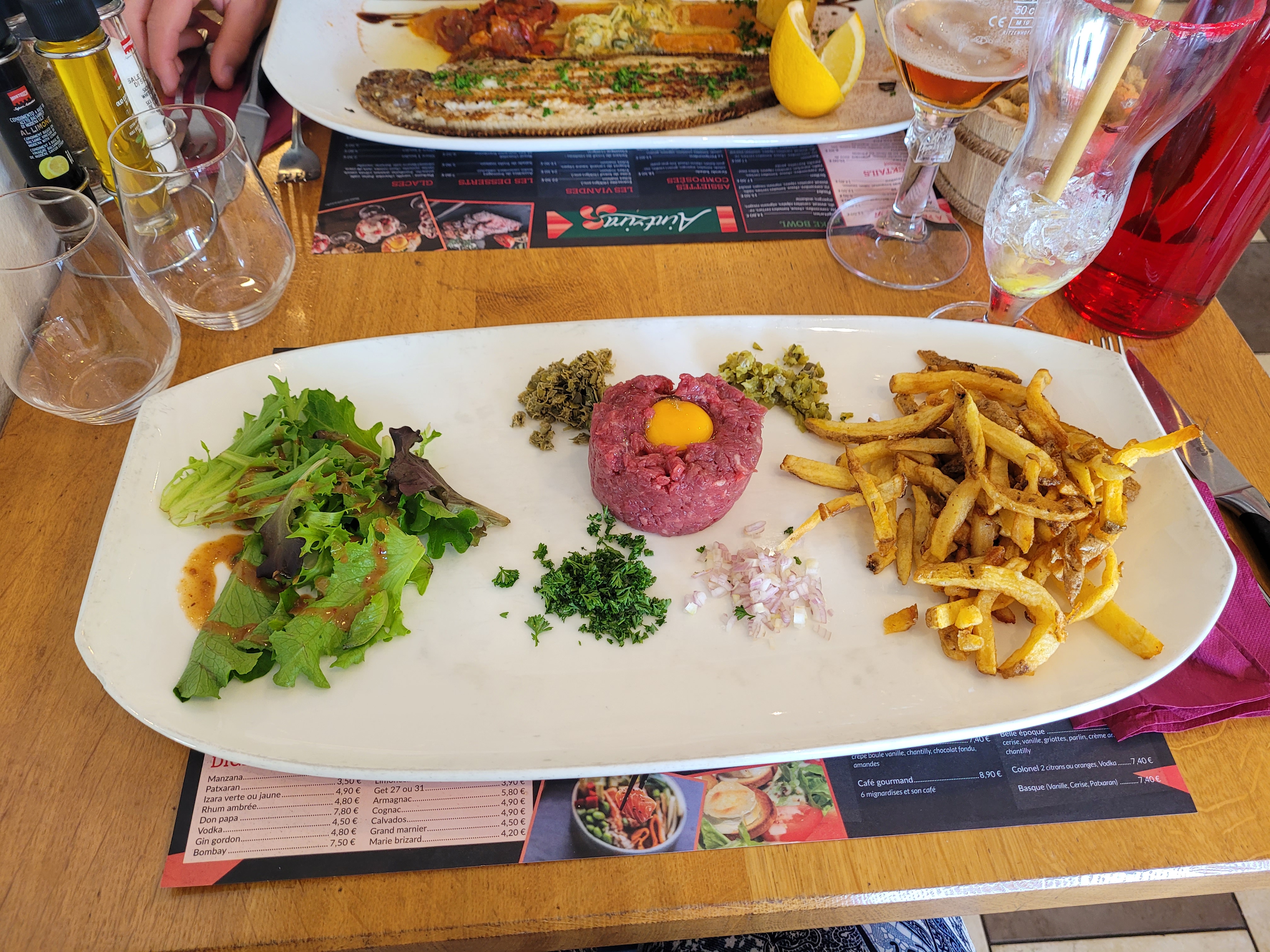 Un bon coktail basque ,accompagné de très bons tapas.Un bon hamburger basque et une banane split (bon.un trop de chantilly et pas assez de chocolat chaud)mais ça,c est la gourmande qui parle... Très bel accueil et un personnel souriant et attentif.Nous reviendrons Merci à toute l équipe