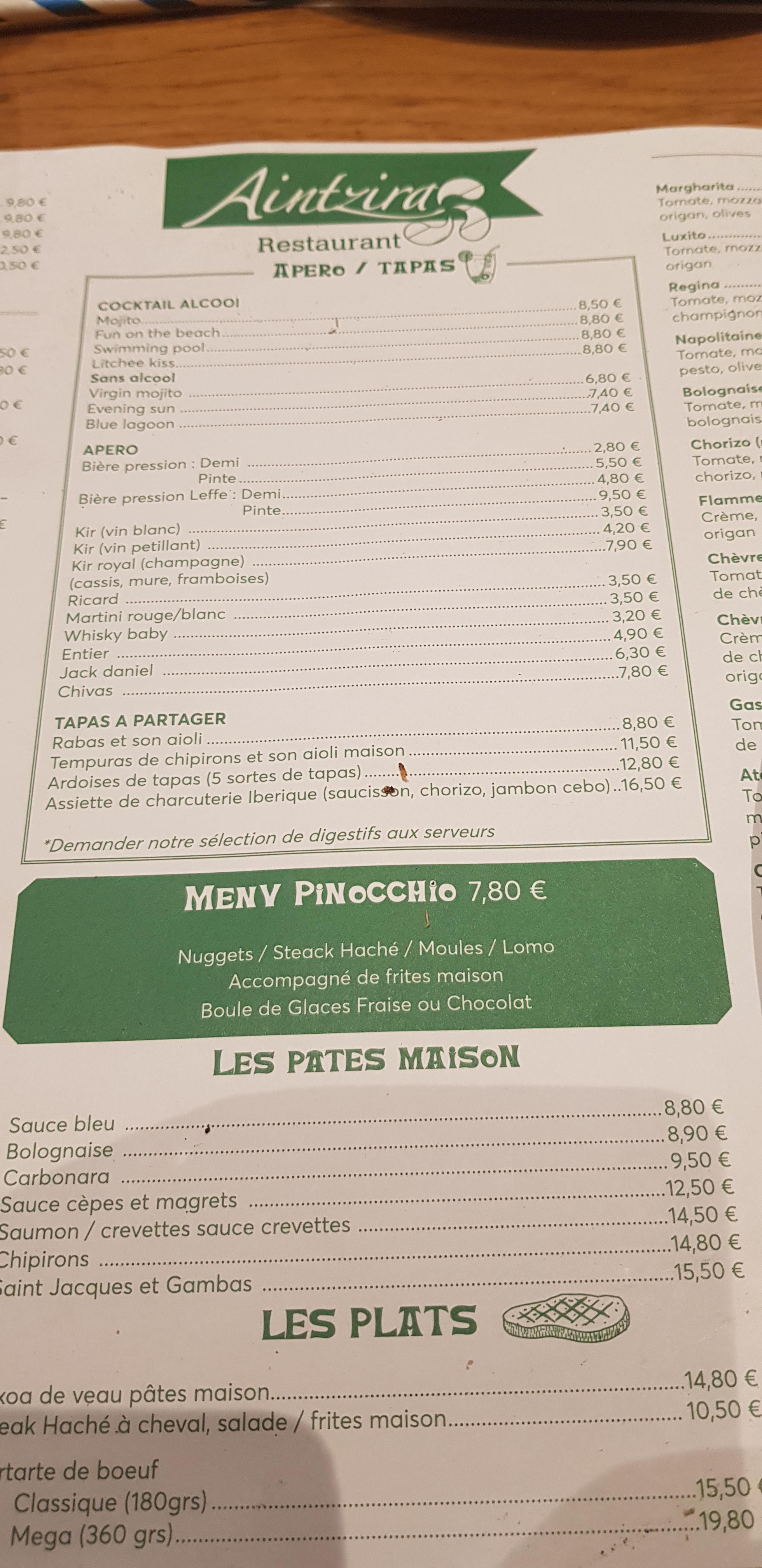 Le déplacement n en vaut pas la peine.tout nos plats ont été tres moyen.les chipirons en tempura sont de vulgaire beignets de calamar archi cuit avec un aïoli pas maison.l'axoa que l ont m'a servi froid je doute qu il soit fait maison avec des frites au gout pas top vu qu il y en a des archi cramée dans le lot.glace a déco kitch.on a attendu 30 min avant qu on nous prenent la commade en nous déconseillant de prendre la pizza qu on voulait se partager en entrée vu que sa aurait été trés long.rosé servi chaud dans un sceau sans glace.btef mauvais moment dans un endroit bruyant.