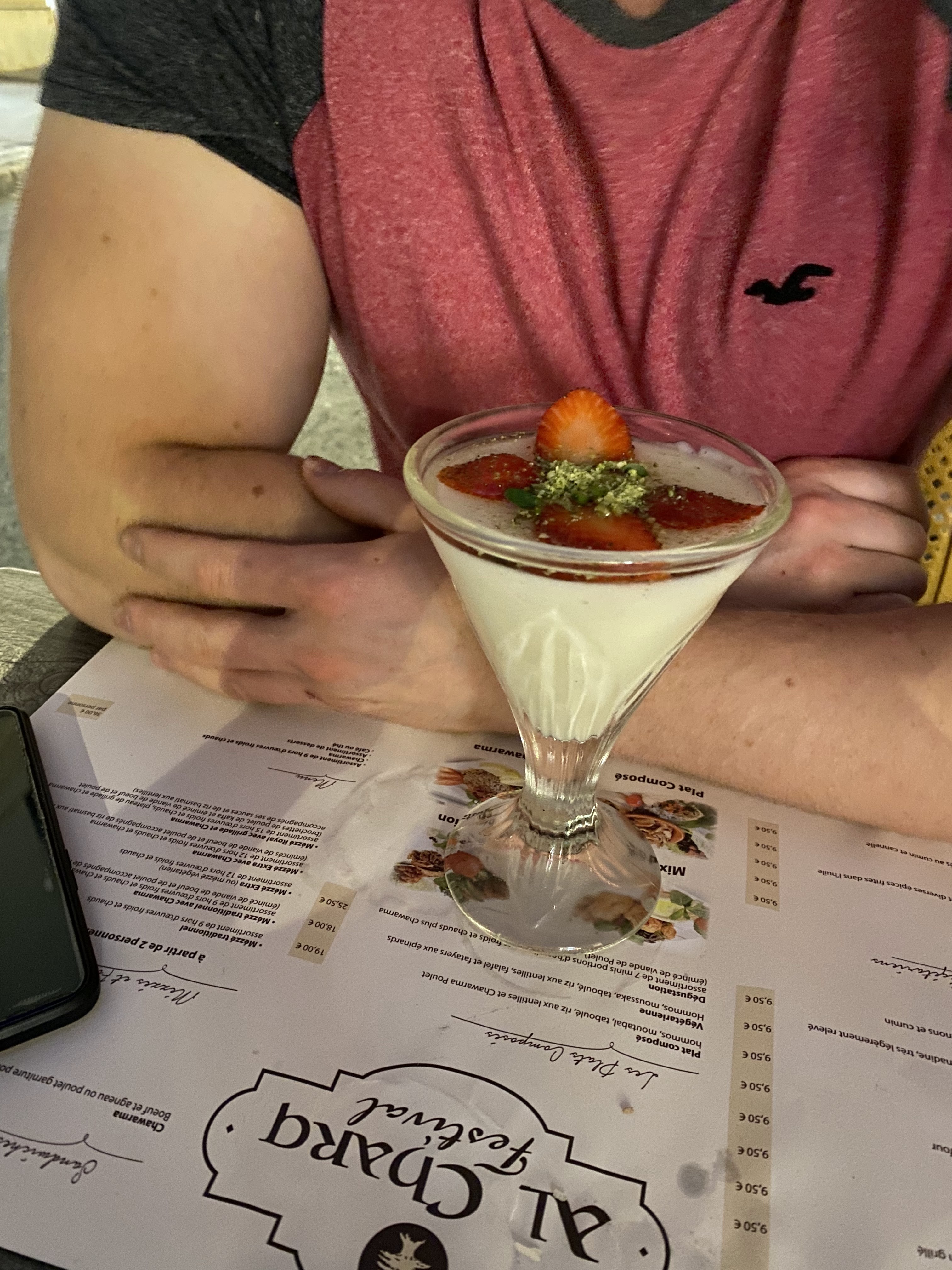 Un menu enfant qui n’en est pas vraiment un car il s’agit juste d’une assiette de poulet frite et salade. Pas de désert. Nous avons pris ensuite une assiette kefta et un chichtaouk. Le riz était sec sans assaisonnement. Une grosse portion de persil couper de manière aléatoire. J’ai demandé une chaise haute pour mon bébé. On m’a apporté une chaise complètement sale ! J’ai du la nettoyer seul. Je ne sais pas depuis combien d’années cette chaise n’a pas été nettoyée.