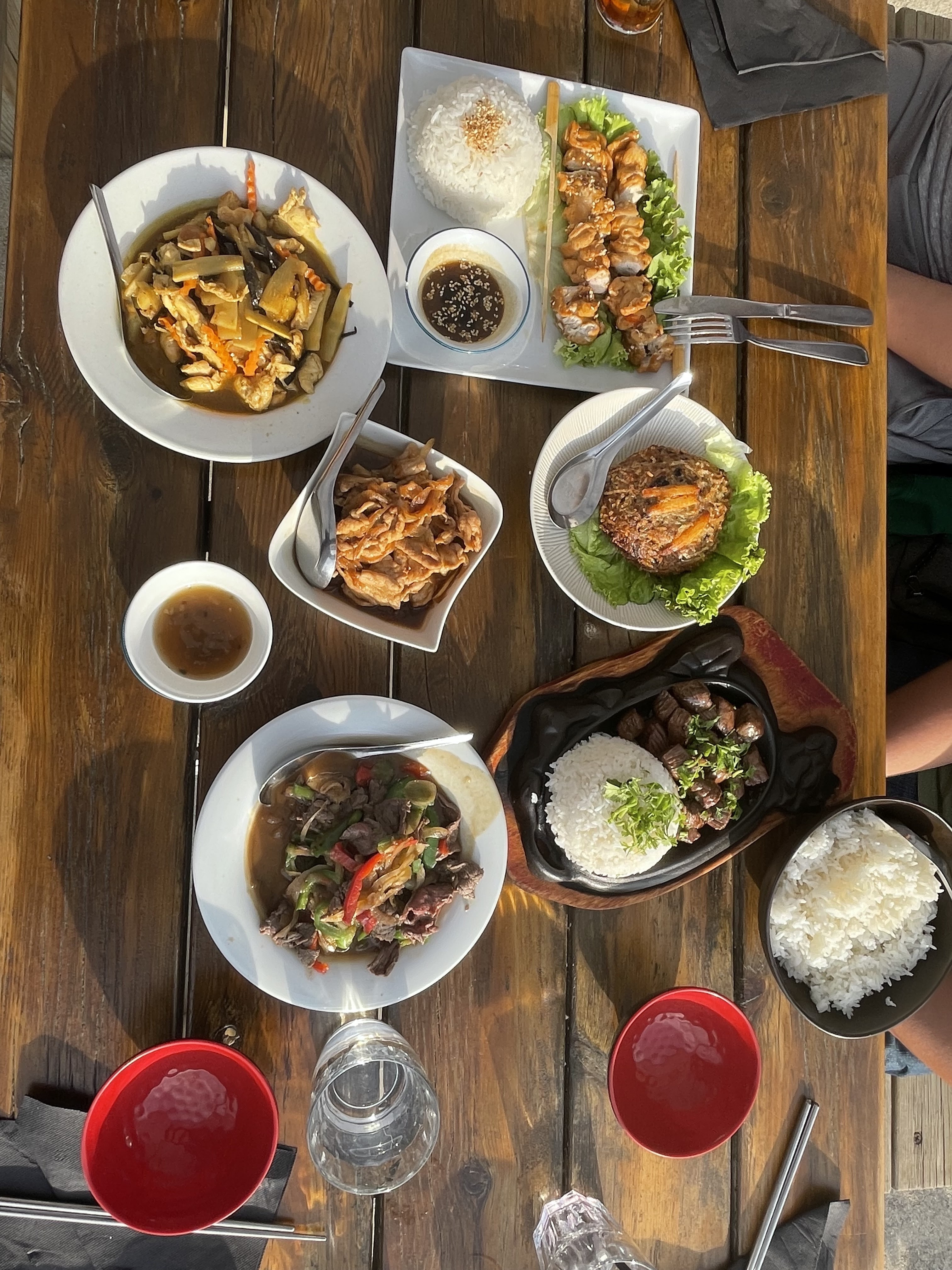 Superbe couché de soleil au bord de l etang. Repas delicieux specialités vietamiennes au top.