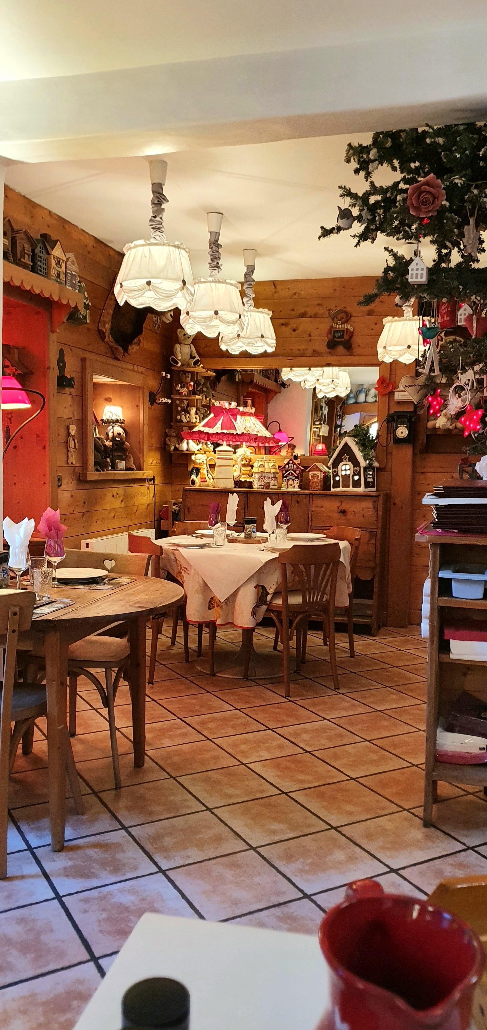 La façade rose ne laisse aucun doute : le décor ne sera pas banal. Et on n'est pas déçu du voyage ! Là où la surcharge de babioles et autres garnitures aurait pu mener à l'overdose, un soucis du détail et une certaine auto-dérision font que ça marche bien. La cuisine, faite de spécialités savoyardes, est très bonne et sans aucun doute copieuse. Et si vous passez par là, n'oubliez de jeter un coup d'oeil au descriptifs des savoyards qui clôt la carte.