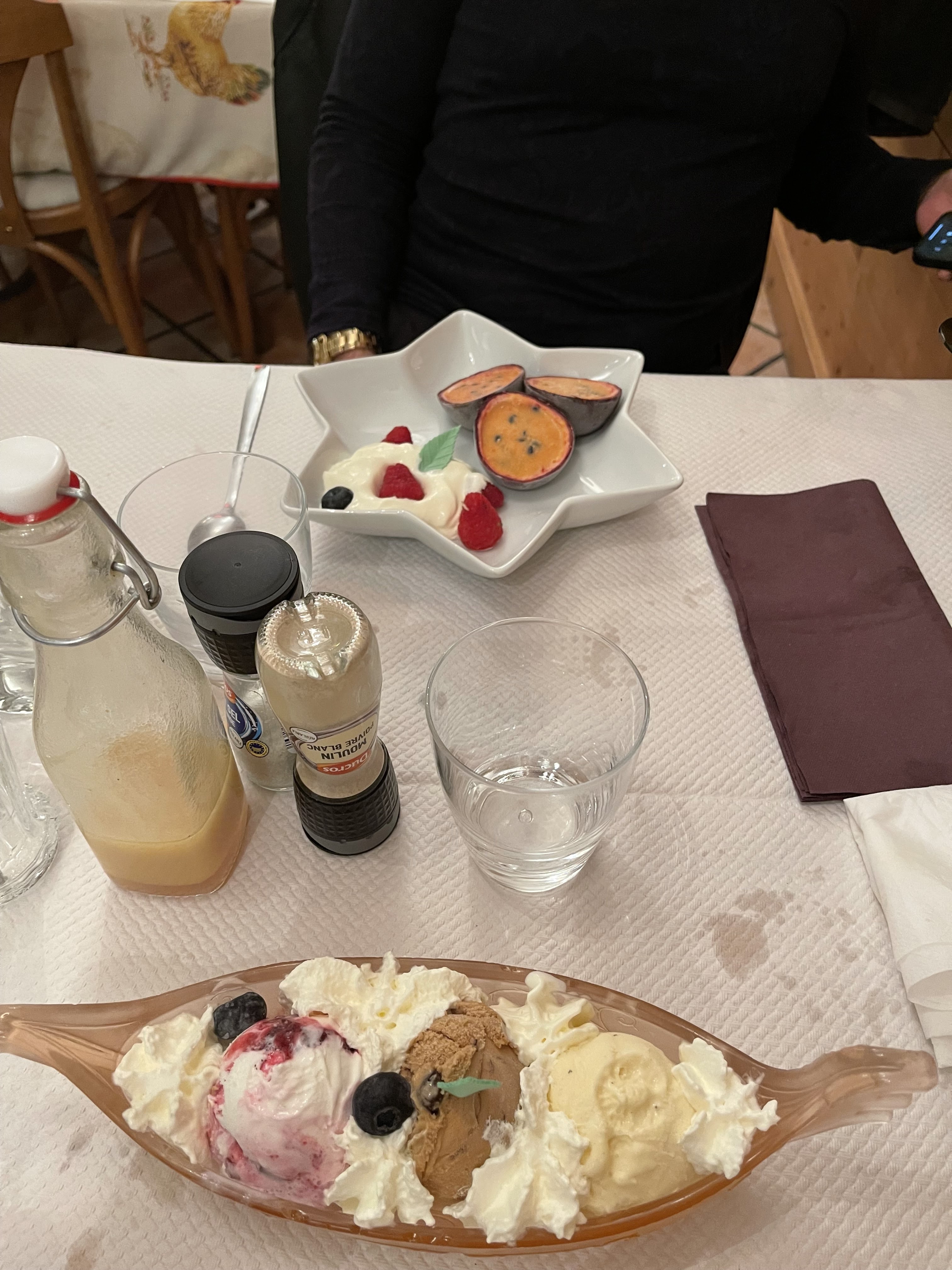Ambiance très intimiste. Fondue excellente ainsi que le délice d'Anaïs. Desserts maisons délicieux. Bons produits et belle quantité. Couple de propriétaires très sympathique. Bravo et merci 🤗