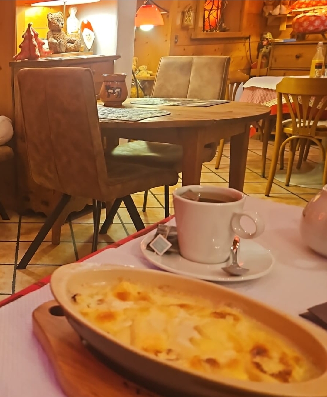 Je viens de sortir du restaurant et j'ai vraiment bien dîné. Il est vrai qu'avoir commandé une fondue Savoyarde pour le soir est peut être un peu lourd et pourtant.... J'ai dégusté un plat typique qui ne me pèse absolument pas, elle était accompagnée d'une salade verte fraîche au délicat goût d'huile de noix. En dessert cake aux myrtilles le tout arrosé d'une bière locale. Dans un cadre cocooning très confortable avec de jolies boiseries aux fenêtres et sur un mur, décorés pour les uns d'oursons tous mignons, de théières ainsi que d'anciens moulins à café. Un restaurant à l'âme chaleureuse... J'y retournerai dès mon prochain passage.