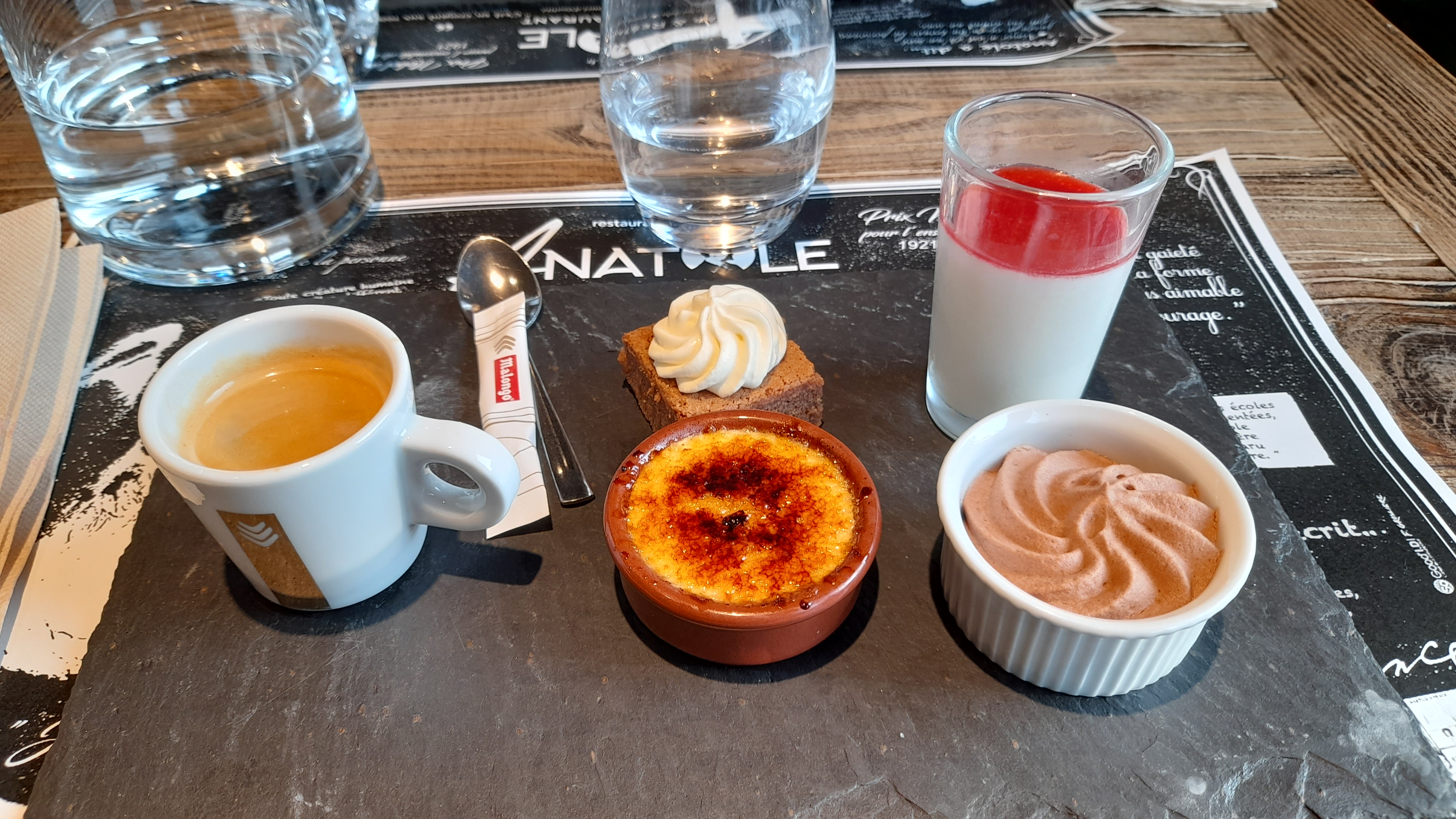 Lundi soir, une seule formule a 9,99€, plat-dessert. 3 plats (salade César, aligot saucisse ou pâtes) + 3 desserts (mousse au chocolat, citron givré ou crème brûlée). Plus de crème brûlée et pas de verveine en digestif… les altiligériens apprécieront!