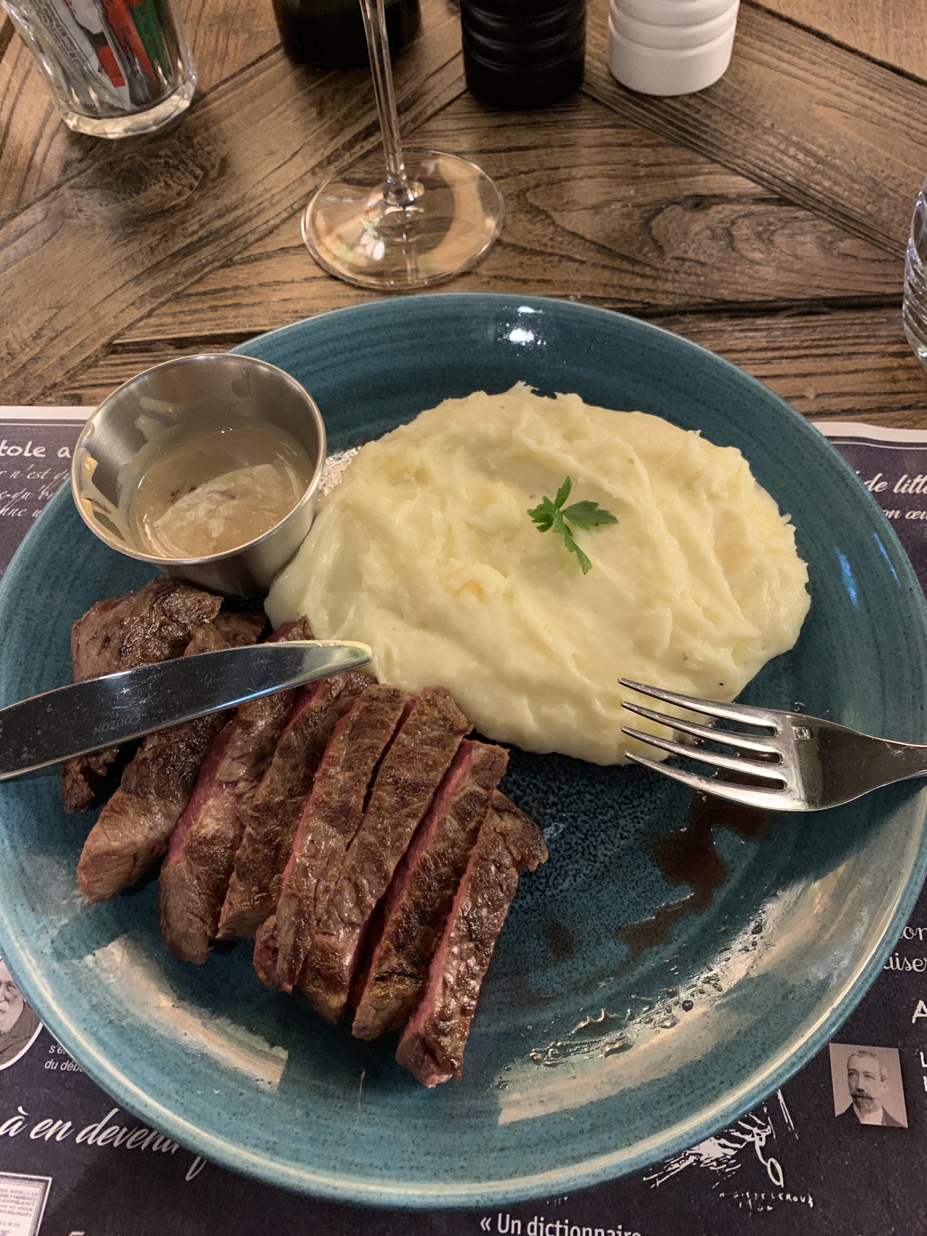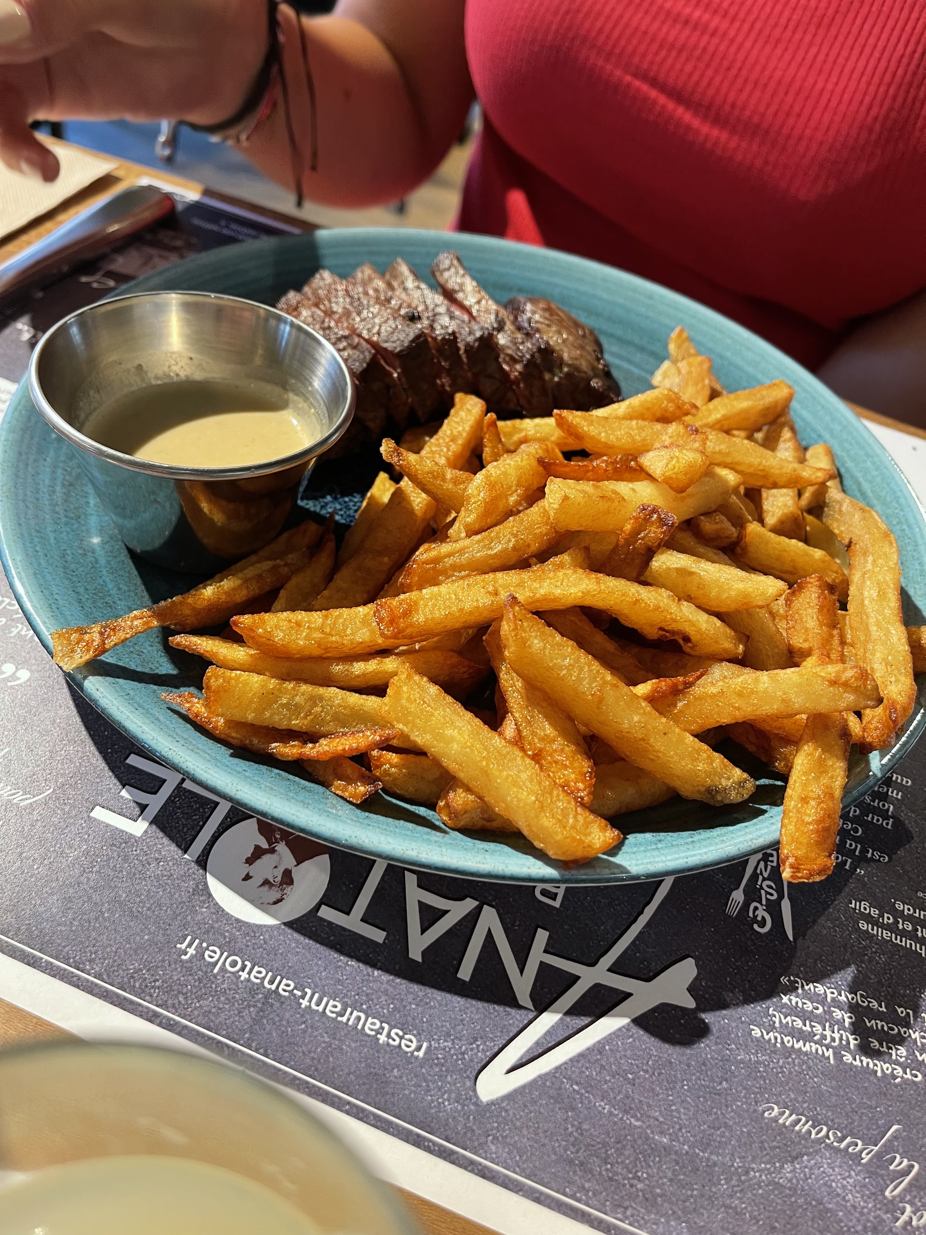 Frite trop cuite, fond de paquet Sauce bearnaise trop acide ,mais cadre agréable, prix abordable