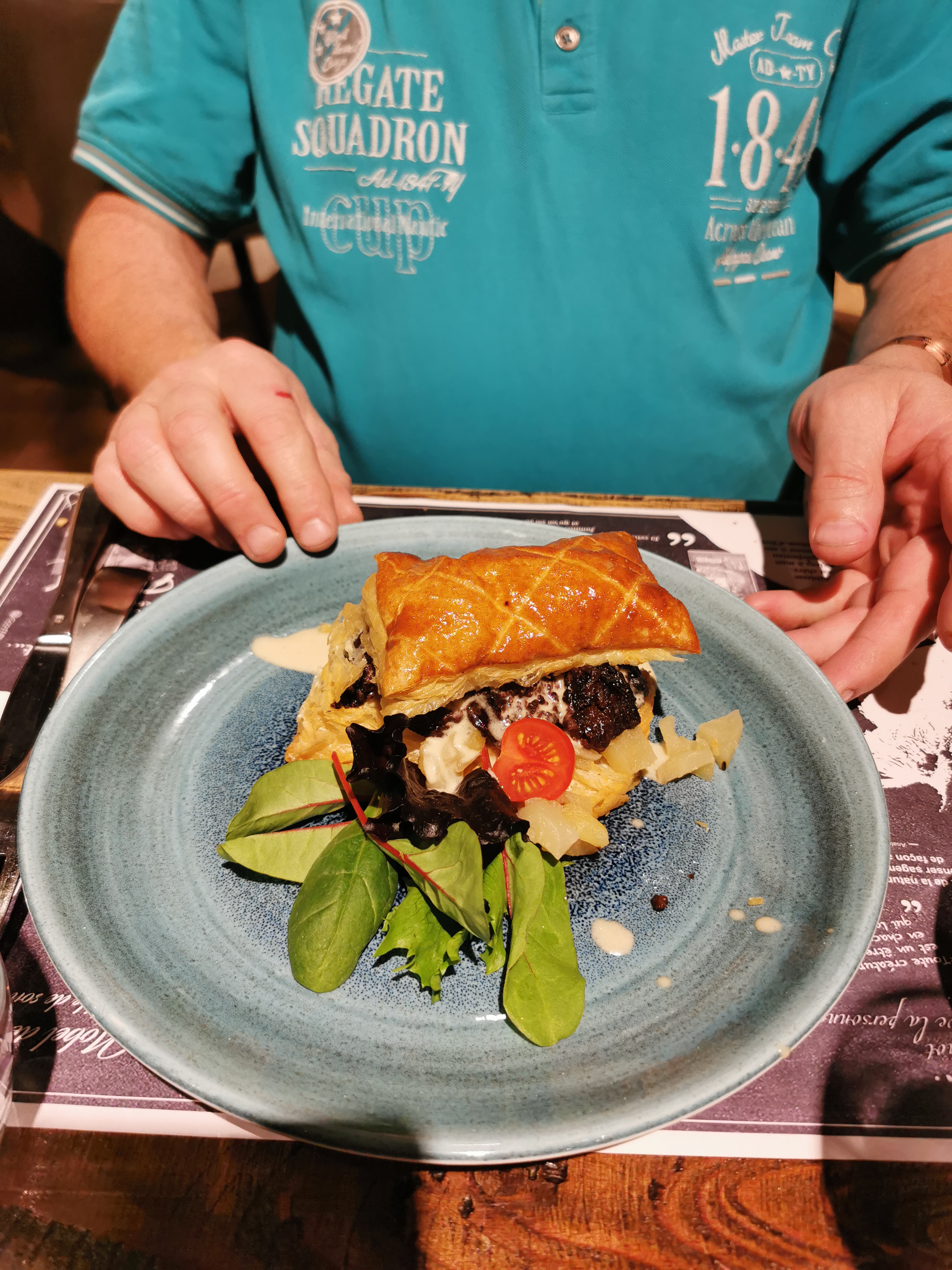 La nourriture ici est belle et il y a une ambiance splendide ! Nous reviendrons très certainement ici si jamais nous revenons en Auvergne. Nous avons pris la burrata aux tomates pour notre entrée. La burrata était riche et crémeuse, et l'ail dans le pesto complétait parfaitement les tomates. Le plat était léger et rafraîchissant, absolument alléchant. Pour nos plats principaux, nous avons commandé le steak et le steak tartare. L'un des meilleurs steaks que j'ai jamais mangé. La viande était impeccablement cuite, juteuse, tendre et merveilleusement assaisonnée. Le steak tartare avait le rapport idéal entre oignons et bœuf, et il plaisait tellement à la palette. Côté desserts, nous avons eu la crème brûlée et le clafoutis. La MEILLEURE crème brûlée que nous ayons jamais eue, elle était crémeuse mais pas trop sucrée ni écrasante. Le clafoutis n'était pas trop lourd sur la palette, mais constituait certainement une excellente fin pour un repas superbement satisfaisant.