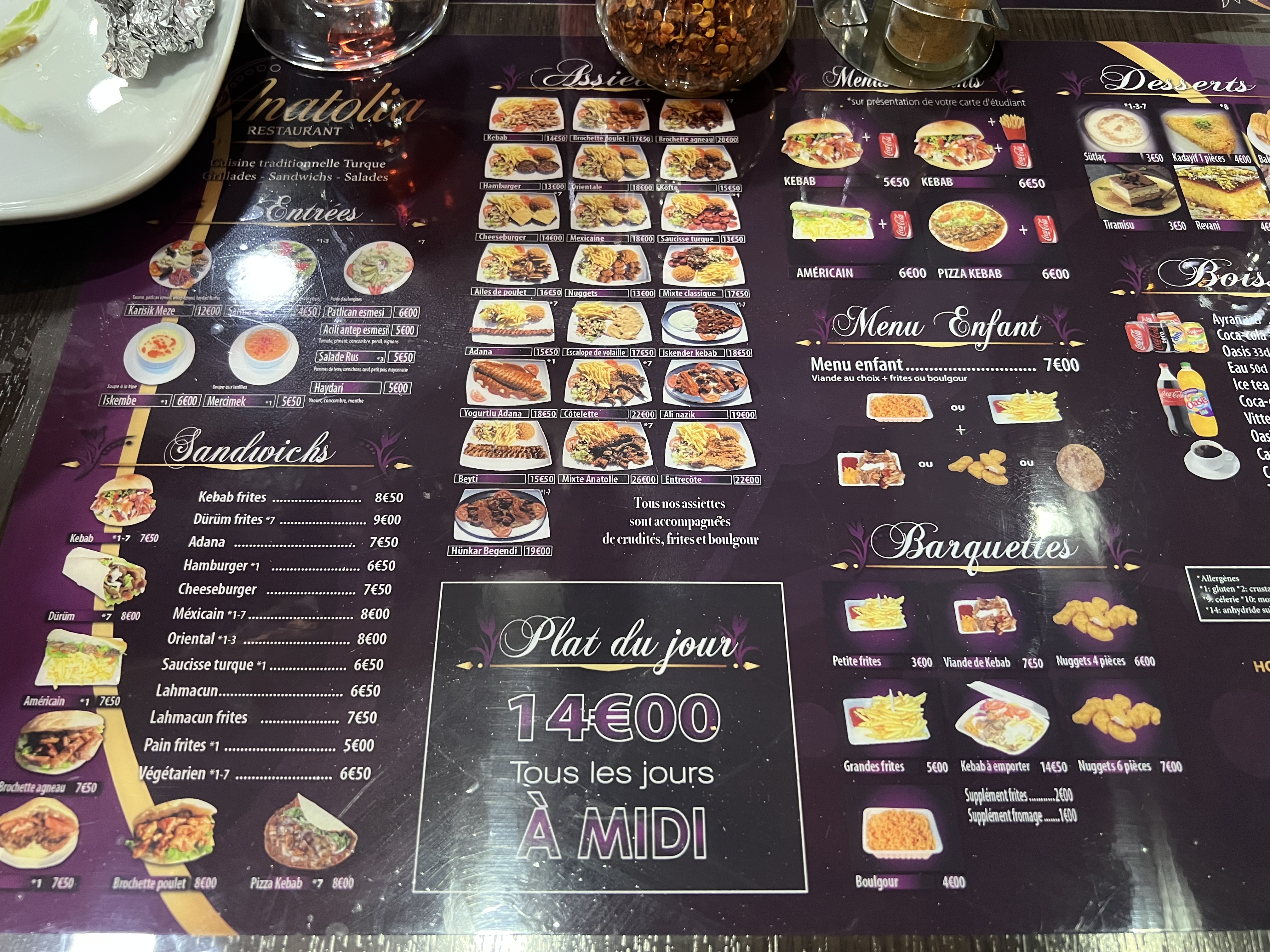 Deux étoiles pour l'accueil correct et l'endroit grand et propre. Par contre plats rien d'exceptionnel. Concernant la soupe de lentilles, je ne pense pas qu'il y a des lentilles à l'intérieur étant donné que j'en avais déjà mangé ailleurs. La viande de kebab bon mais le sandwich manque un peu de saveur car très peu de légumes et sauce. Les WC trooop serré. Et enfin prix cher pour ce que c'est. Surtout que l'on vous rajoute +10€ à votre addition de je ne sais où (??!) juste avant votre départ ! Attention à bien vérifier vos calculs, ce que nous avons heureusement fait! Au final, première et dernière fois que j'y vais.