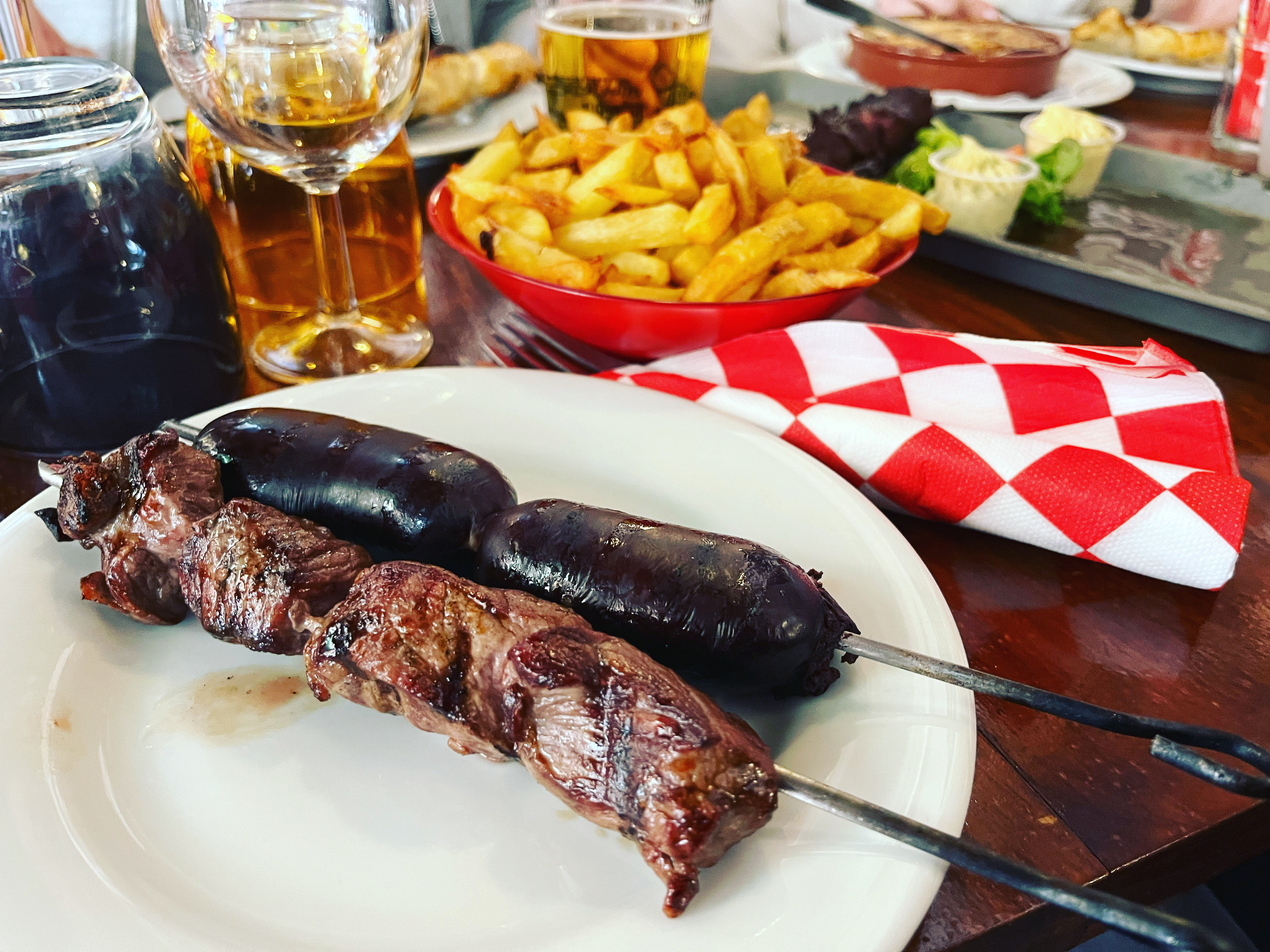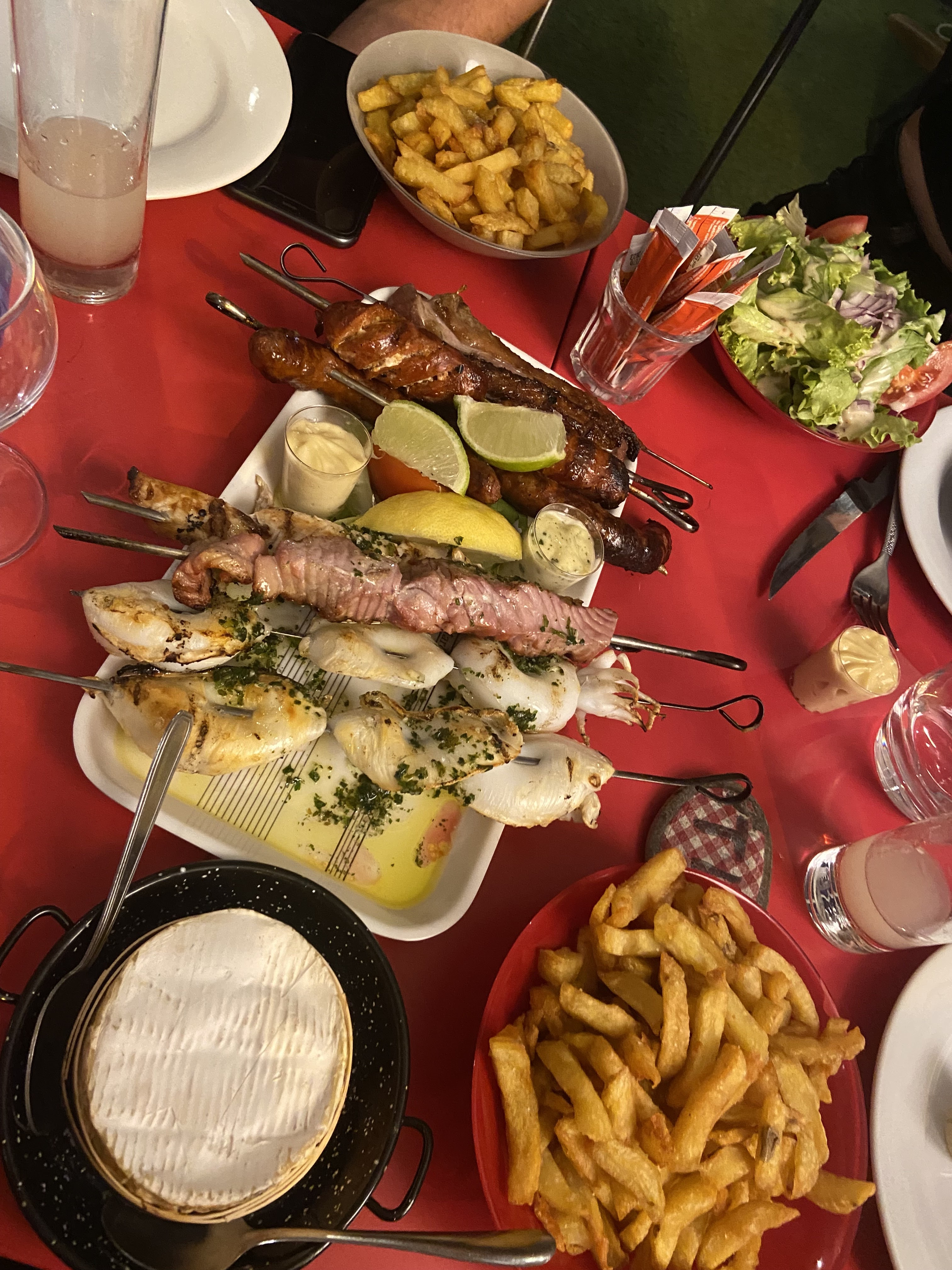 brochettes de boeuf pas tendre malgre une cuisson saignante , poulet merguez et chorizo ultra cuites et limite carbonisée, on nous a certifié des frites maison , mais j'ai un doute le lieu est sympa et convivial , mais tres tres déçu par la cuisine