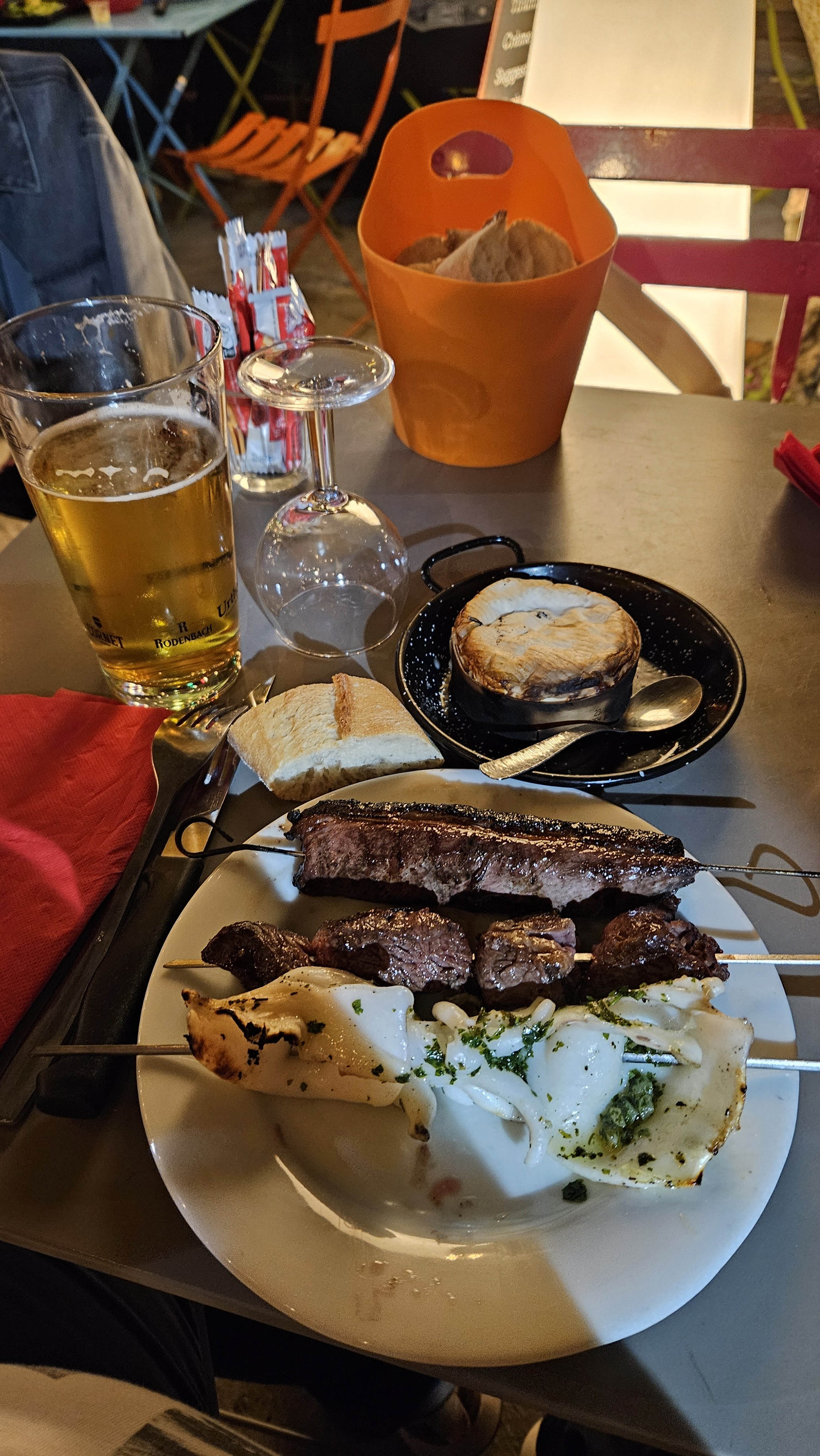 Je recommande vivement ce restaurant, le cadre est super sympa et sent bon l'été et les vacances. Le concept est génial ! Il y a un bon choix de brochettes avec certaines qui sortent de l'ordinaire comme celle à l'espadon ou chorizo rôti, et pour moi qui suis une grande amatrice de brochettes d'abats: quel délice les brochettes de cœur de canard et de foie de veau. Et originalité dans les accompagnements le camembert rôti. Tout ça pour un prix très correct.