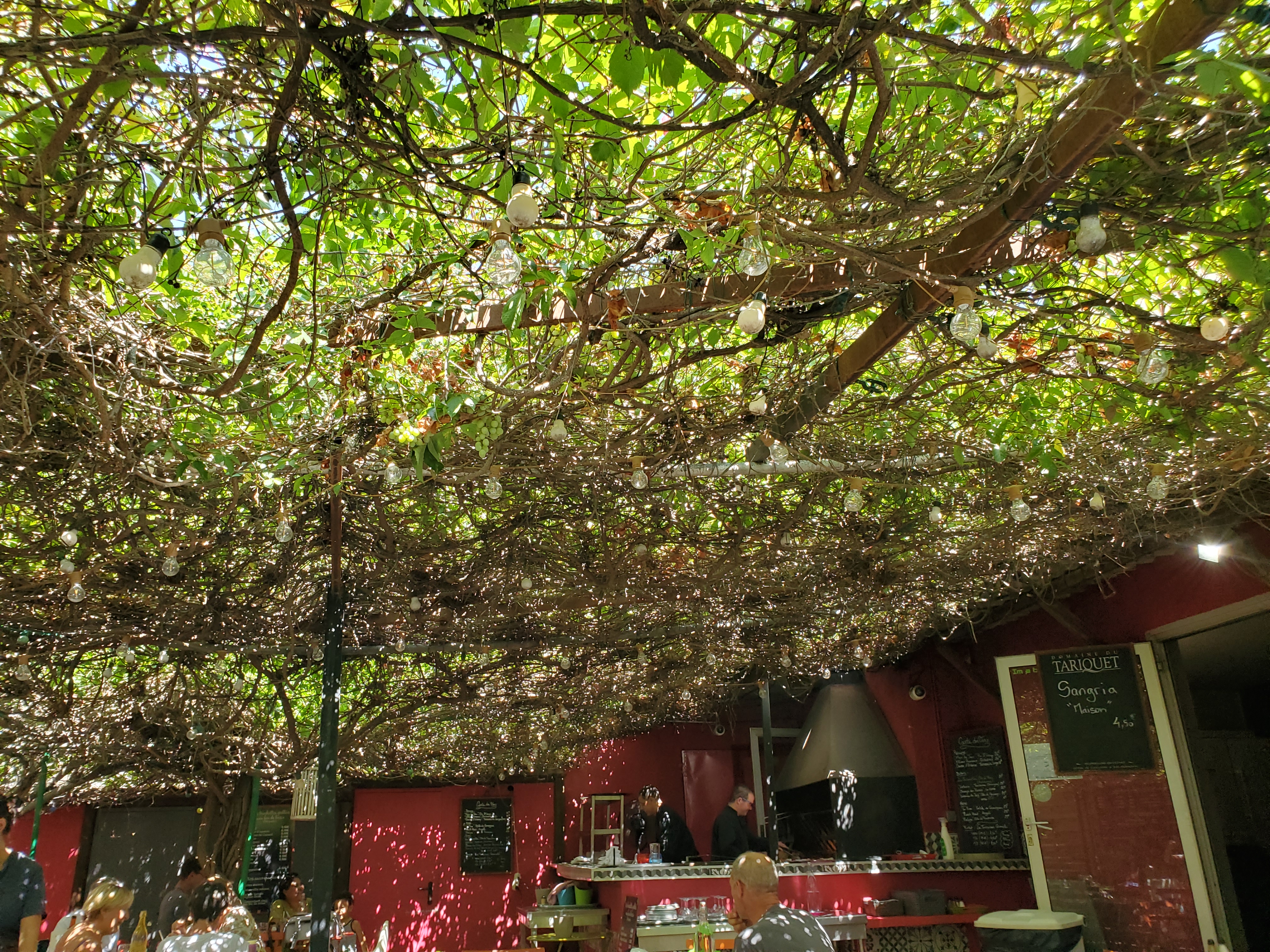 Ambiance sympa à l'ombre sous la vigne. Personnel agréable sympathique et compétent. Brochettes simples et bonnes, frites maison, camenbert au BBQ nickel, Rosé du coin léger et frais. Bon rapport qualité prix.