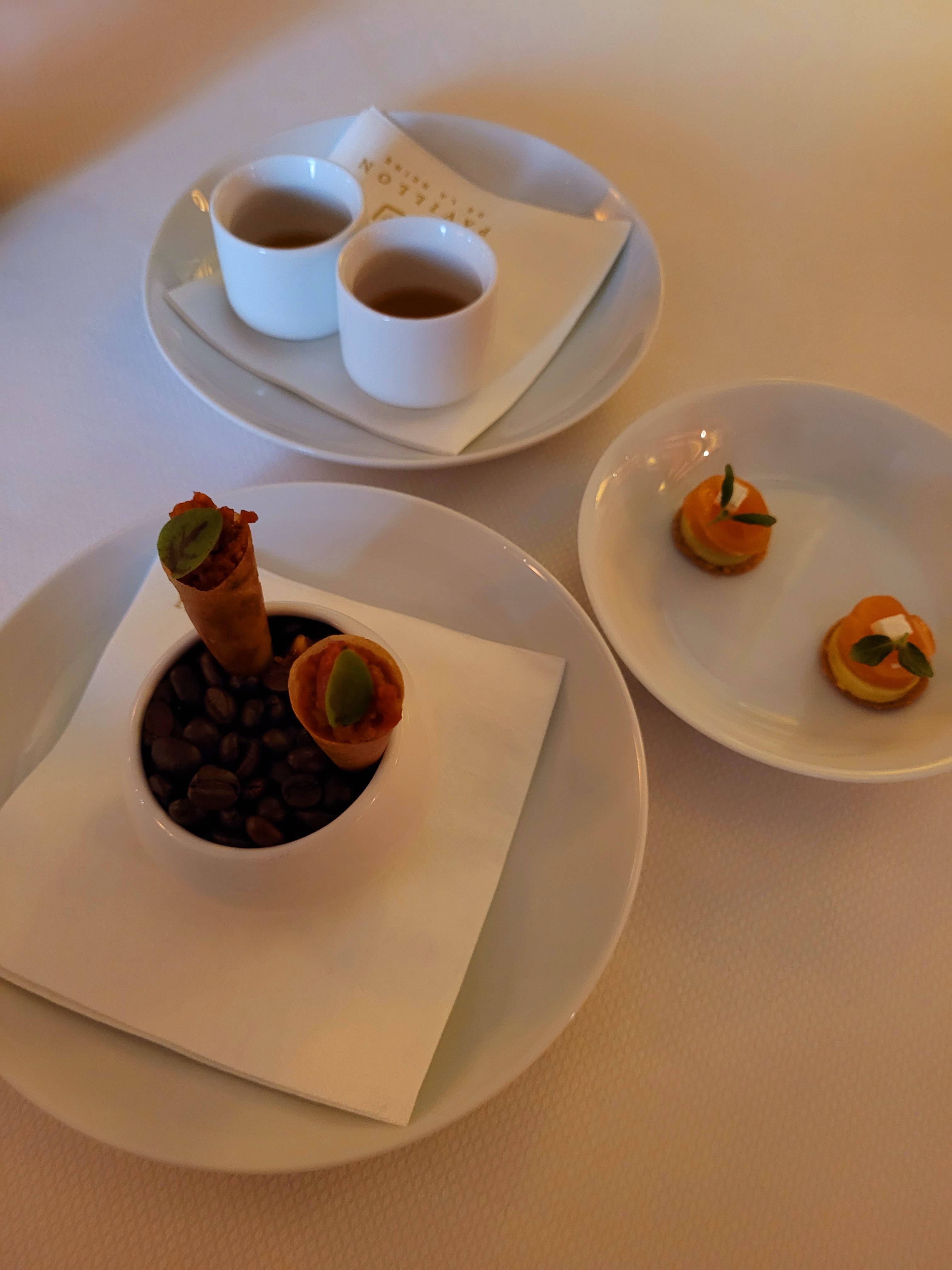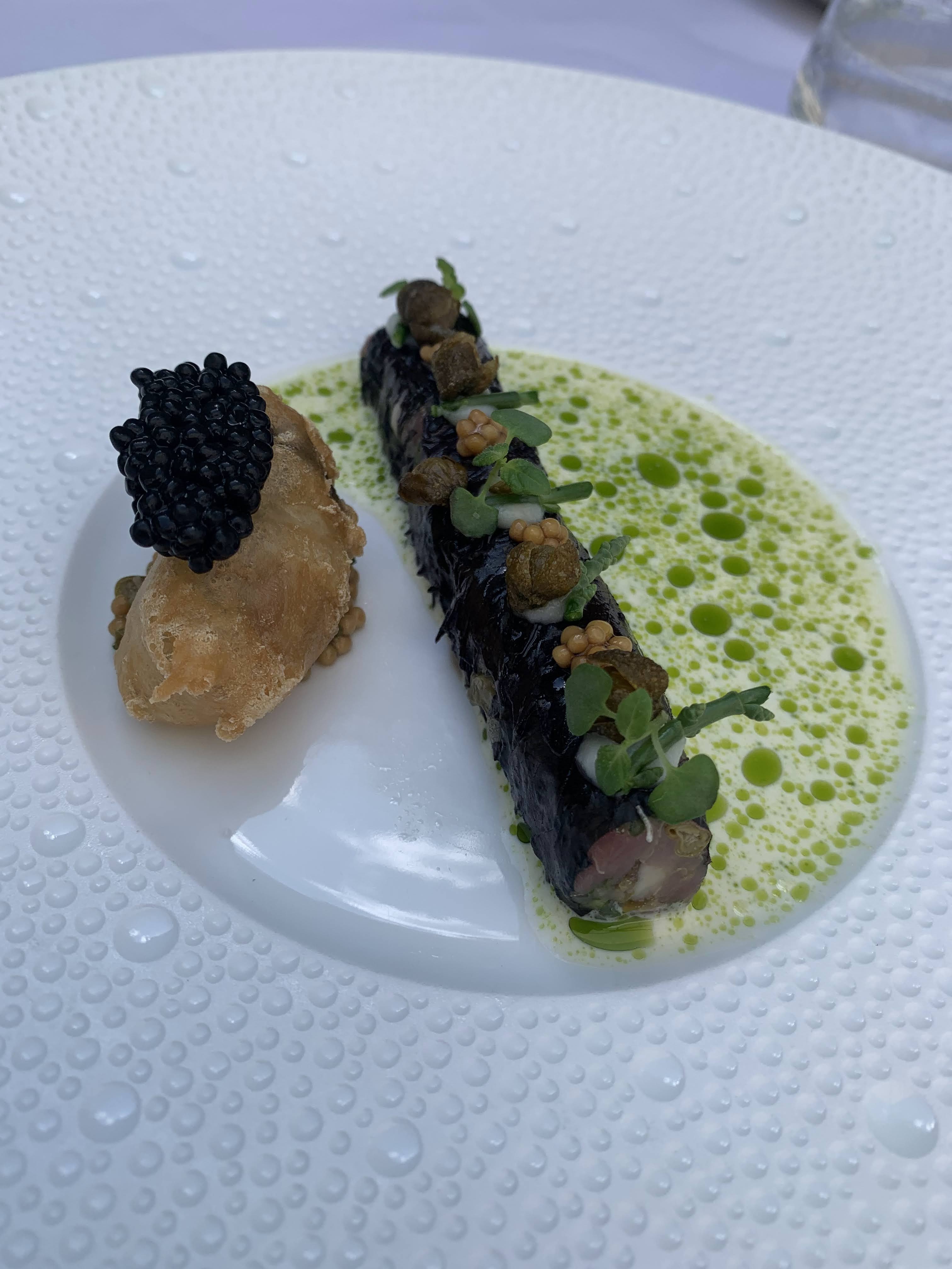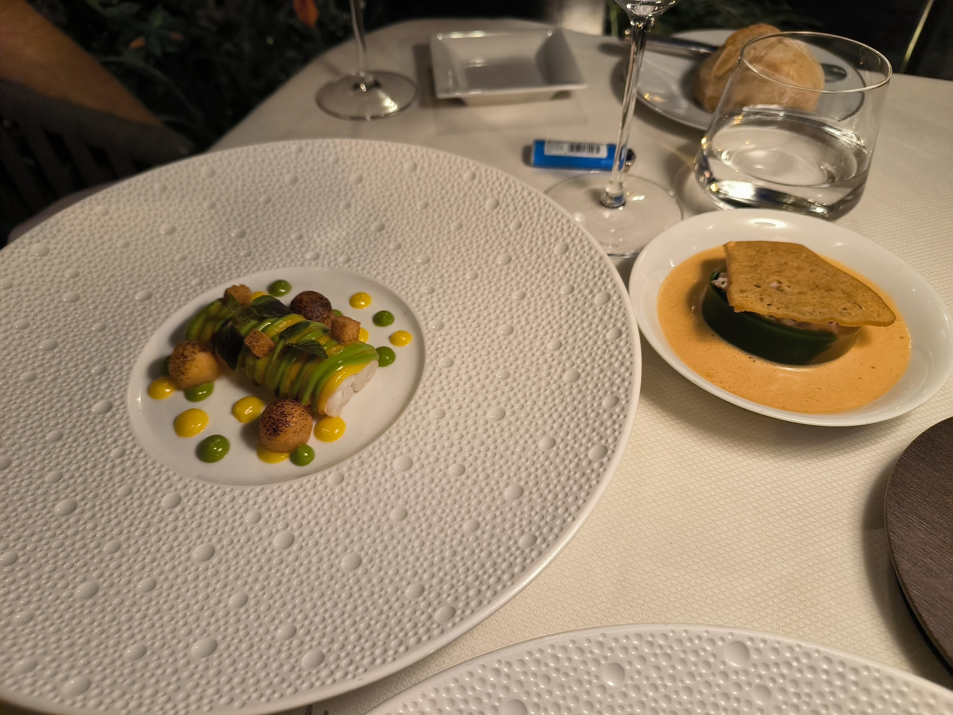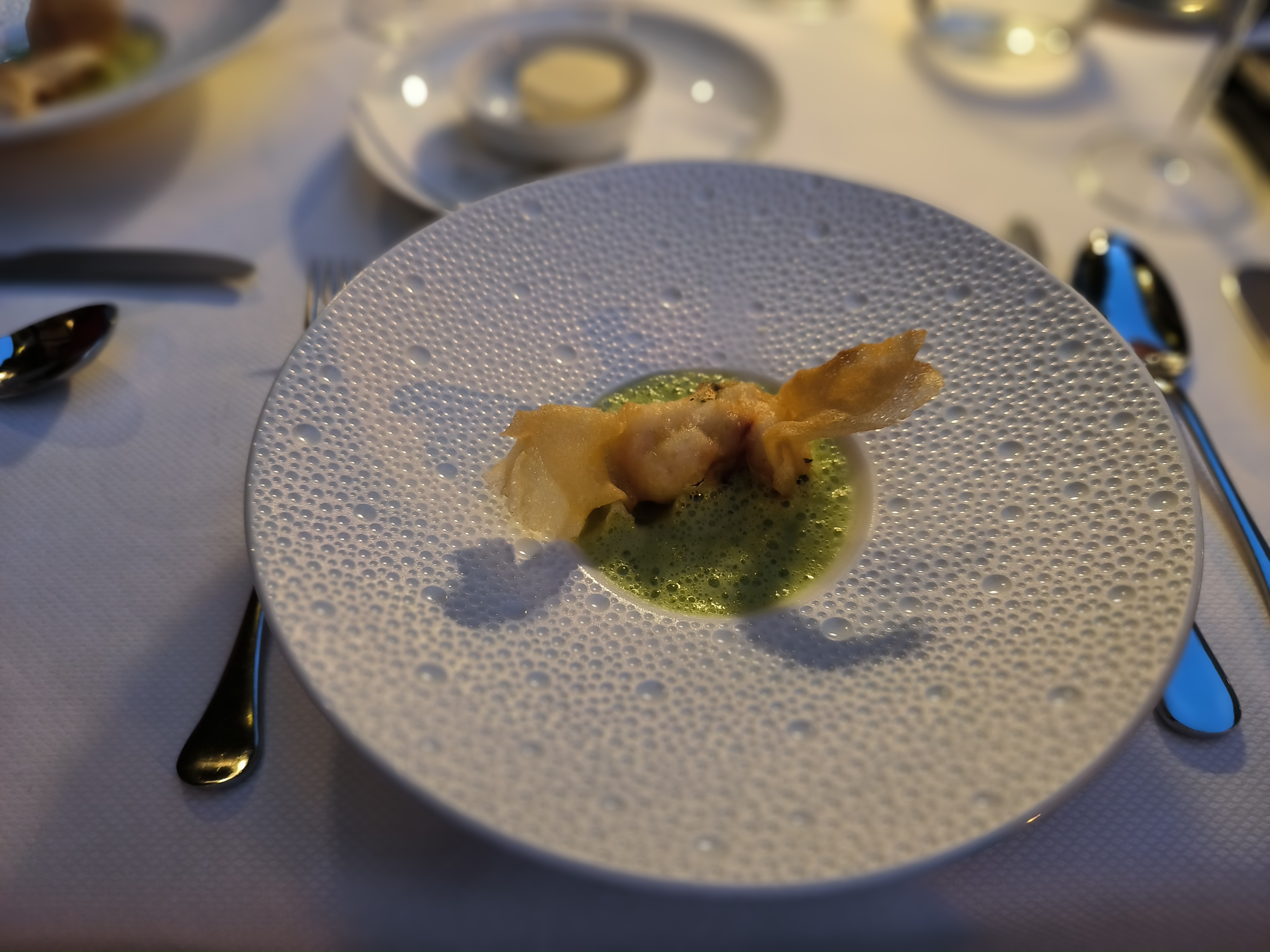 nous avons choisi le menu surprise du chef les yeux fermés. un bonheur. le tout accompagné par des vins au verre sélectionnés par le somelier. top dans un cadre super beau. final à l’open bar. une soirée mémorable