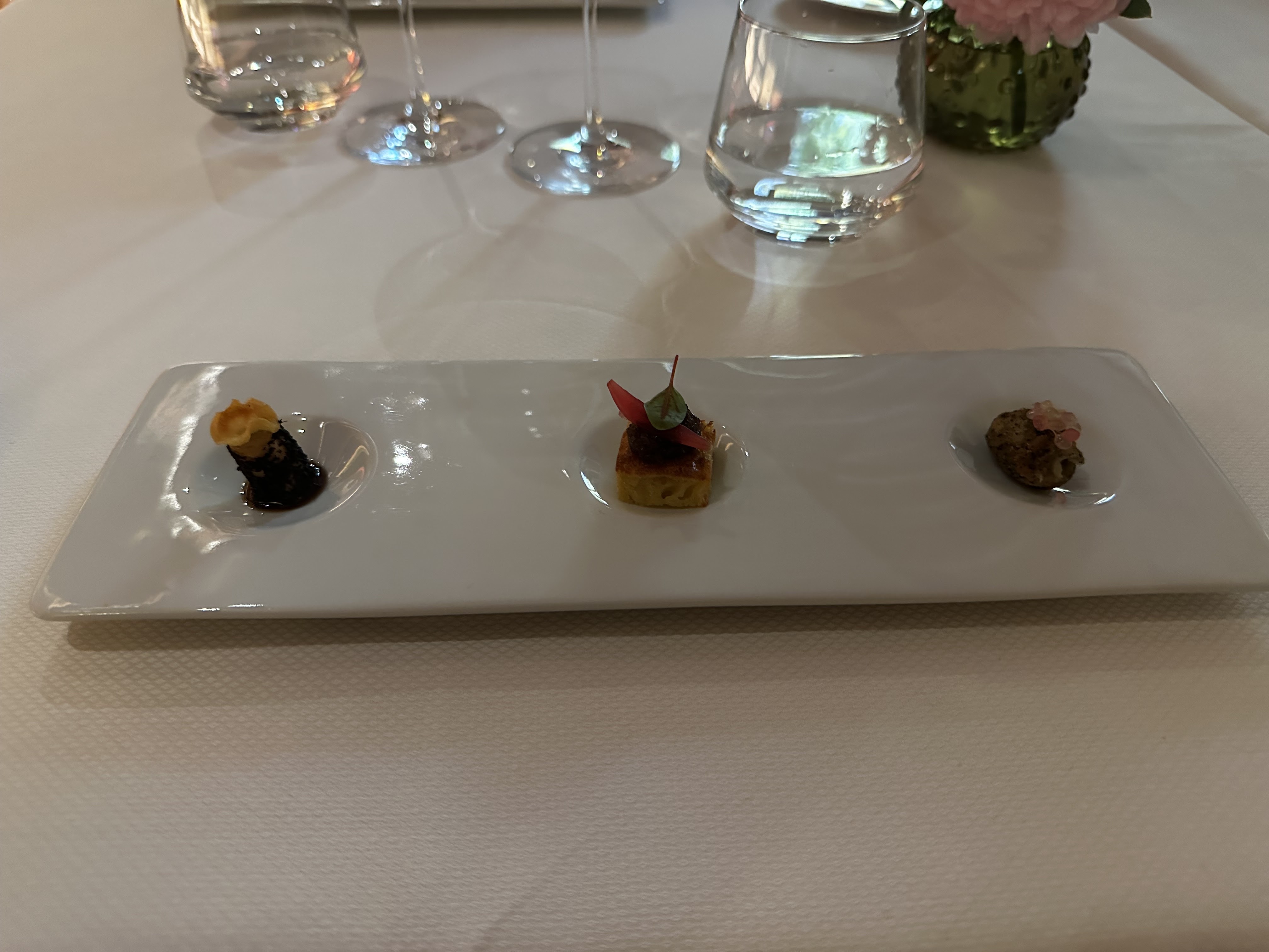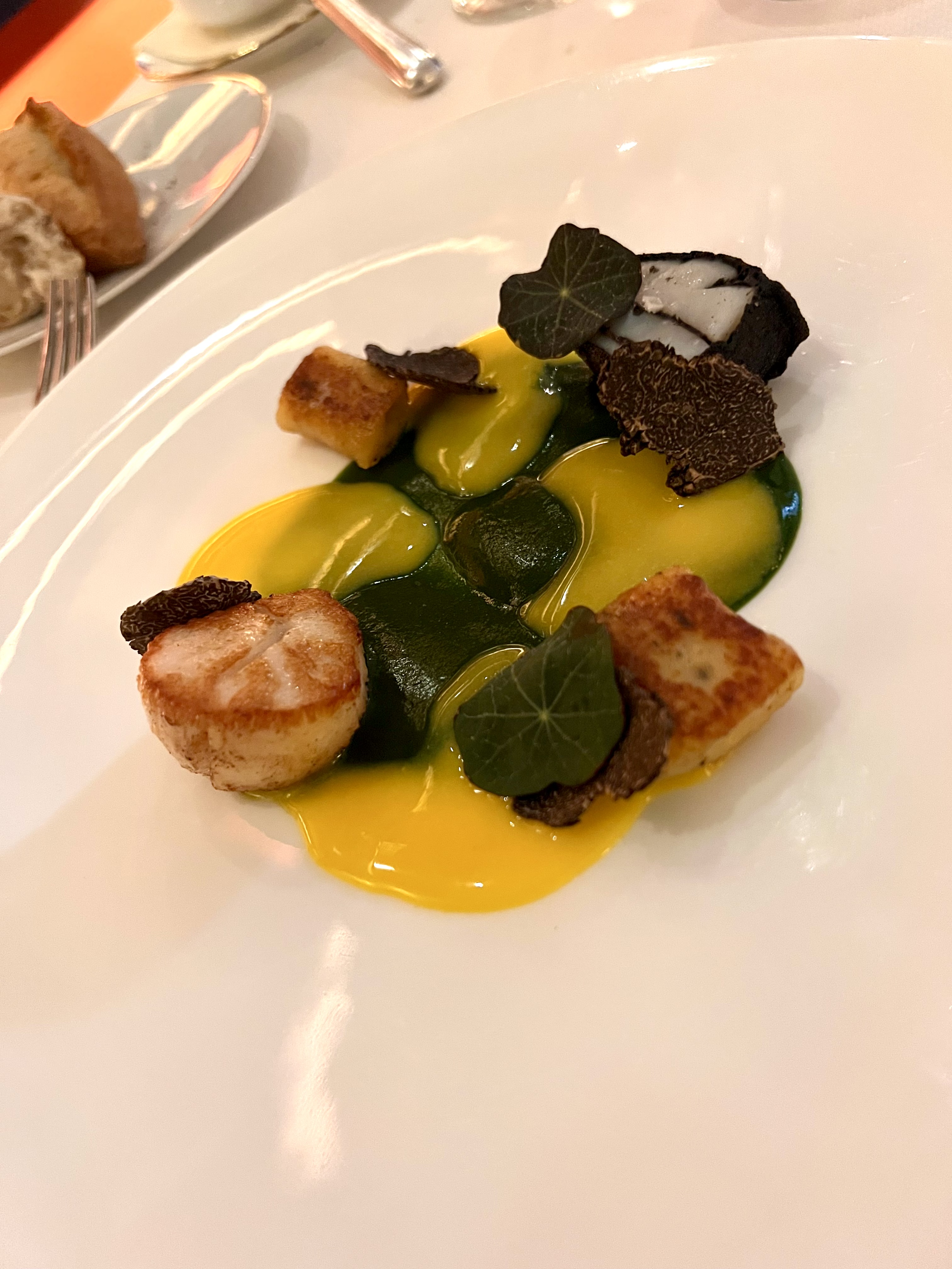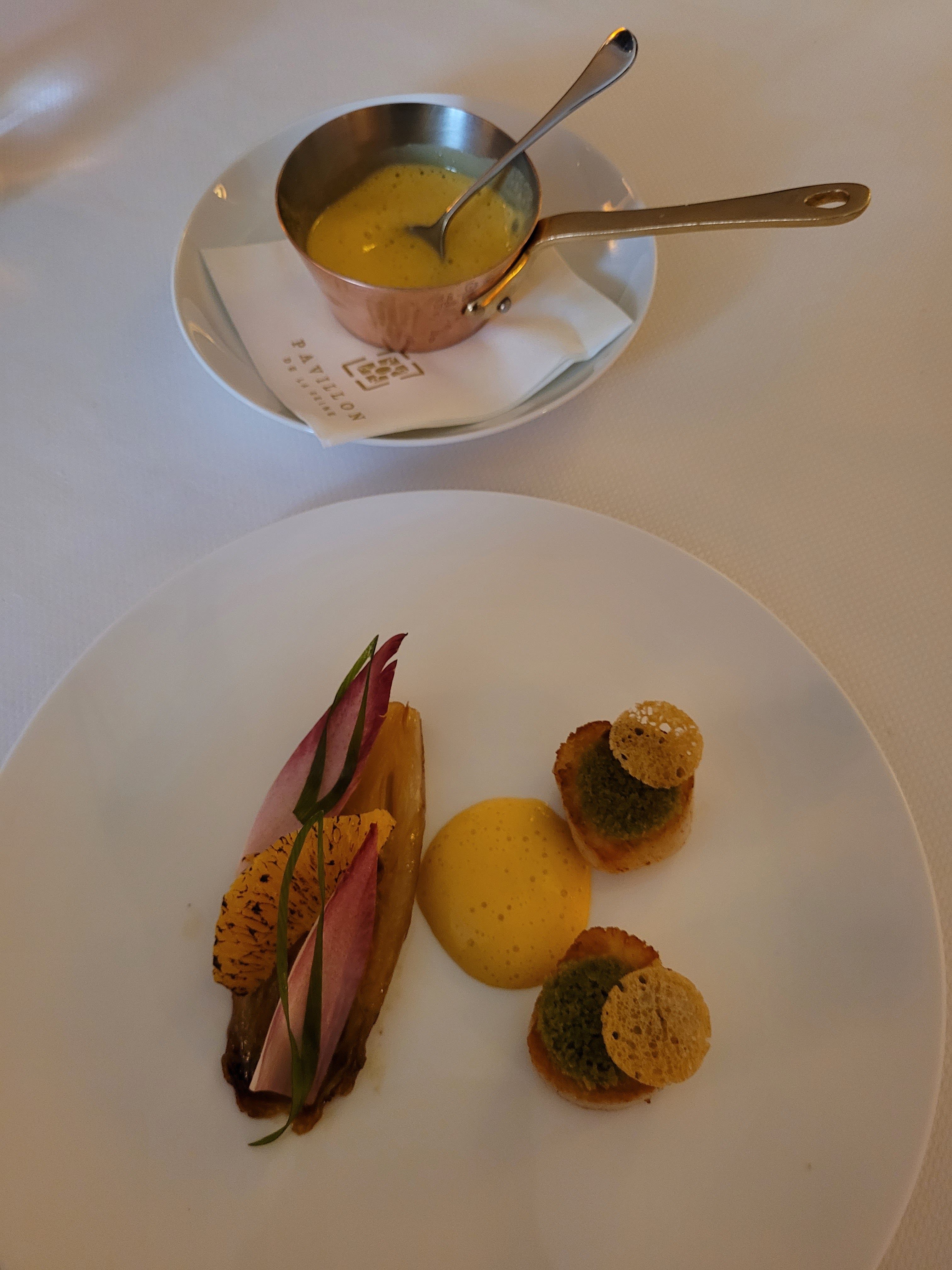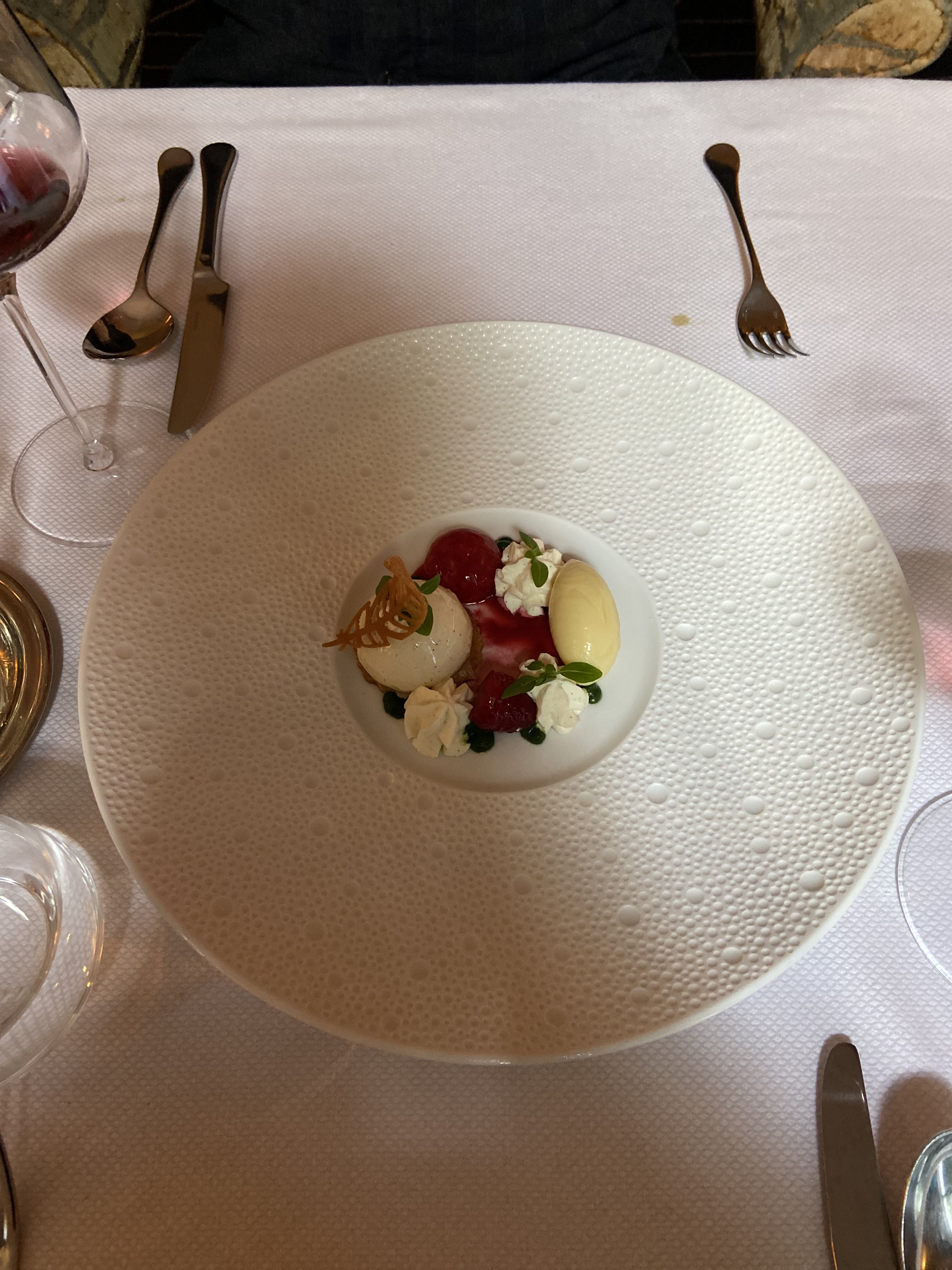 nous avons choisi le menu surprise du chef les yeux fermés. un bonheur. le tout accompagné par des vins au verre sélectionnés par le somelier. top dans un cadre super beau. final à l’open bar. une soirée mémorable