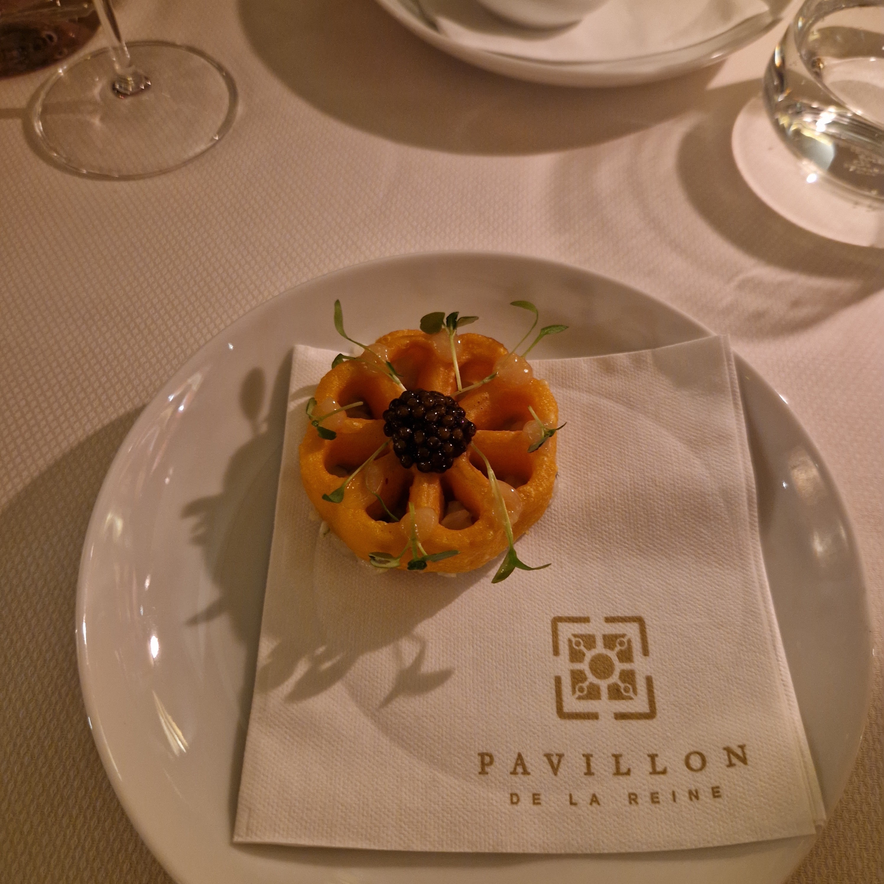 Une magnifique surprise...Dîner chez Anne, pavillon de la Reine pour mon anniversaire ! Lieu feutré, personnel au petits soins et menu surprise du chef inventif et délicieux. Une merveilleuse soirée.